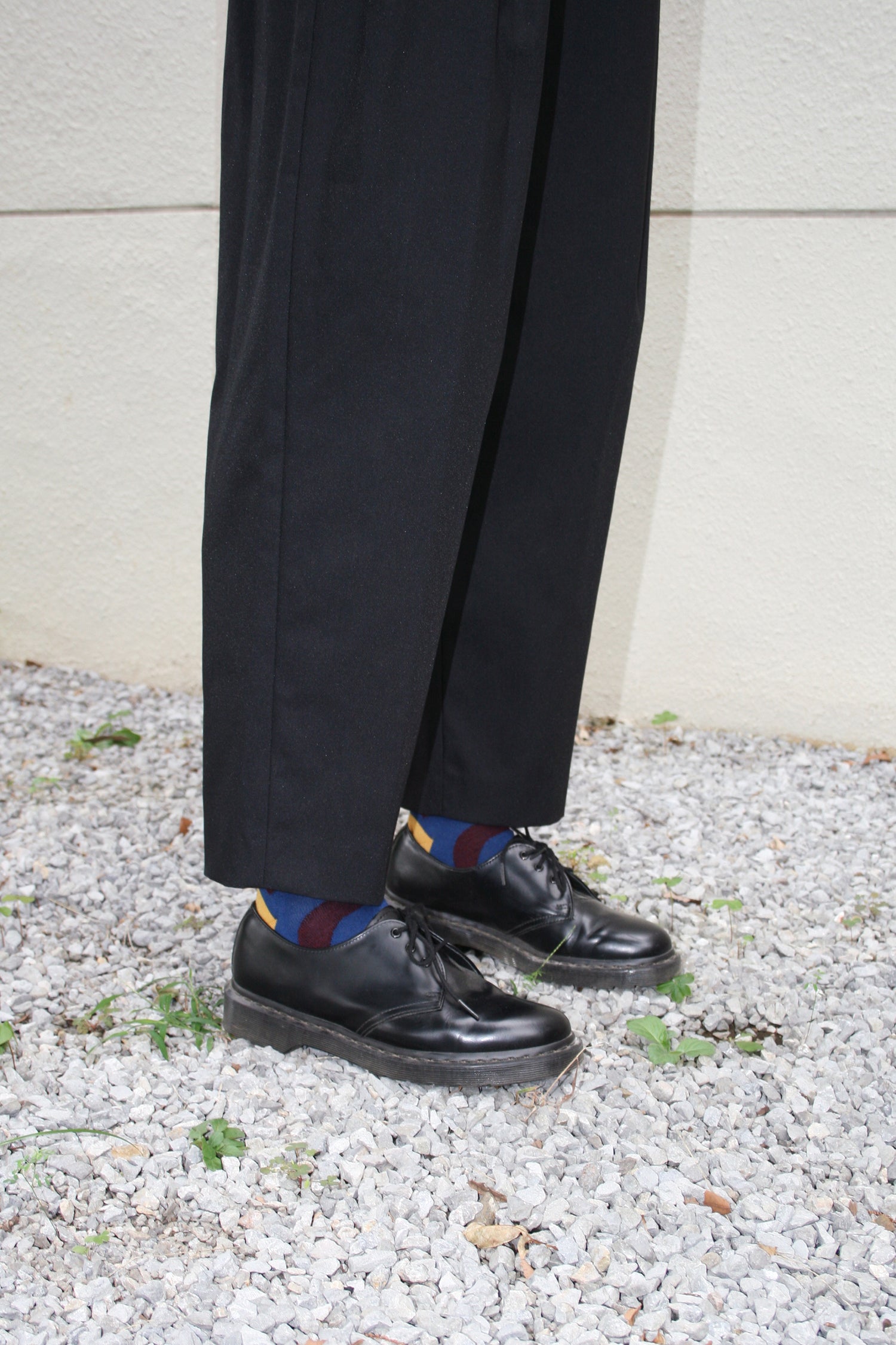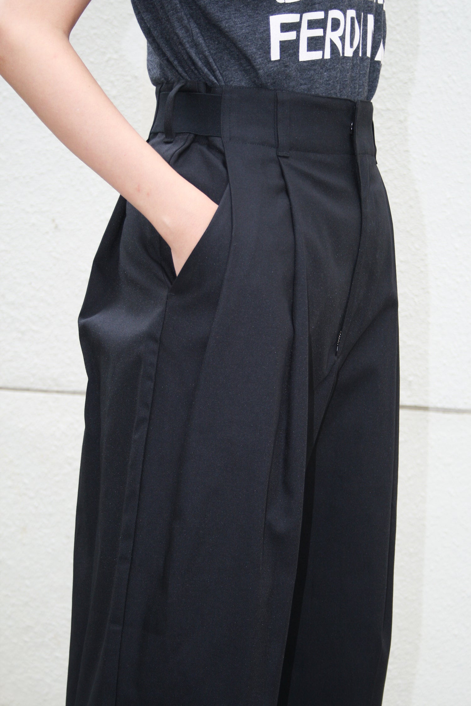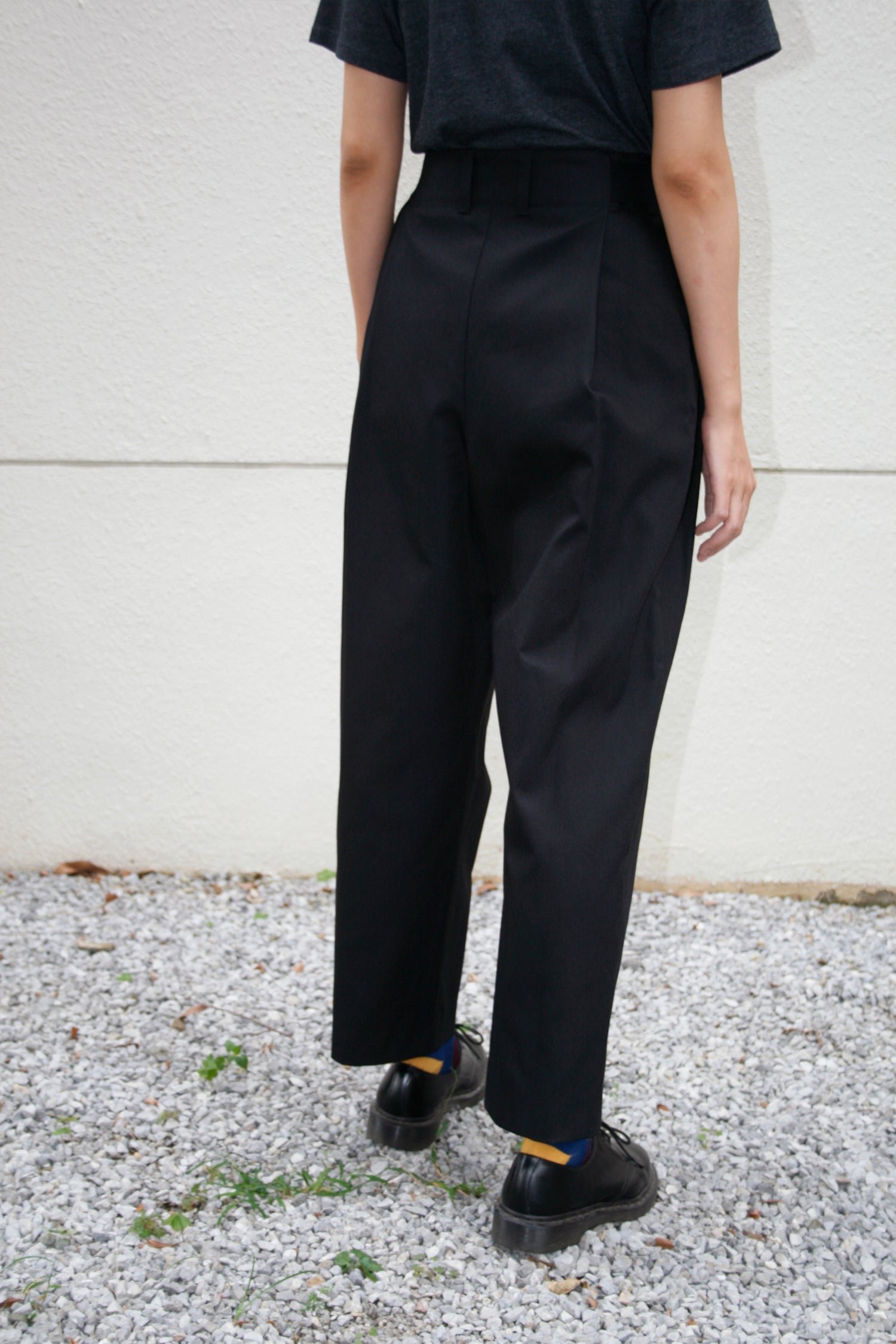 こちらは、black。サイドにゴムベルトを配した2タックパンツ。ワイドシルエットにややテーパードをかけたデザイン。適度なハリを持たせたコットンとポリエステルの交織高密度ギャバ。ユニセックスでの展開。どんなトップスとも相性抜群です。同素材のリバーシブルコート(BLACK、BROWN、OLIVE)とのセットアップもオススメです。