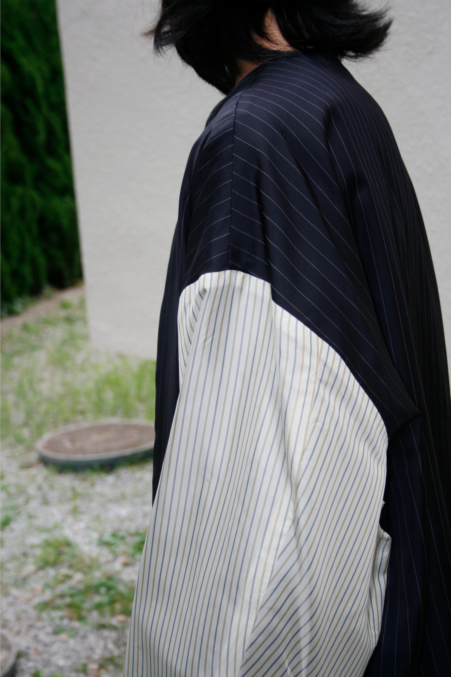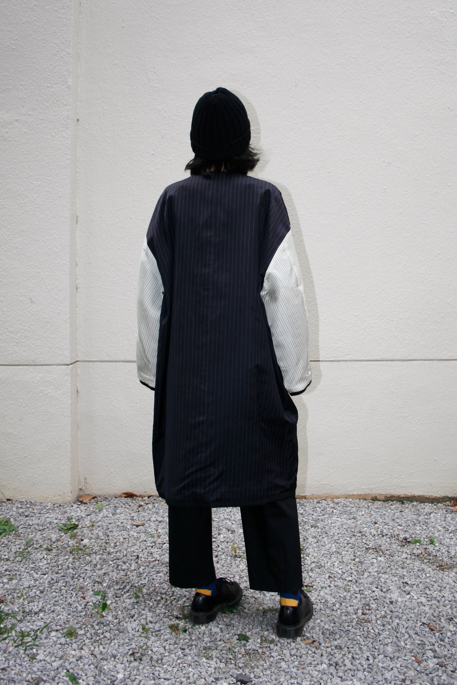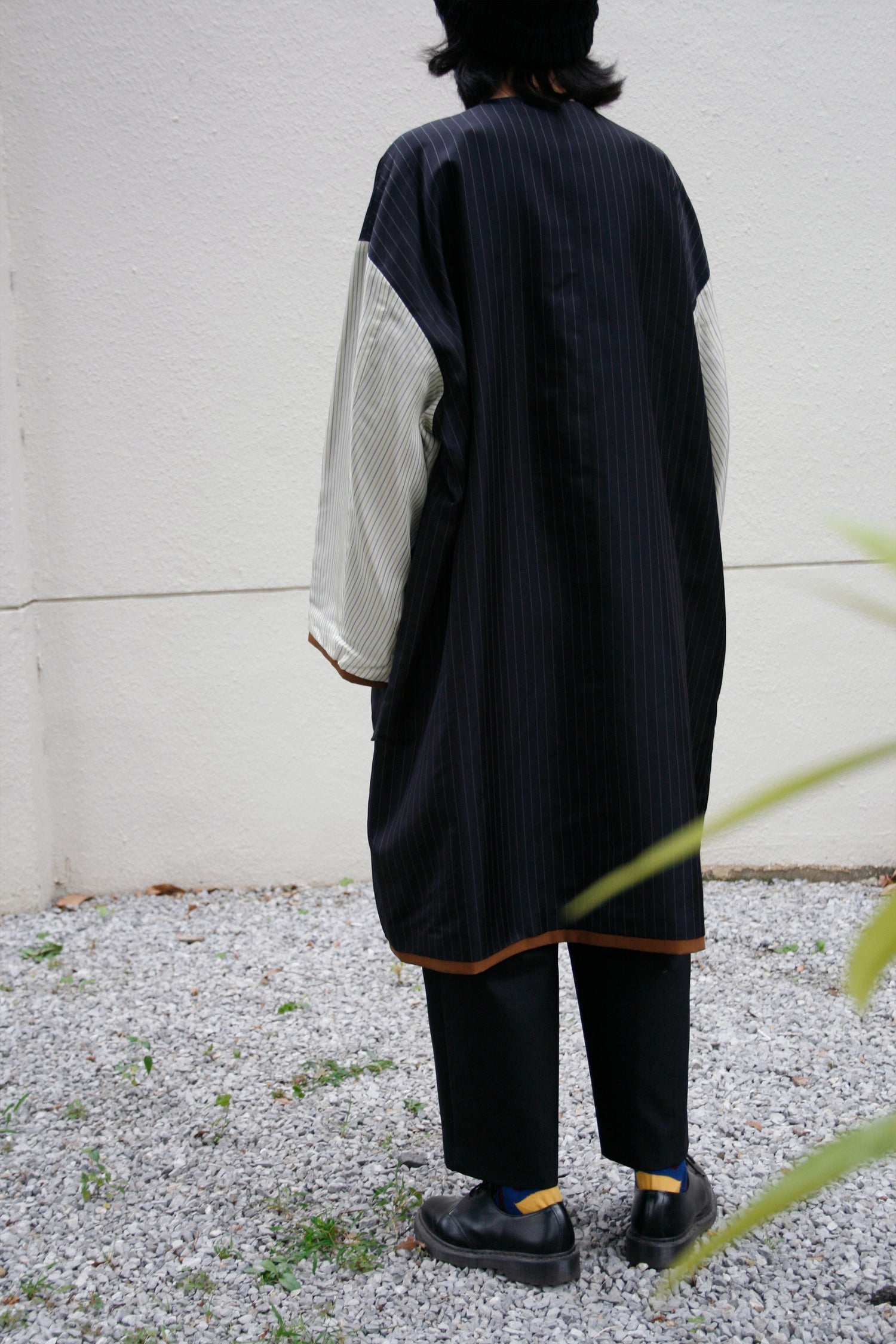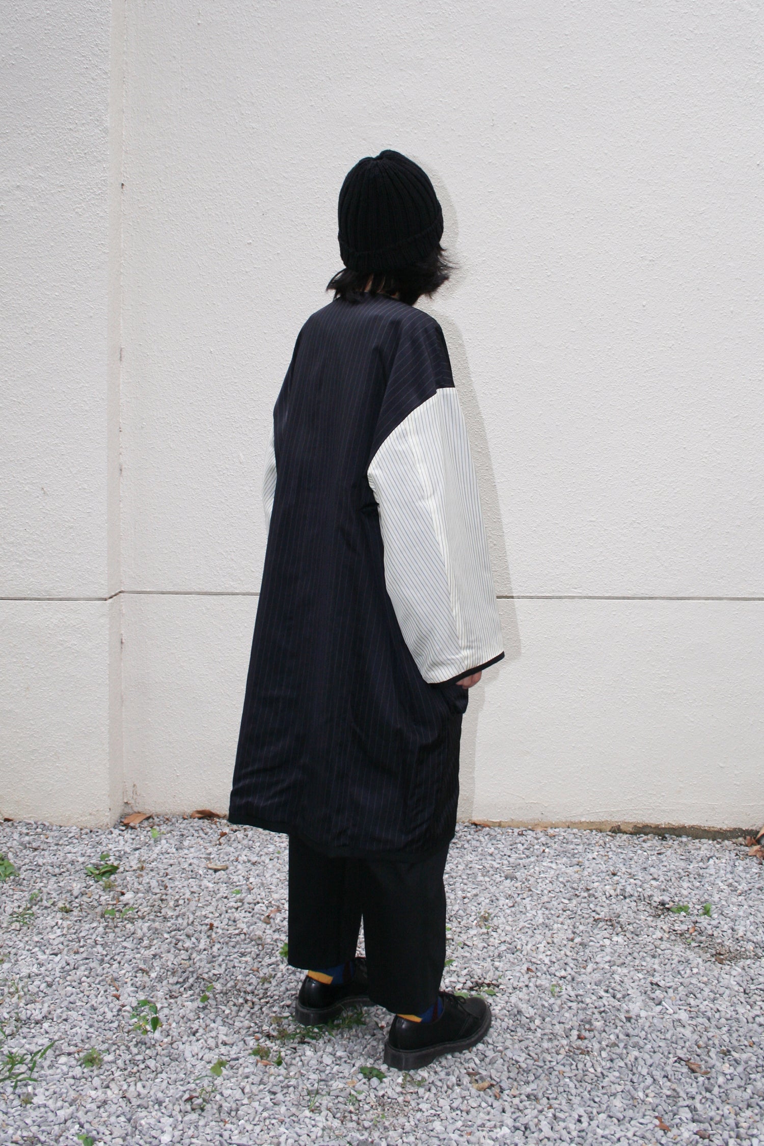 あえて表面にストライプの裏地素材を配色使用したリバーシブルコート。ストライプ生地のカラーはすべて共通になります。適度なハリを持たせたコットンとポリエステルの交織高密度ギャバ。 コートの表面にはストライプキュプラ、裏面に高密度ギャバを使用したリバーシブル仕様。 両脇にはポケットを配備しています。ゆったりとしているので、中に色々と着込むこともでき、秋から春にかけて活躍してくれる一着。ユニセックスでの展開。同素材のタックパンツとのセットアップもオススメです。