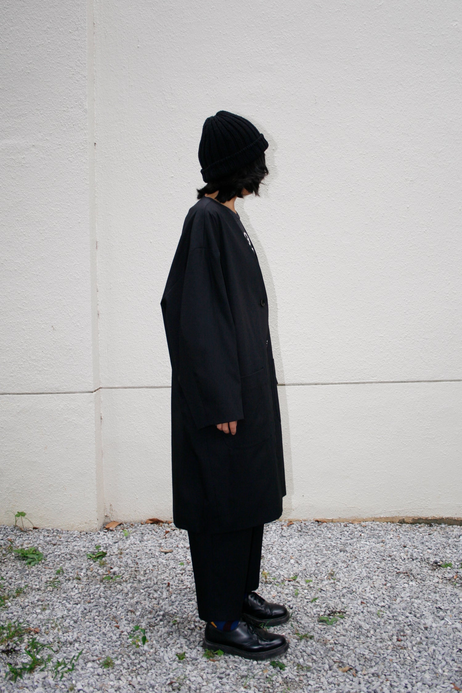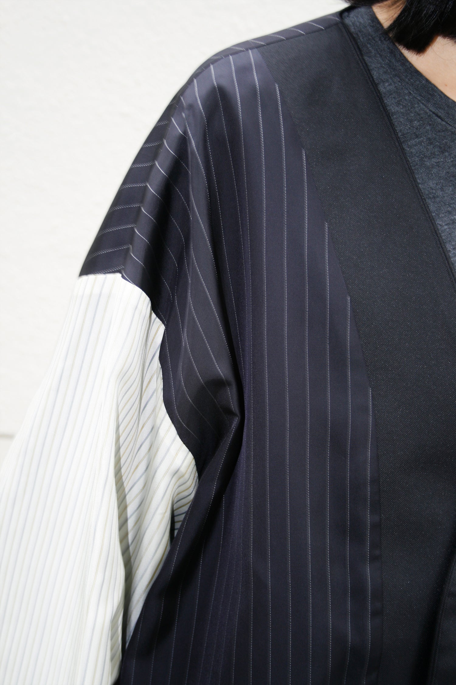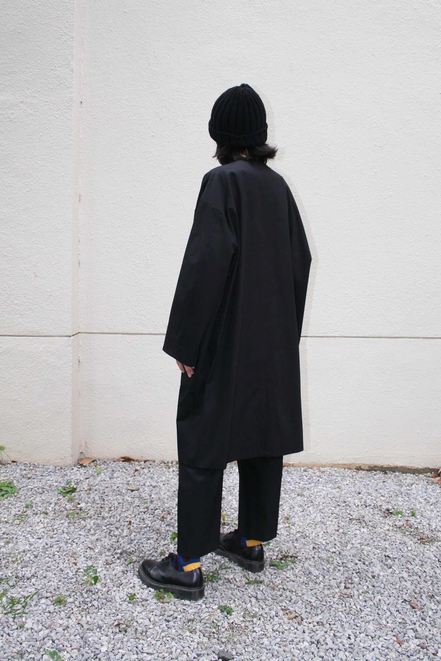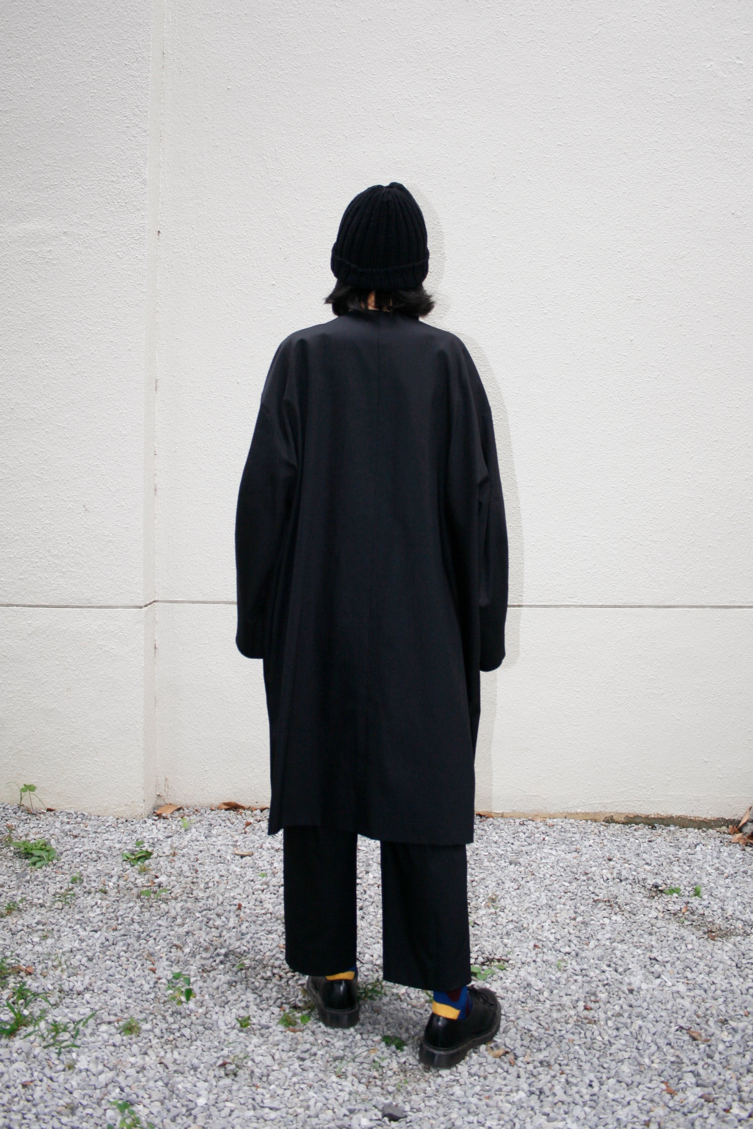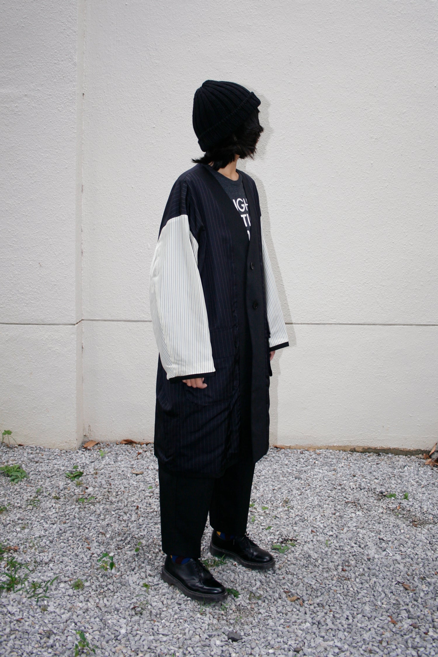 あえて表面にストライプの裏地素材を配色使用したリバーシブルコート。ストライプ生地のカラーはすべて共通になります。適度なハリを持たせたコットンとポリエステルの交織高密度ギャバ。 コートの表面にはストライプキュプラ、裏面に高密度ギャバを使用したリバーシブル仕様。 両脇にはポケットを配備しています。ゆったりとしているので、中に色々と着込むこともでき、秋から春にかけて活躍してくれる一着。ユニセックスでの展開。同素材のタックパンツとのセットアップもオススメです。