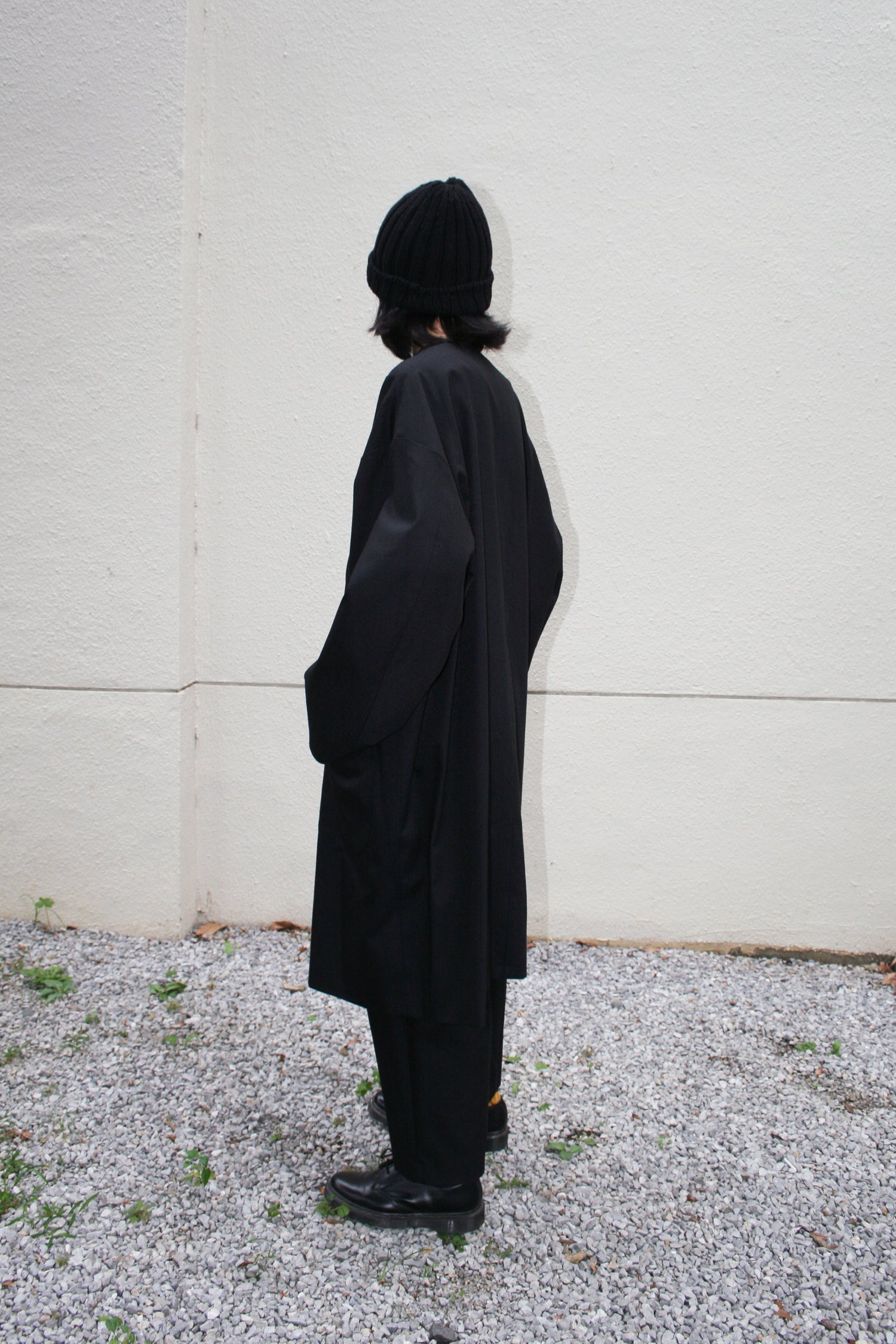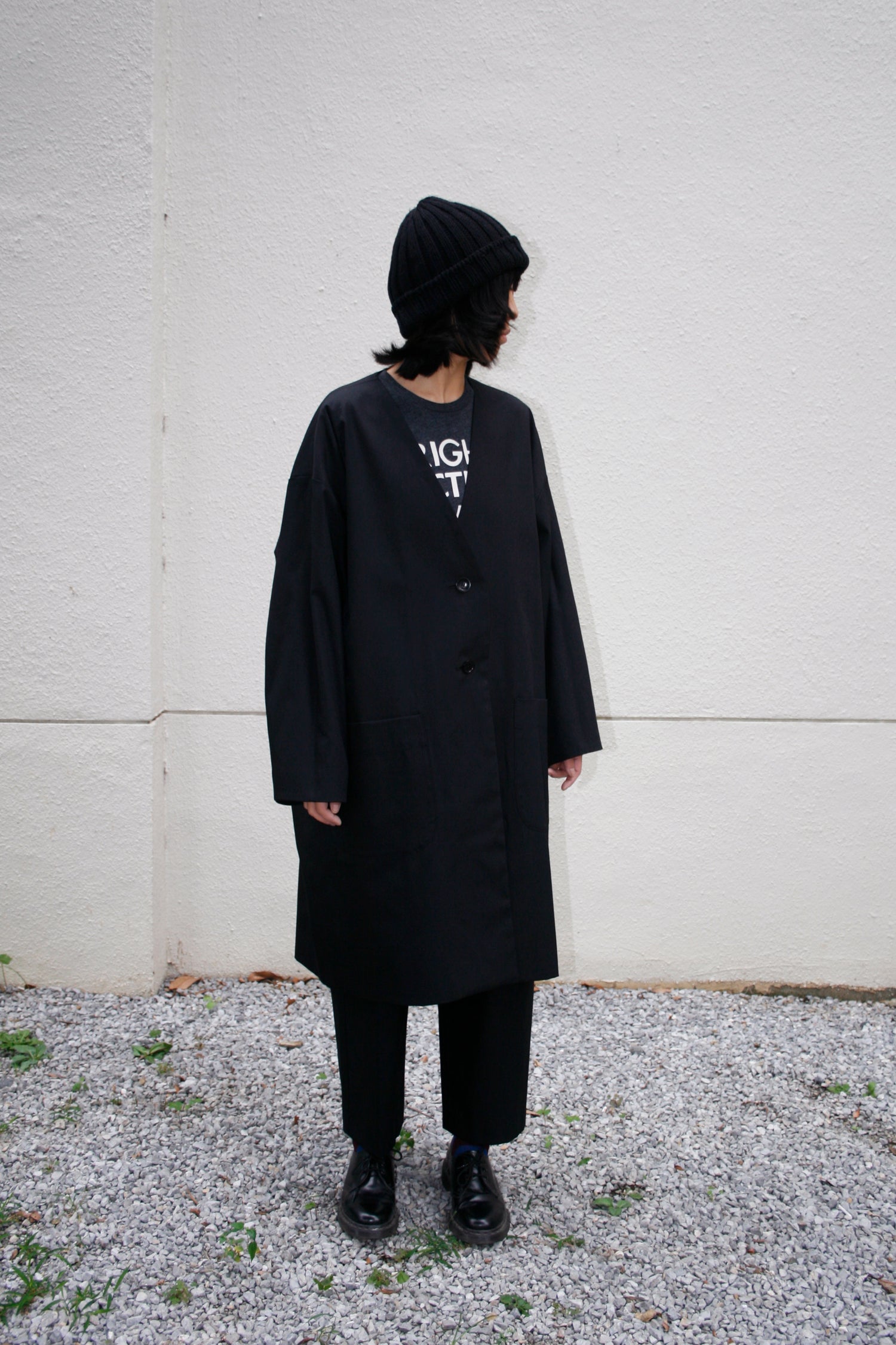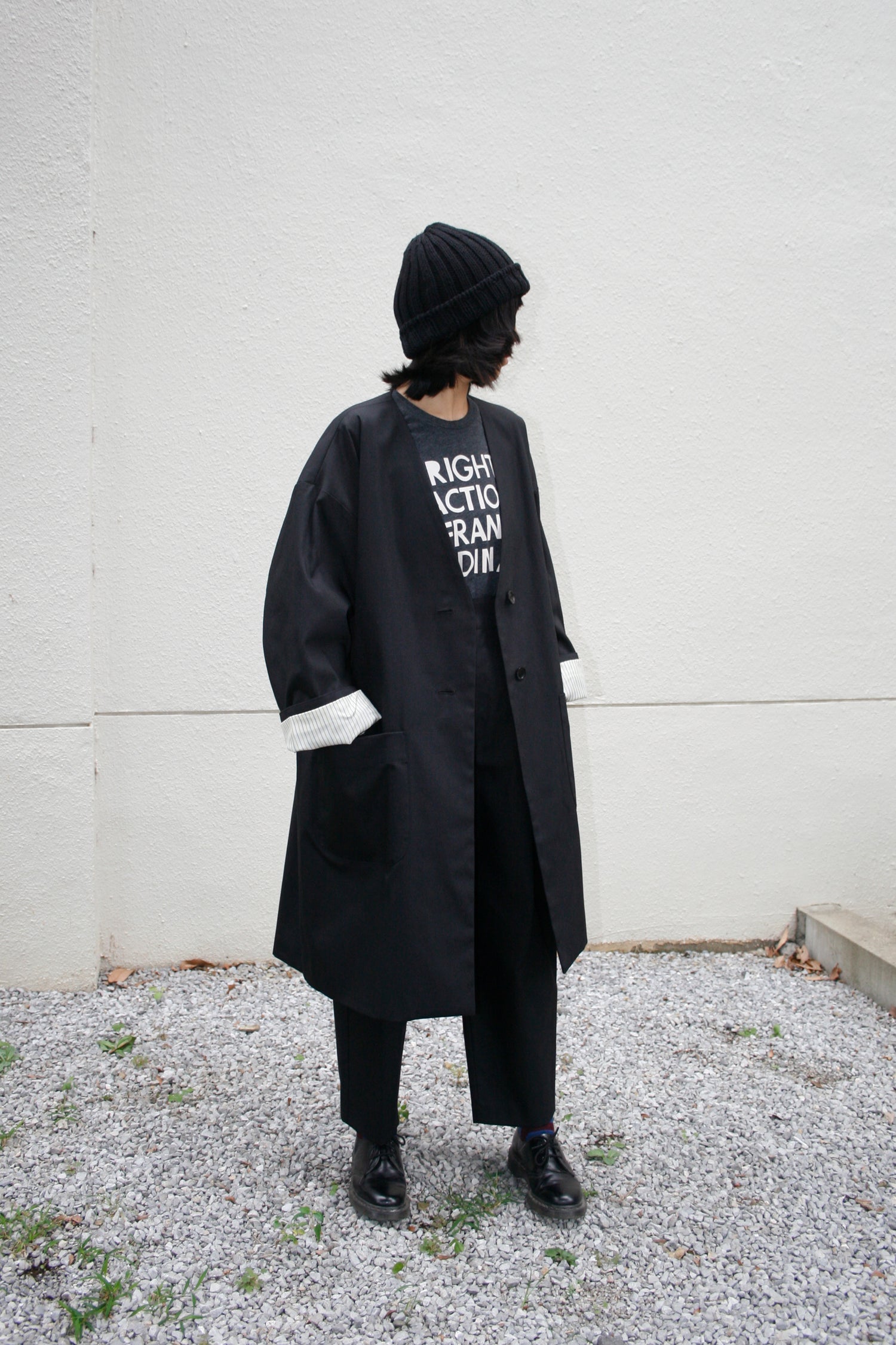 Completely reversible to give you two big coat looks in one. This unisex coat is designed to be oversized, with generous wide cut sleeves. Produced in a high-quality cotton and polyester blend fabric (high-quality gabardine) and comes in three colourways, features striped lining material on the surface, two button closures and big pockets on both sides. You can playfully wear it from Autumn to Spring. Please also enjoy our favourite gabardine pants in black.