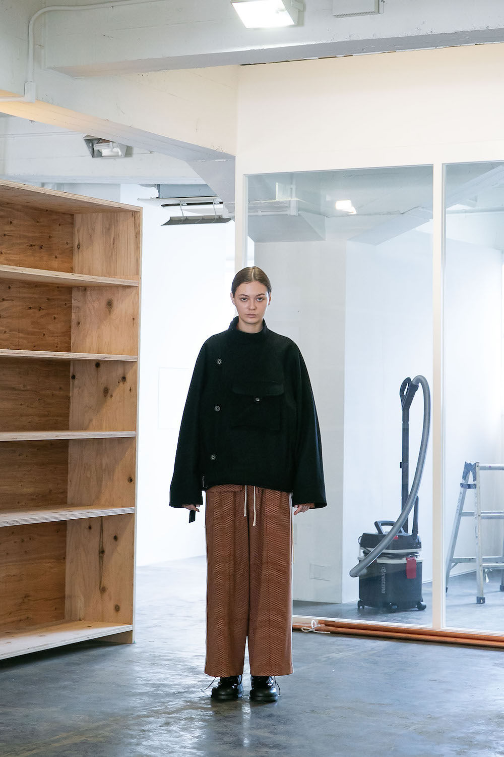 コットンの肌触りの良さとポリエステルの機能性を活かした、ジャガードチェック素材のワイドイージートラウザーズです。4種類の先染め糸を使用し、柄に奥行きが出るように仕上げたジャーガードです。クラシカルな柄行は色使いを工夫し遊び心を持たせた生地となります。 ウエストのドローコードでサイズ調節可能なワイドシルエットです。両サイドにスラッシュポケット、バックにはスクエア型ポケットが付属。 丈夫で長くご愛用いただけます。