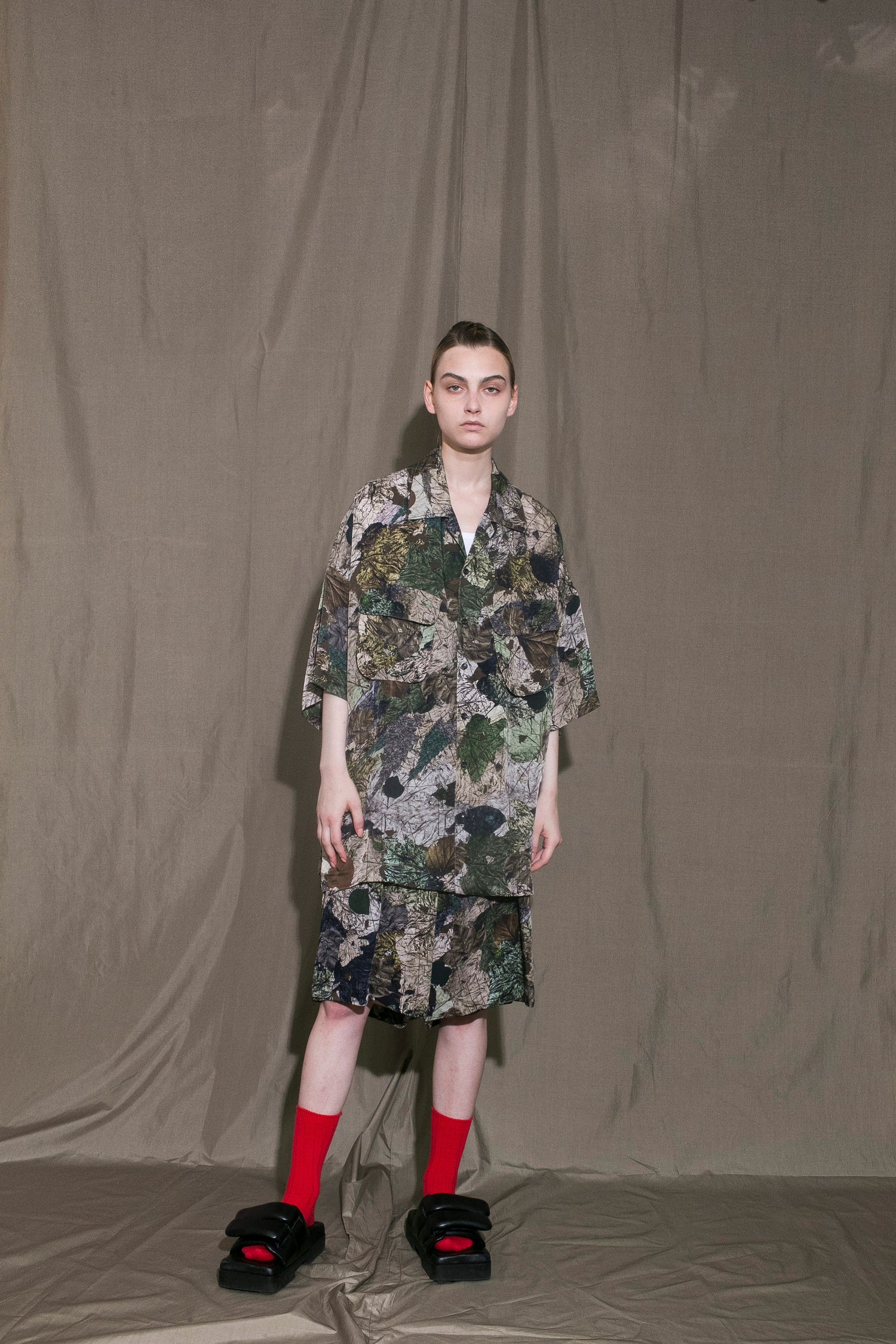 オリジナルカモ柄を使用した、開襟シャツ。キュプラ特有の落ち感も特徴です。よく見ると意外なものを見つけられるかも?生地の取り方により居ない場合もあります。是非探してみてください。(カモフラ生地共通です)。オリジナルカモ柄をプリントしたのち、タンブラー加工で毛羽をもたせ、ソフトな風合いに仕上げた素材。セットアップのキュプラショーツと合わせても違和感なし。