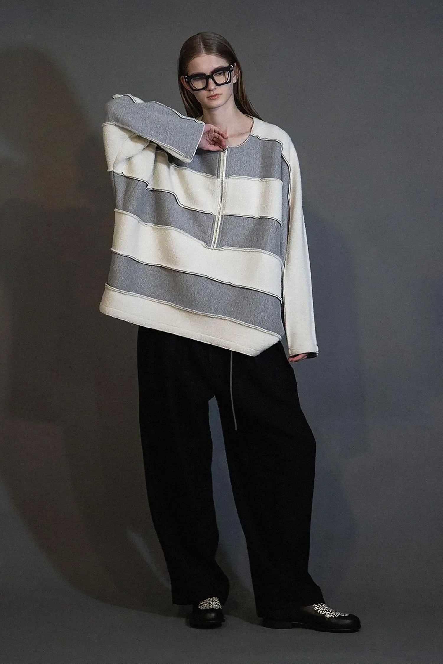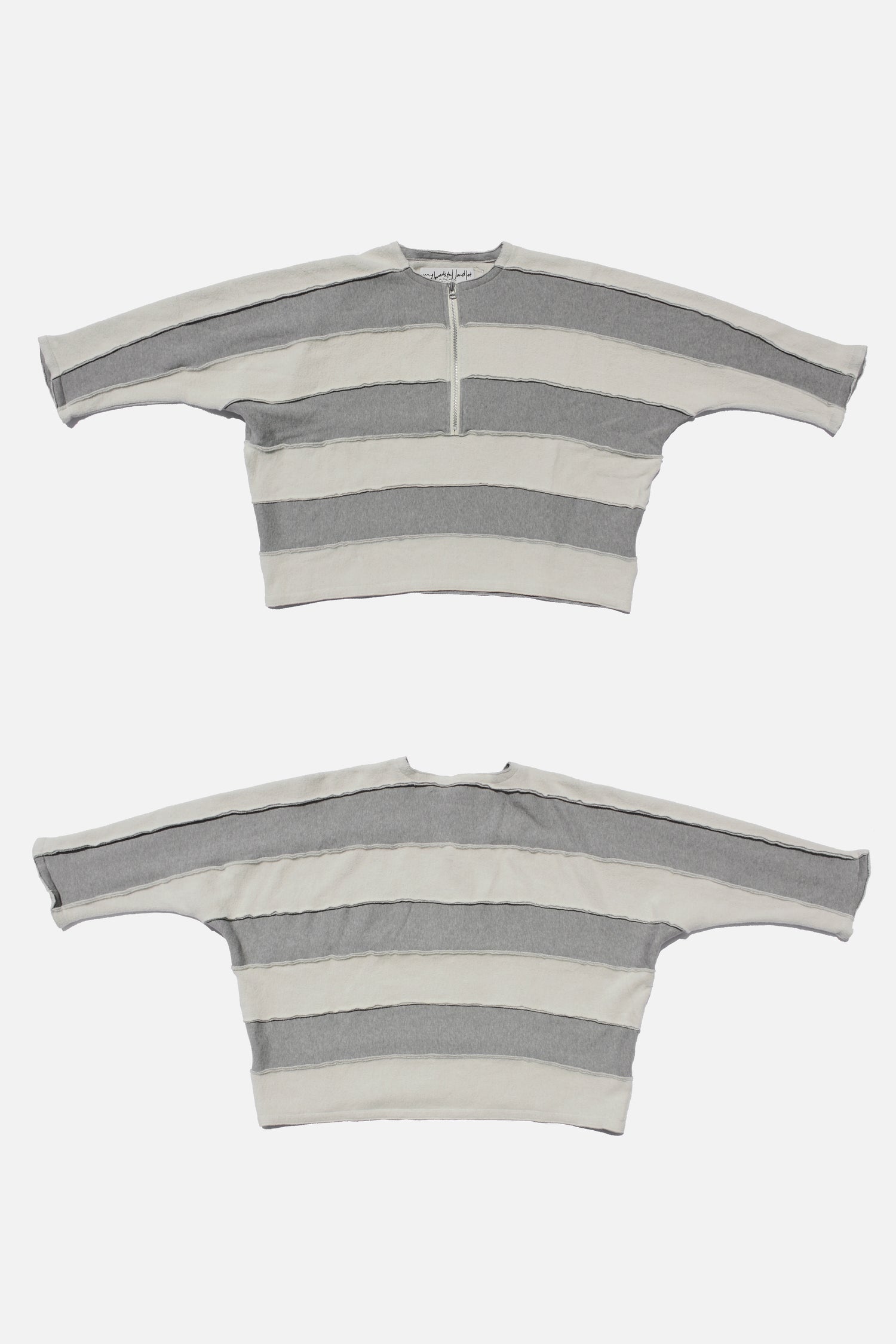 Half-zip crewneck pullover. Brushed inner fleece with a napped finish for soft texture and reduced shedding. Wide, relaxed silhouette with natural drape. Unisex, refined.