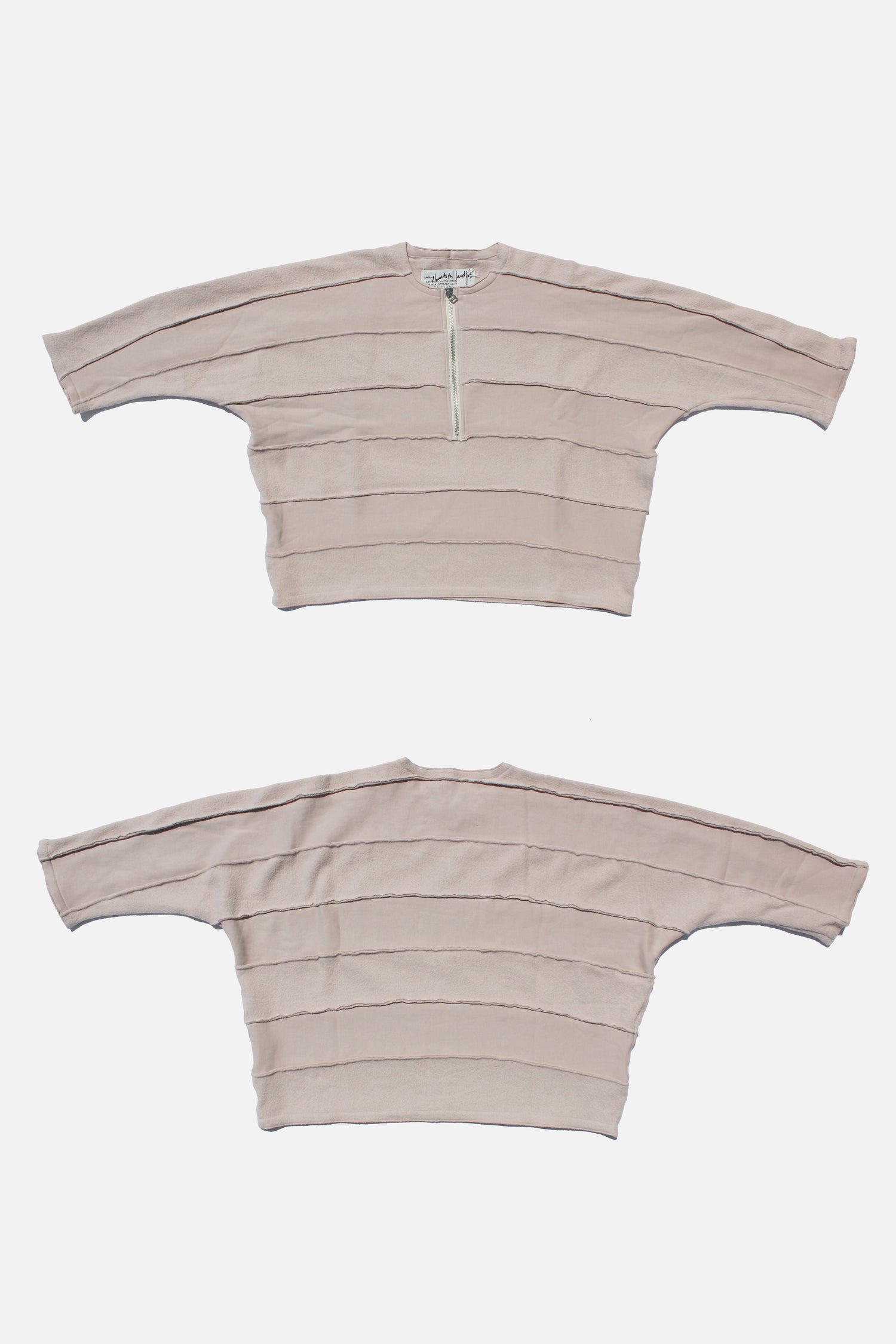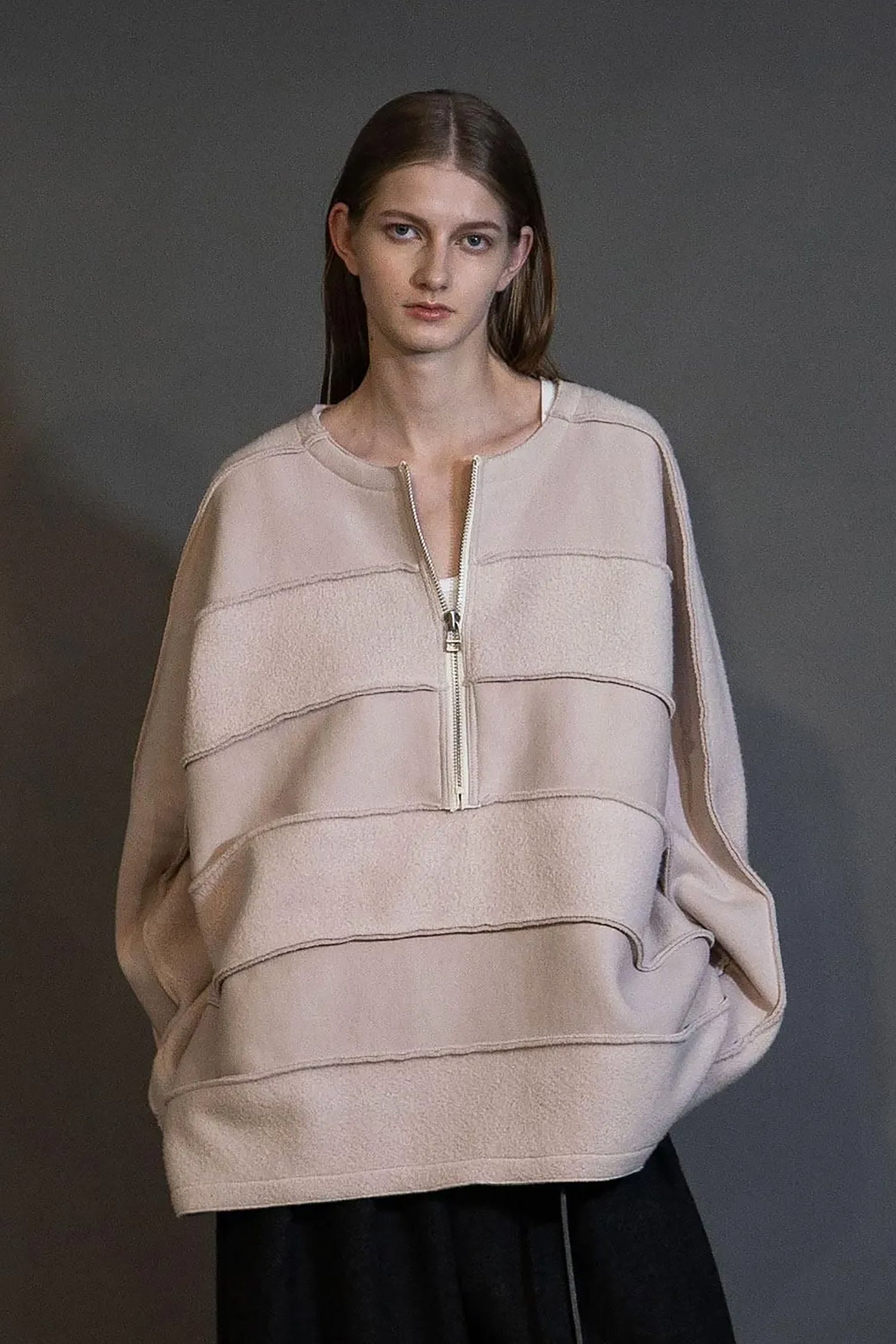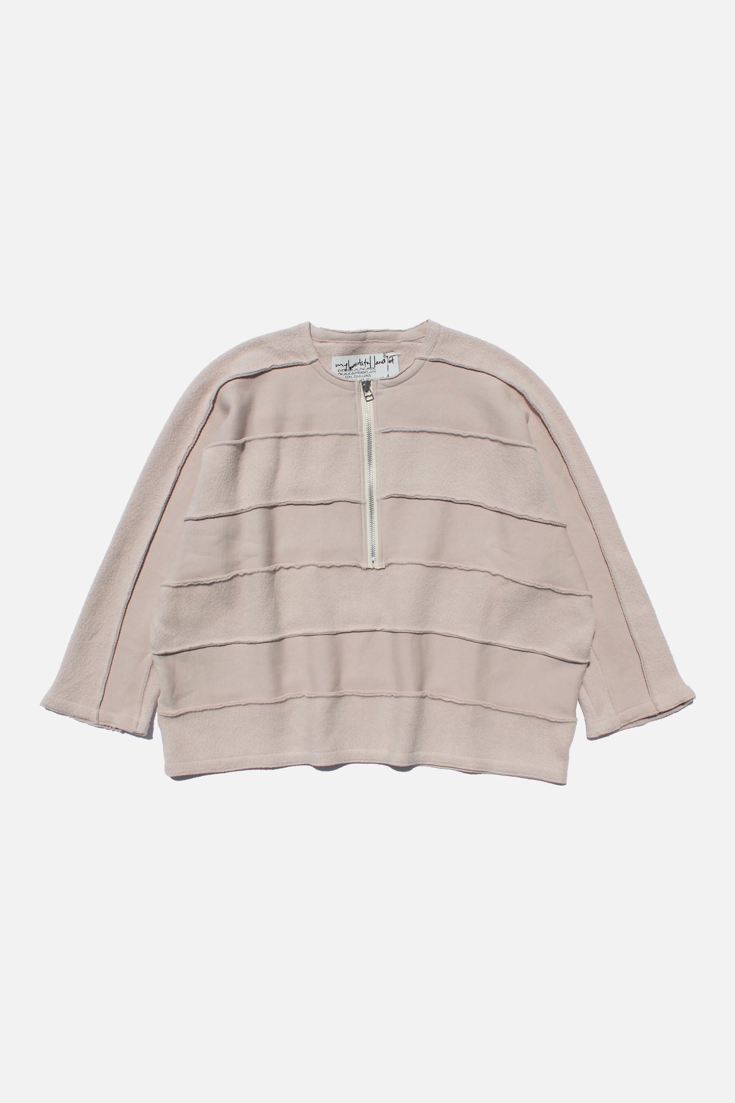 Half-zip crewneck pullover. Brushed inner fleece with a napped finish for soft texture and reduced shedding. Wide, relaxed silhouette with natural drape. Unisex, refined.