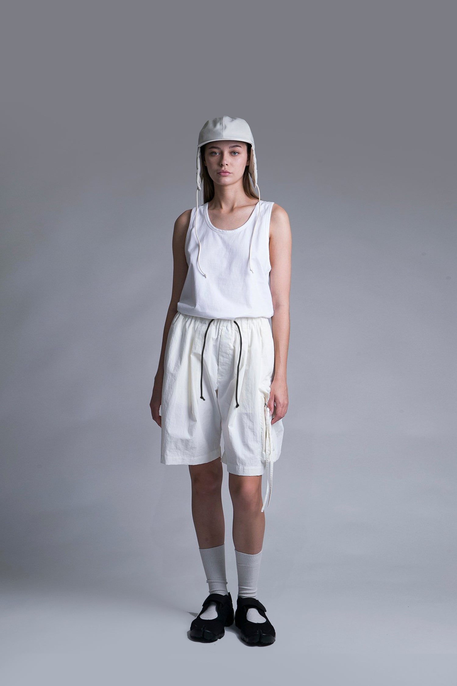 m.b.l定番のショートパンツです。コットンライクなナイロン100%のTAFFETA生地は紫外線ブロック・撥水性・防風が付与された機能性素材となります。コットンライクで適度なハリ感があり、マットな表情が特徴な素材です。薄手で涼しげな素材、夏に向けてもおすすめです。ユニセックスでの展開。同素材のbigポケットシャツとのセットアップもオススメです。こちらは、Off White。