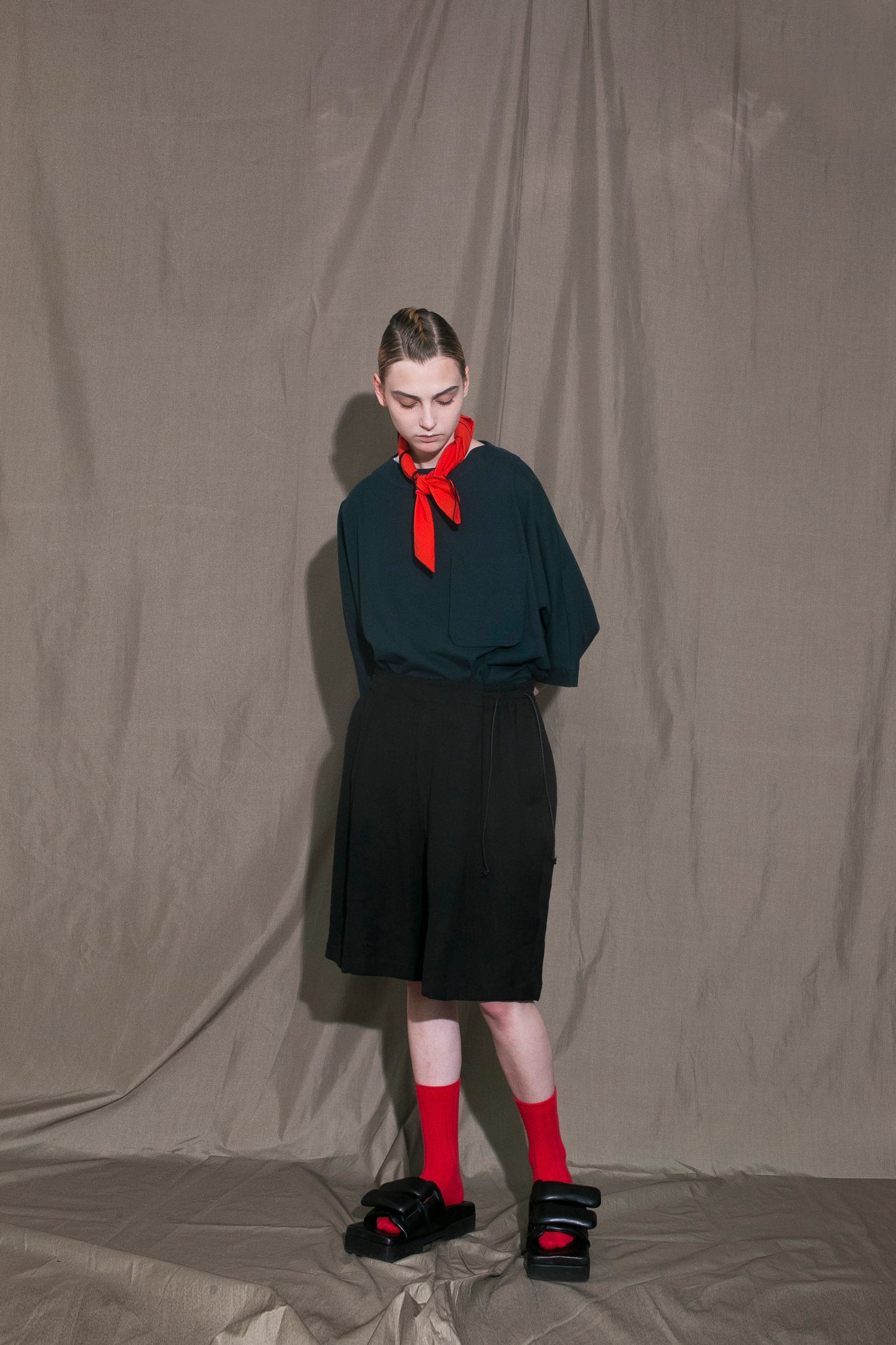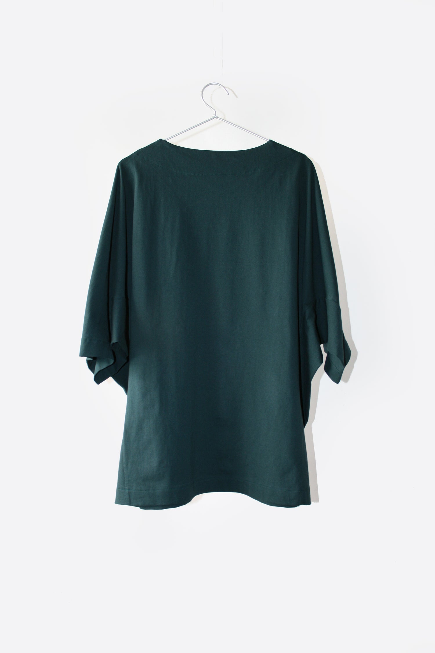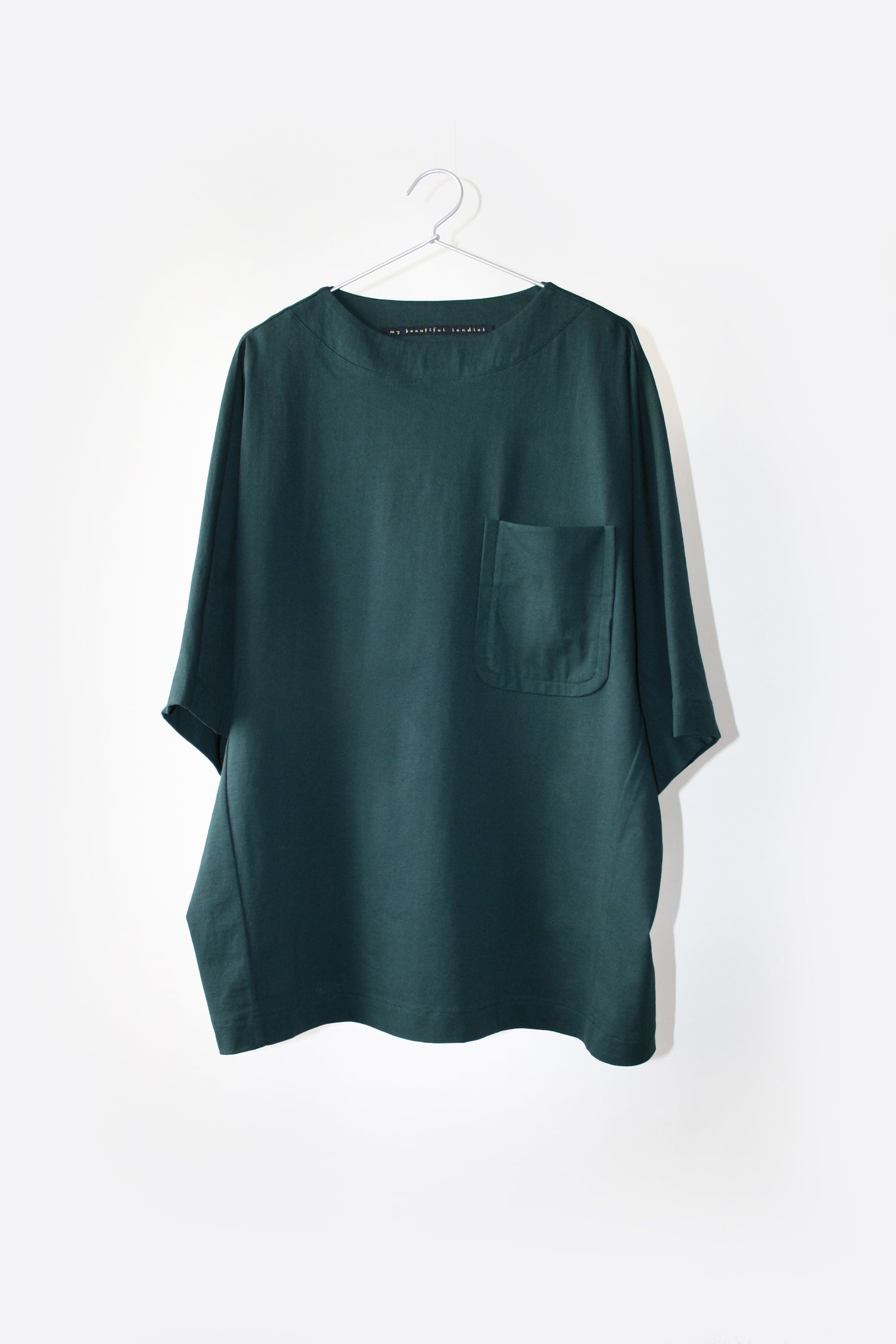 Using the original softer and warmer cotton but with variations in pocket and collar, the t-shirt are given an appearance of super wide silhouette in dolman sleeves with lower armholes. The front patch pocket is inserted on reaching balance as an approach. For the people with big interest in my beautiful landlet’s oversized fitting and breathable fabric.