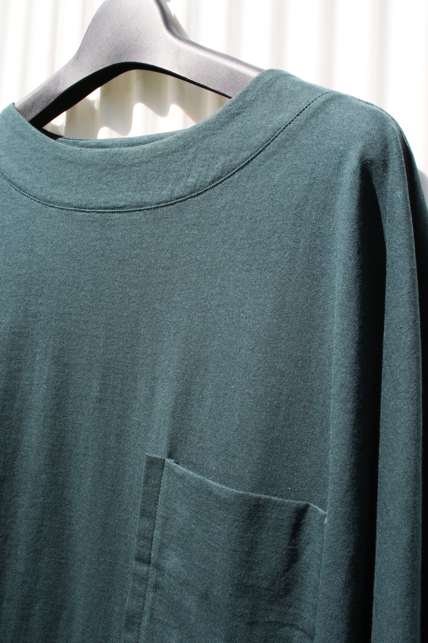 ドルマンタイプのシルエットが特徴のTシャツ。立体的に張り付けた胸ポケットがアクセントに。吸湿性、速乾性に優れたオープンエンド糸を使用した度詰め天竺素材。