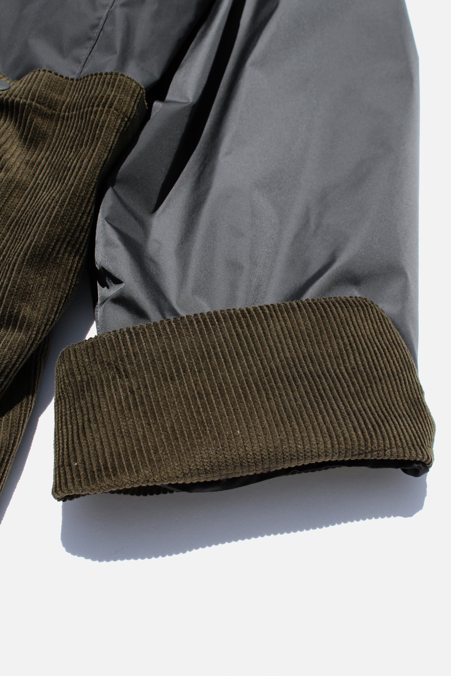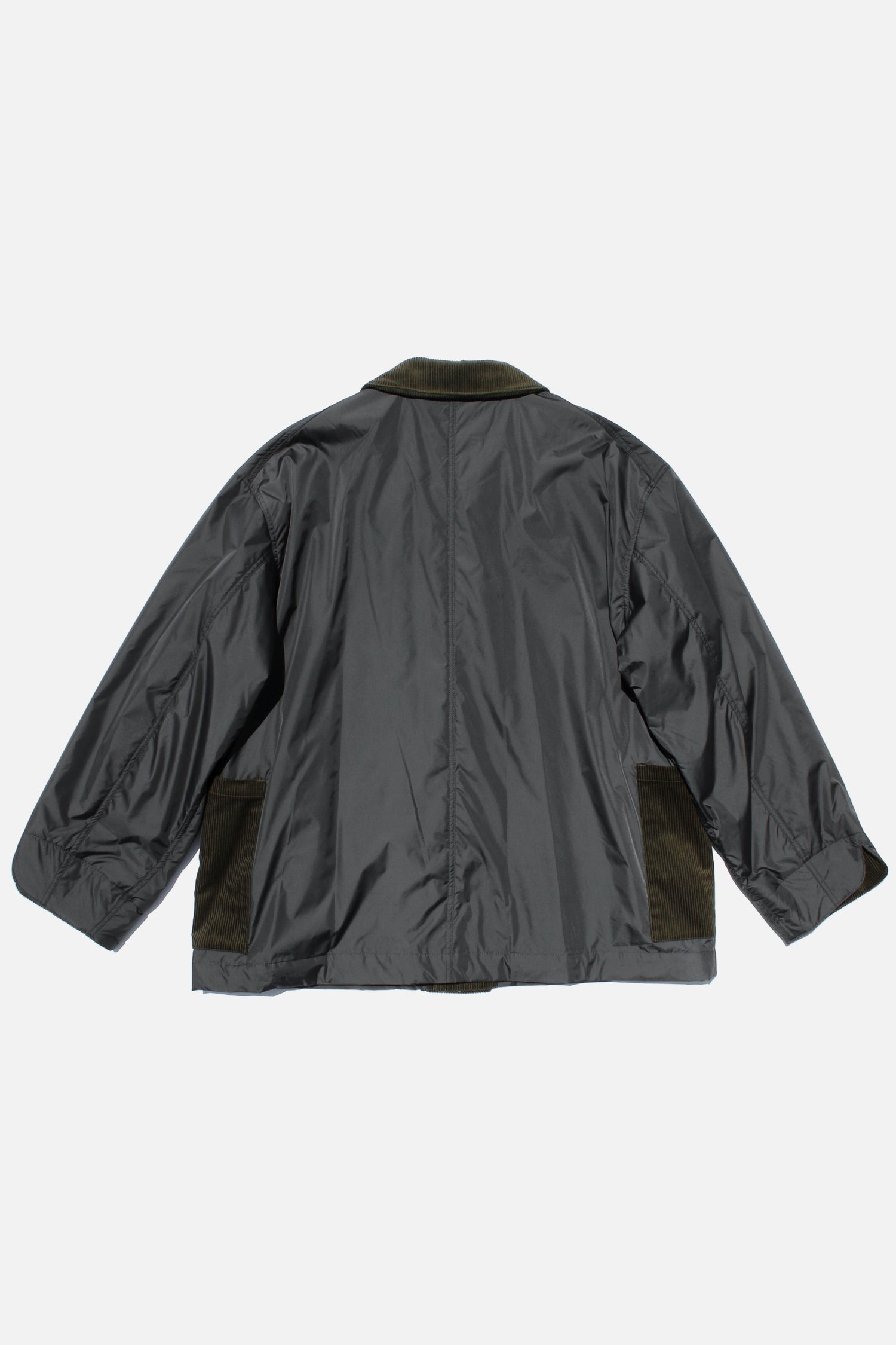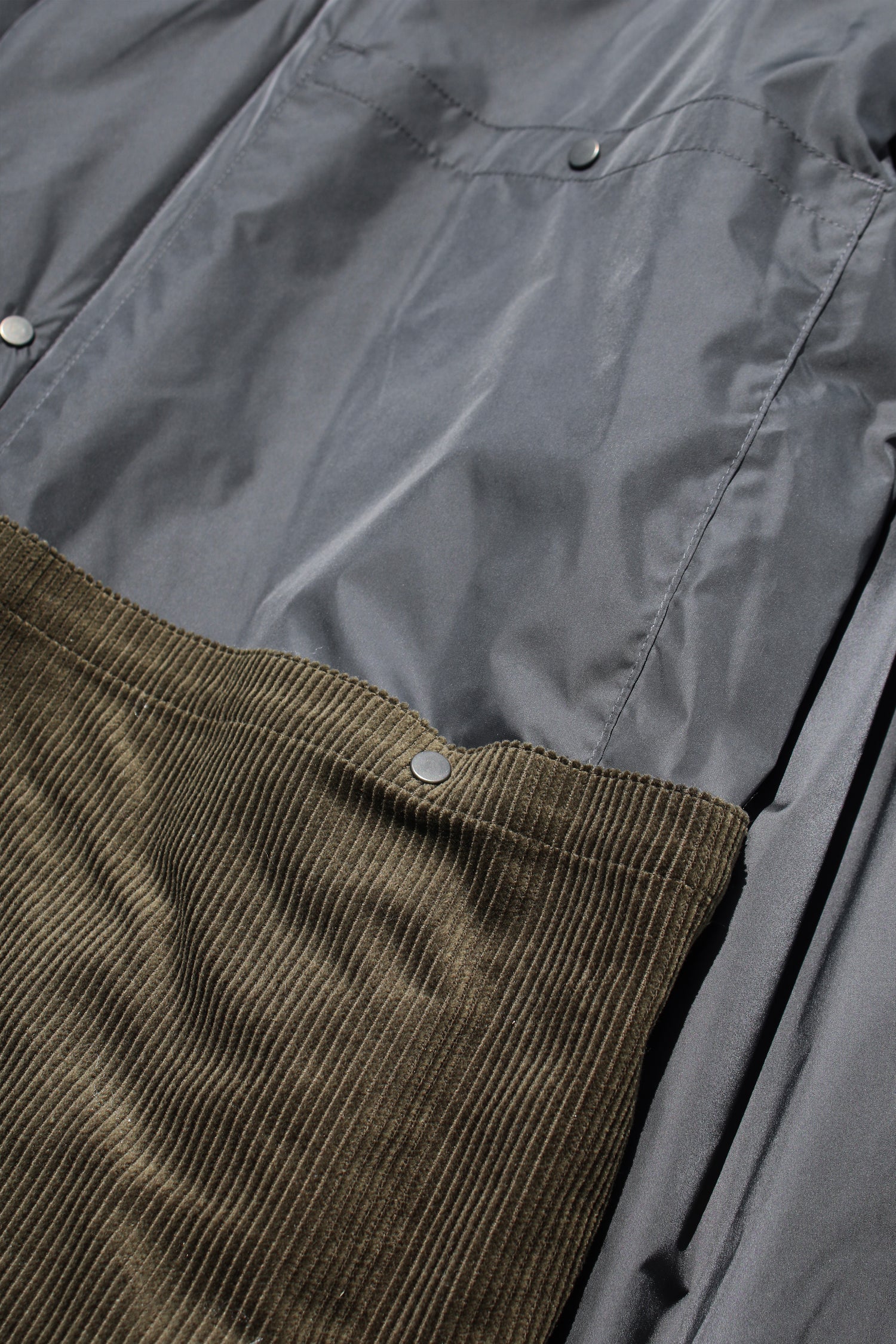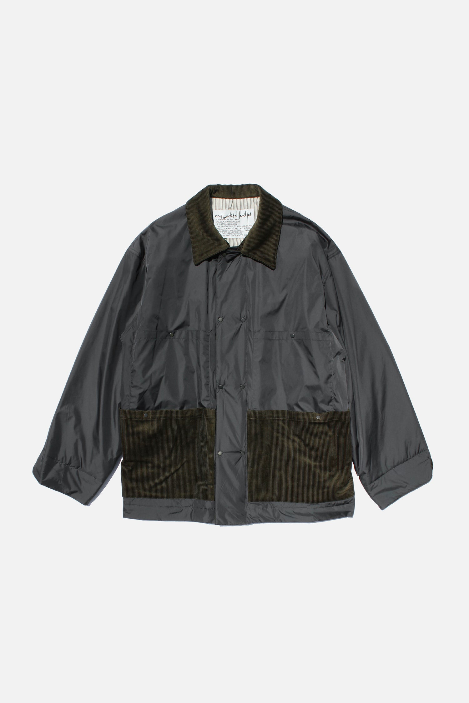 A lightweight nylon jacket for quiet weather and open space. Crafted from 100% nylon, finished with a fluorine-free water-repellent coating. 40g of lightweight fill keeps the form thin, soft, and breathable. Features corduroy trims, four patch pockets and a double-button front.
