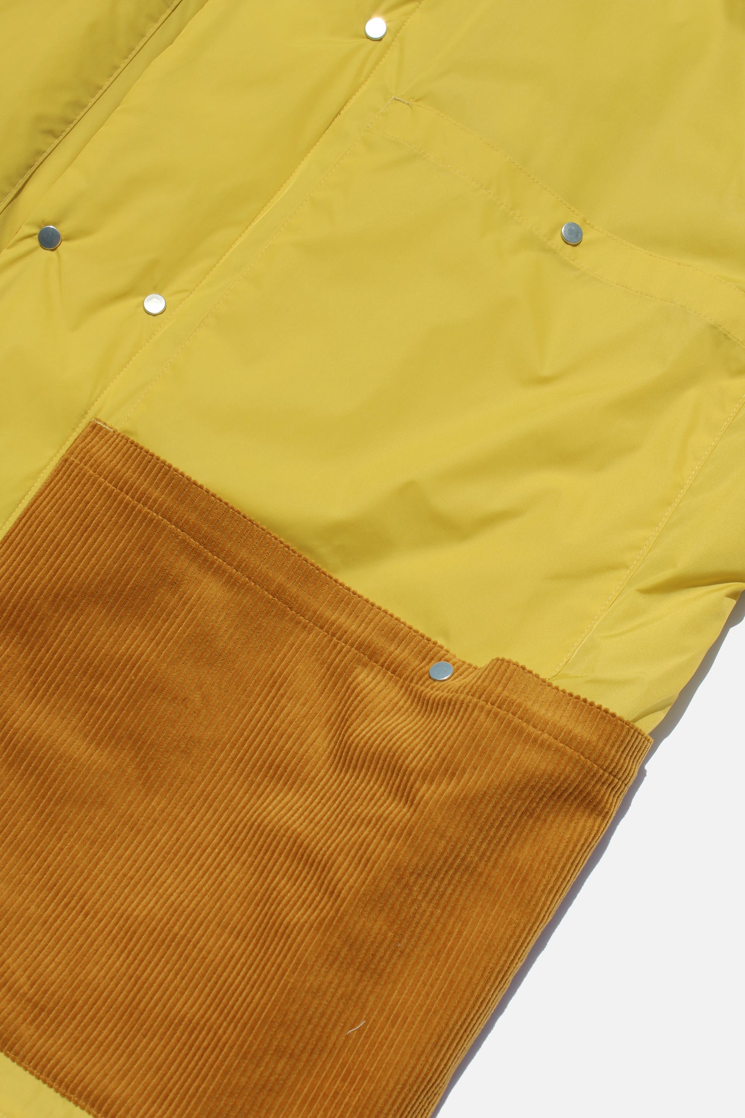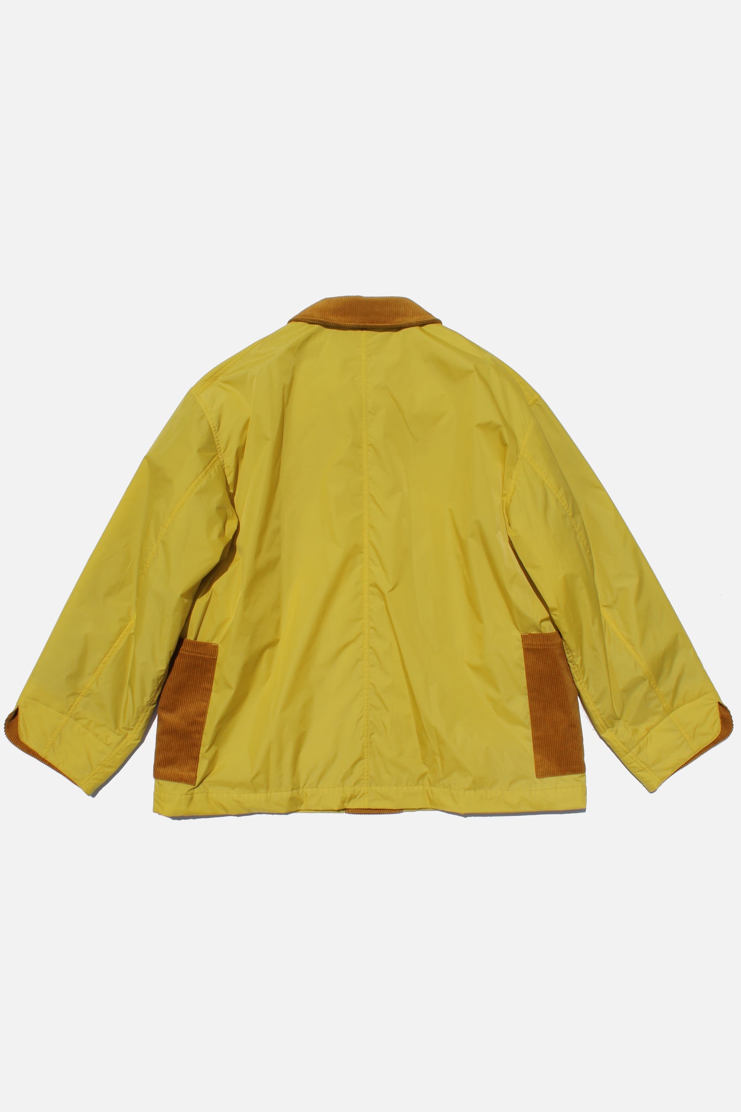A lightweight nylon jacket for quiet weather and open space. Crafted from 100% nylon, finished with a fluorine-free water-repellent coating. 40g of lightweight fill keeps the form thin, soft, and breathable. Features corduroy trims, four patch pockets and a double-button front.
