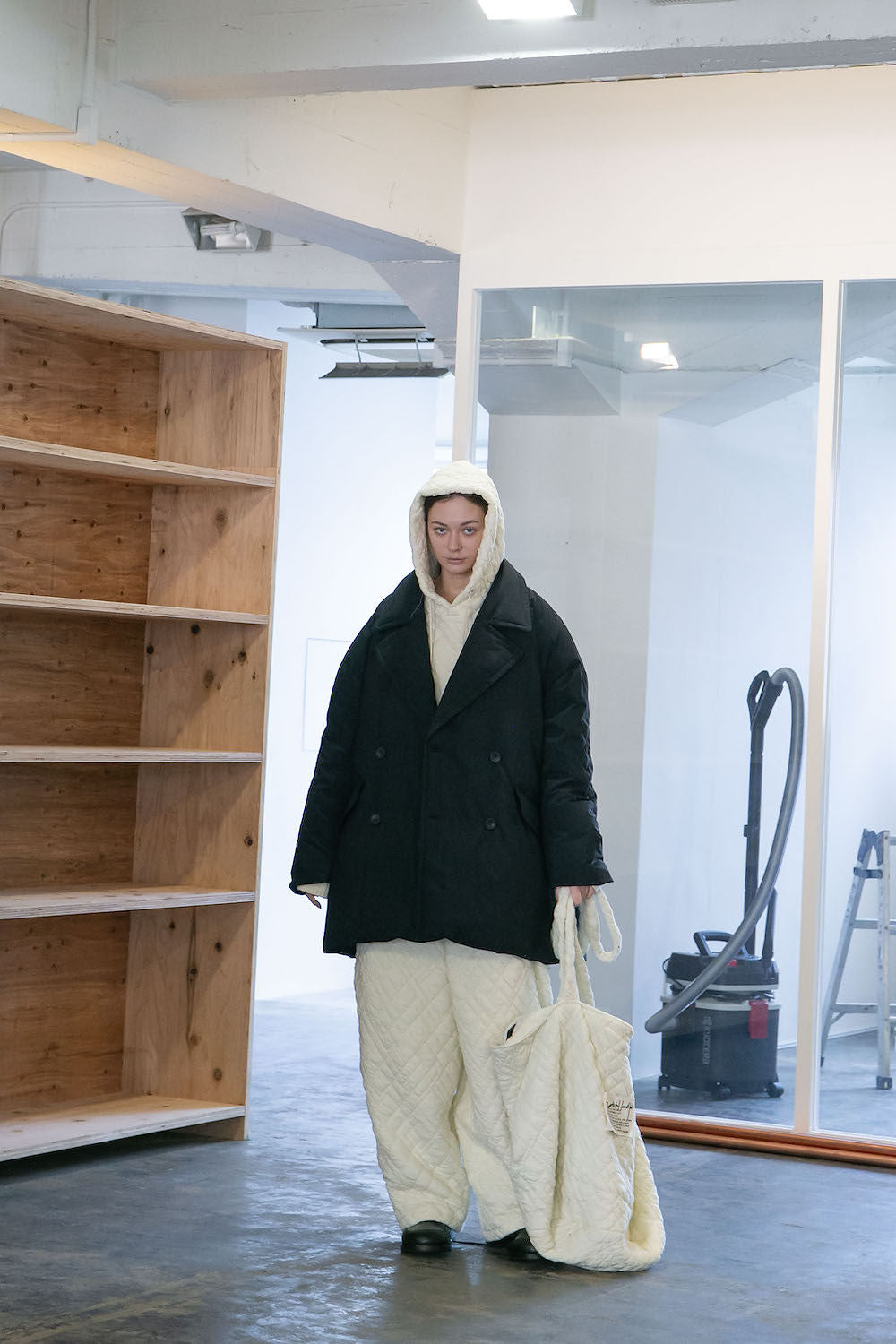 立体的な表情とソフトな風合いが特徴のダブルフェイスキルトジャカード生地を使用した大きなトートバッグ。大きなサイズとフロントのブランドタグが程よいアクセントに。