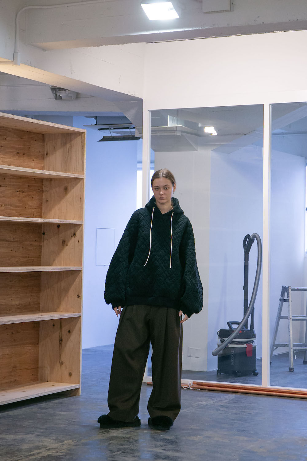立体的な表情とソフトな風合いが特徴のダブルフェイスキルト生地を使用したオーバーサイズパーカー。キルトジャカード特有の保温性と通気性のバランスも良く快適な着心地。大きめに設定したフードが程良いボリューム感です。両サイドにはハンドポケットを配備しています。同素材のパンツとのセットアップもおすすめです。