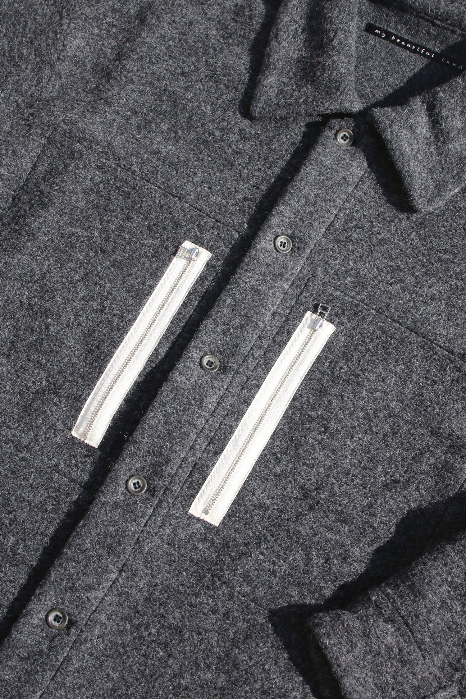 Big shirt made by lightweight wool and polyester blend from Italy to keep the heat in. Features warm fabric, oversized-fit and twin zip pockets which invoke some uncharted frequencies.