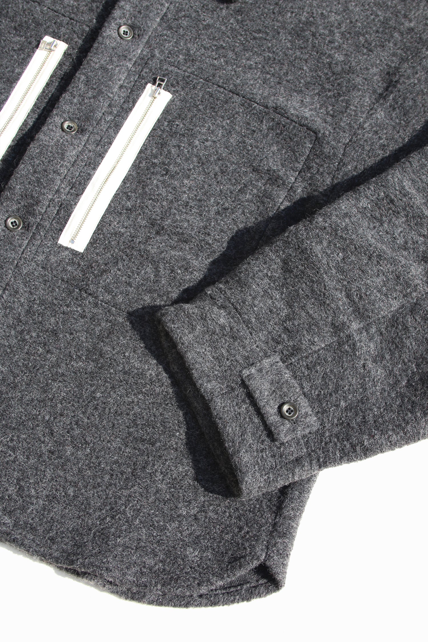DETAILSBig shirt made by lightweight wool and polyester blend from Italy to keep the heat in. Features warm fabric, oversized-fit and twin zip pockets which invoke some uncharted frequencies.