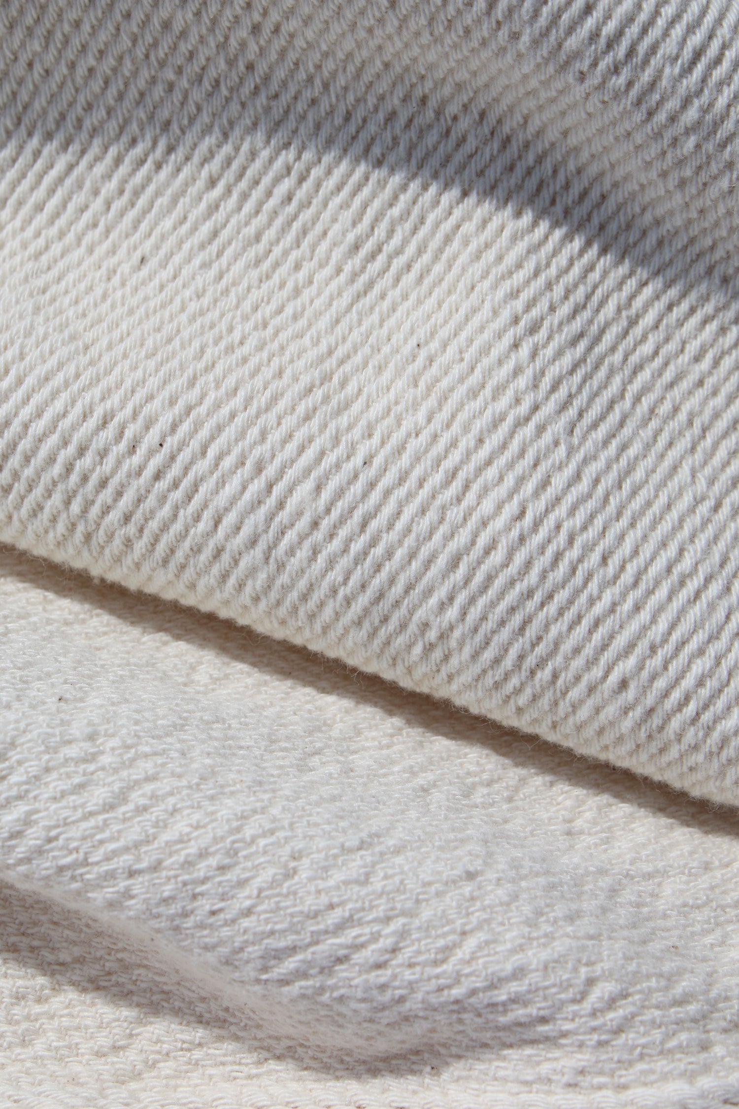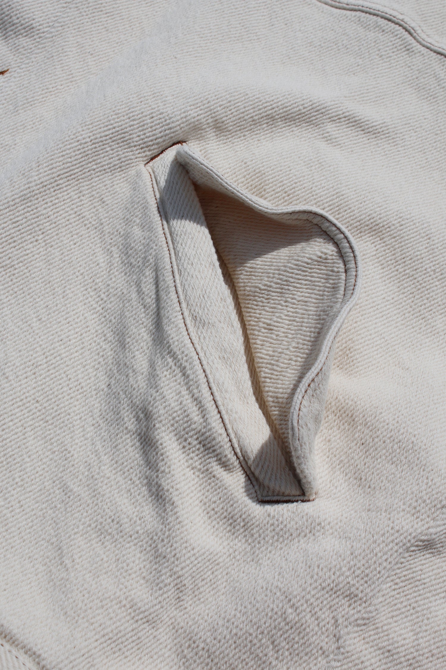 A loose denim jacket in cotton USA certified. It is smooth, soft and bio-washed. Pockets deep and slanted, two on the side. Eleven ounces: not heavy, but not light either.