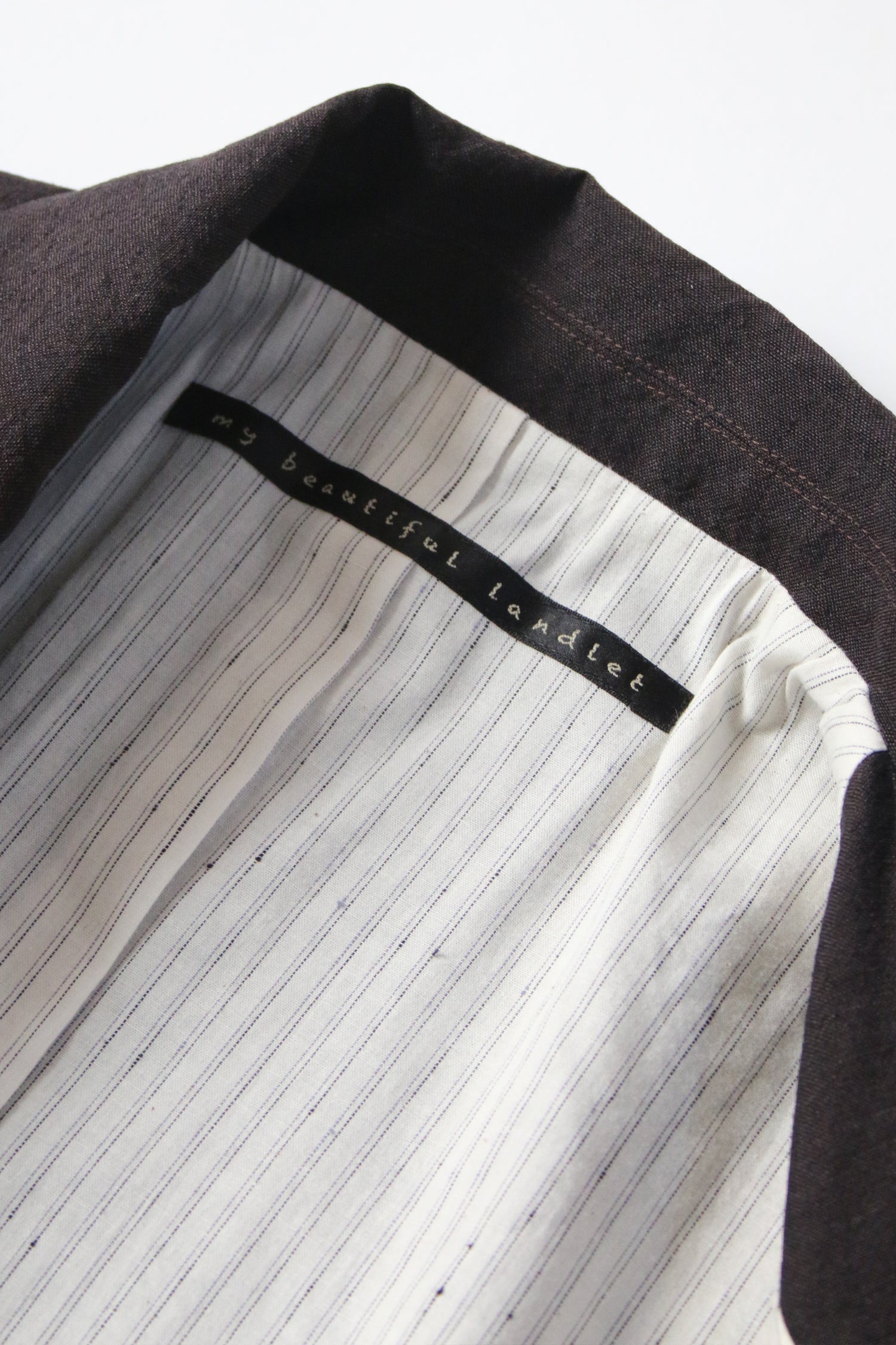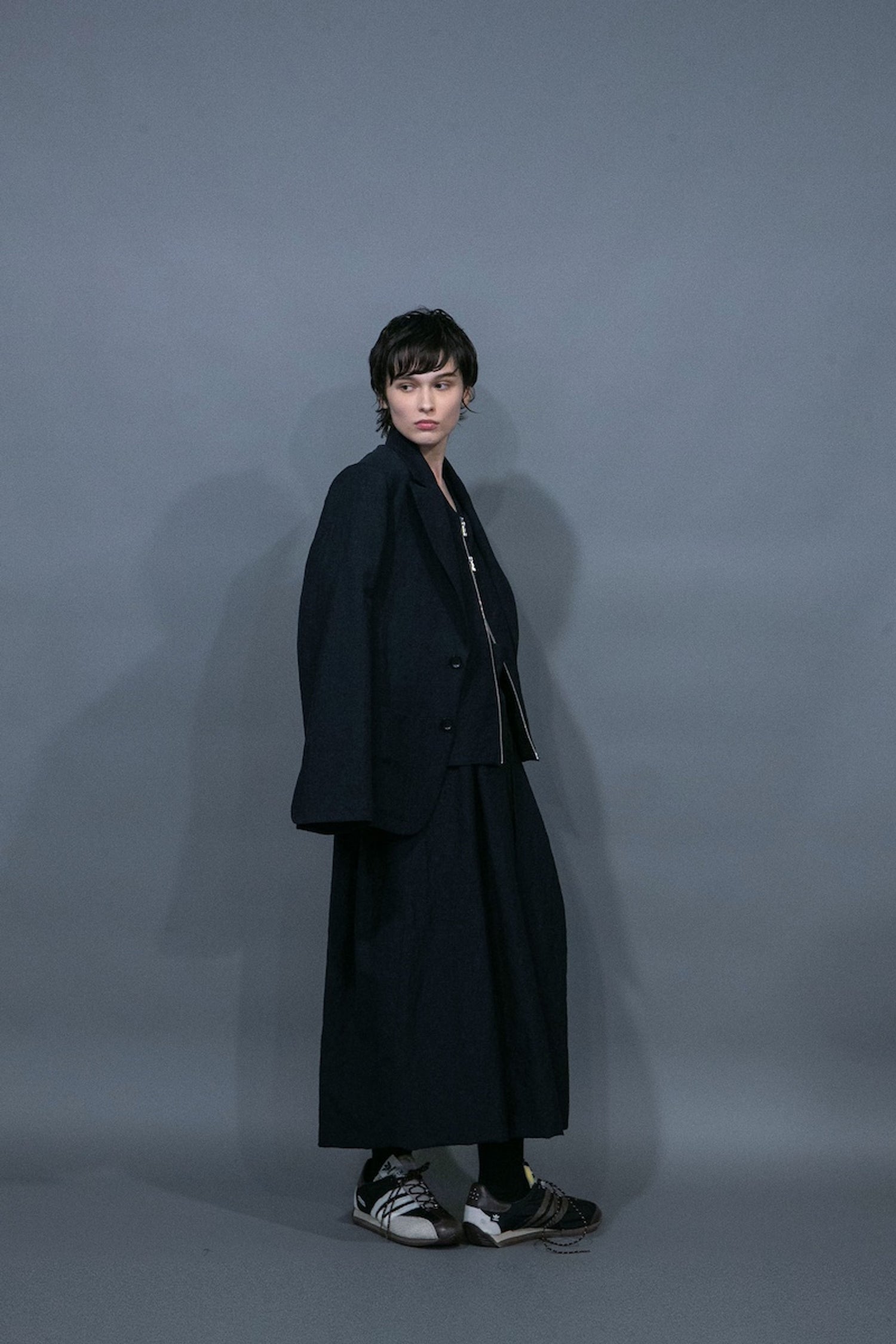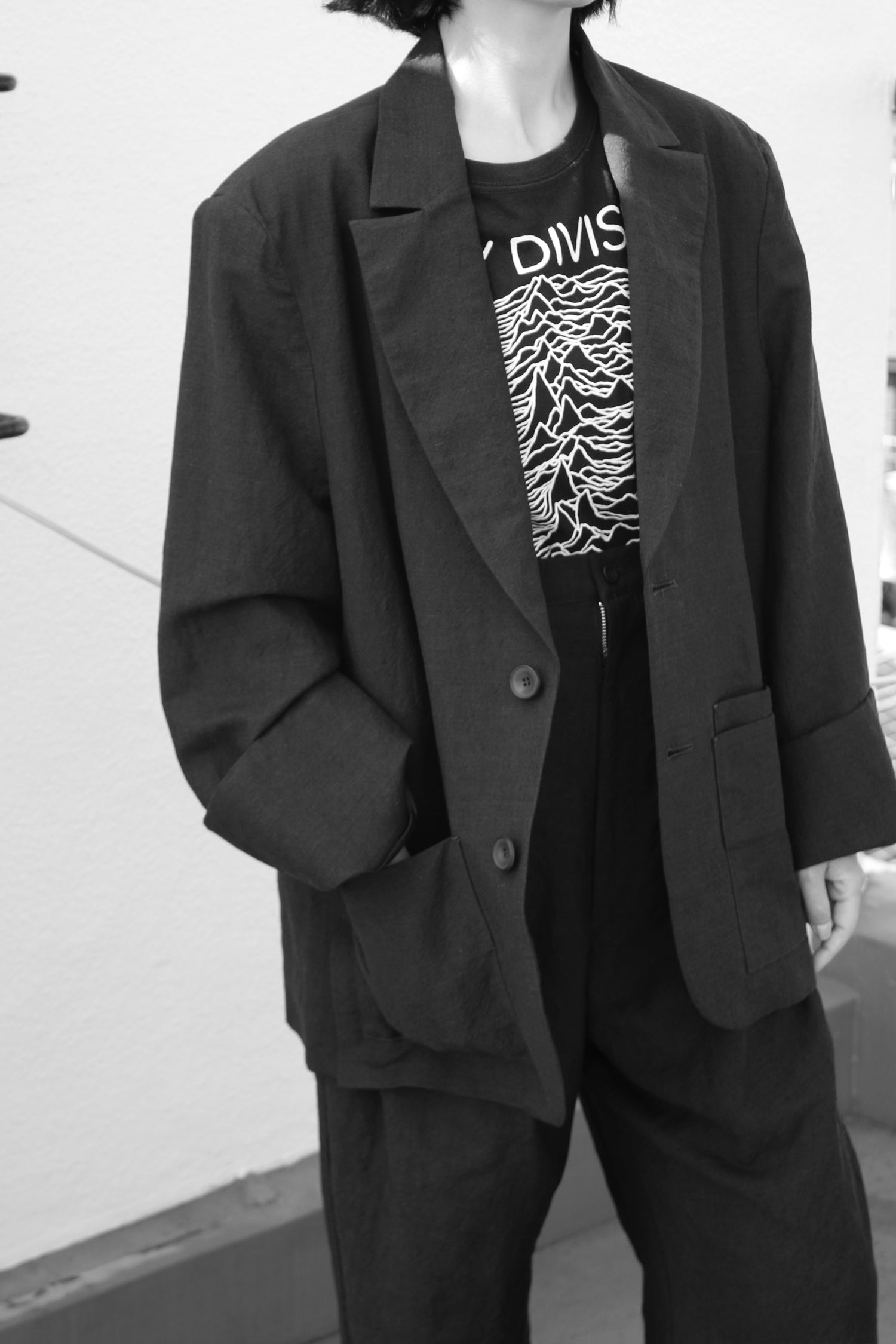 Relaxed-fit tailored jacket presents its unique shape made by Japanese wool and linen blend.