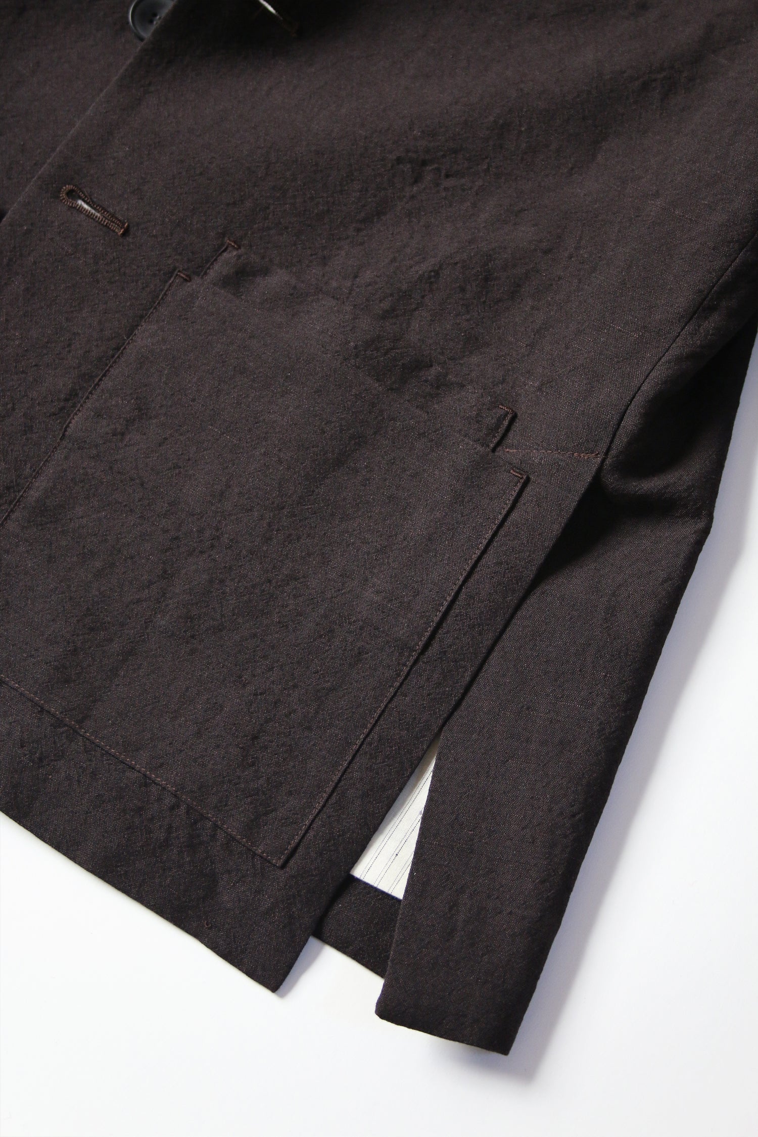 サマーウール×リネンの混合生地を採用したテーラードJKTです。フロントに施されたダブルポケットが特徴的です。ウールリネンにタンブラー加工を施す事で生まれる表面シボとドライなタッチは、素材の持つ特性を存分に活かした高級感のある風合いに仕上がっています。裏地はコットン素材を使用。こちらは、BROWN。