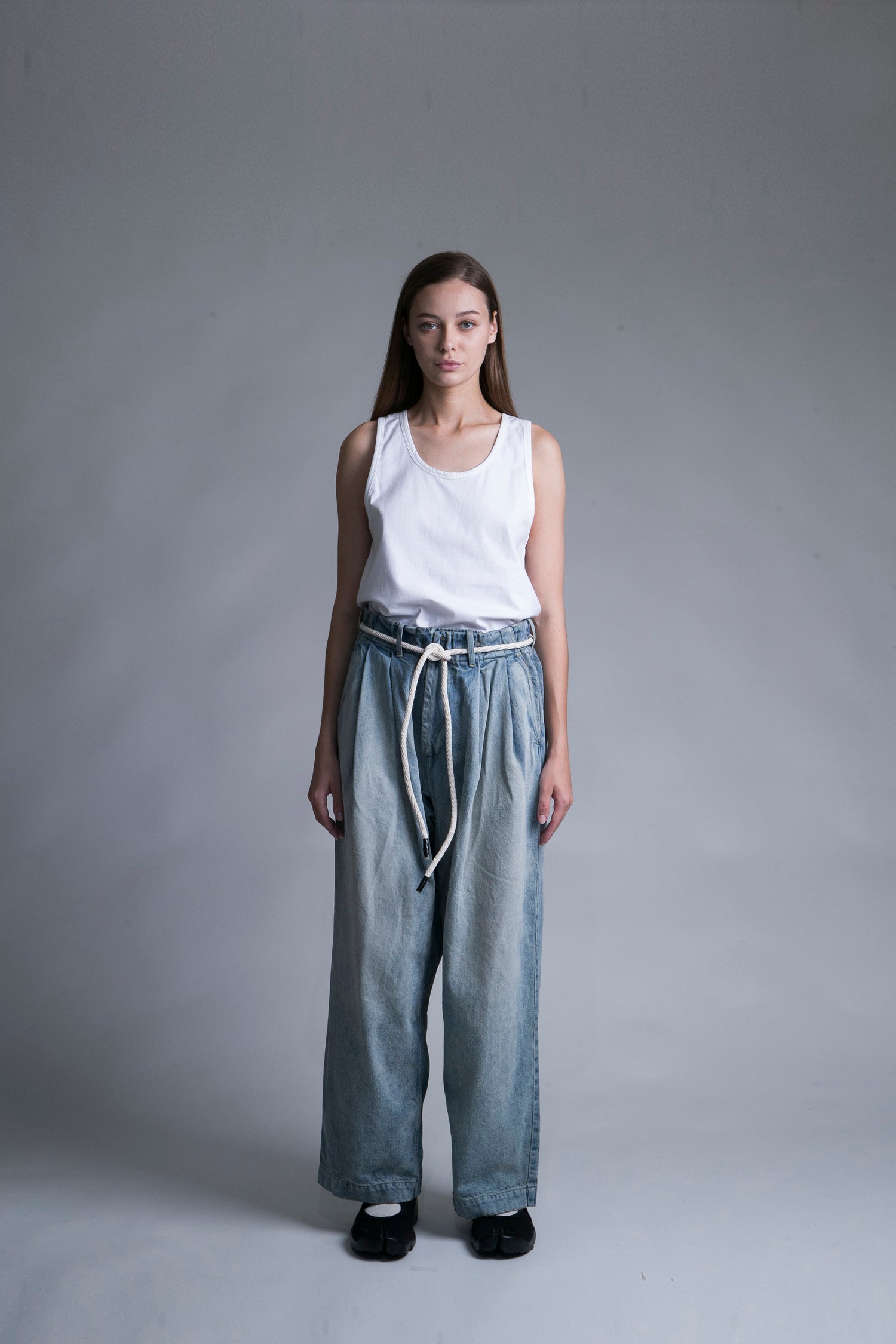 マイビューティフルランドレットのワイドデニムパンツ(USED WASH)。12ozのデニムを使用。ツータックのドレープ感たっぷりのワイドパンツに仕上げました。USED加工には多くの手作業を加え、こだわりのある表情に仕上げました。フロントプリーツ、バックシンチが特徴。オーバーサイズでの着用もオススメです。男女問わず着用可能です。(※このデニムパンツはホワイトベルトは含まれていません。)