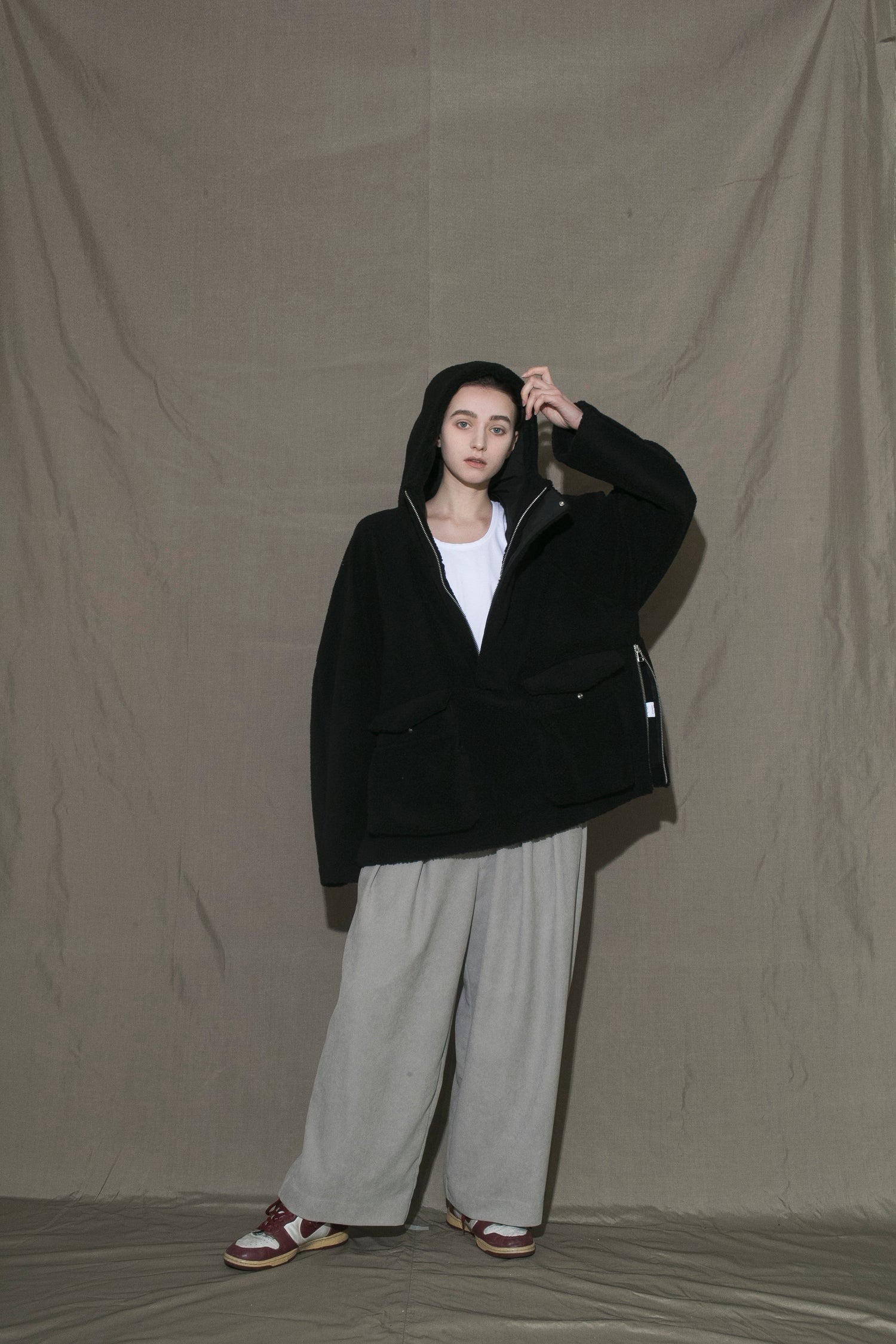 カジュアルなアーバンフードジャケットも、ポリエステルアクリルの上質な素材で上品に。 ソフトでポップな素材感とハードなディティールが特徴のアノラック。パイル編みでボアを表現することで、まさに羊そのもののボリュームと弾力感を表現。空気を含むことで暖かみがある立体感な表情とボア特有の柔ら かな肌触りが特徴です。リサイクルポリエステルを使用しており、地球に優しいサスティナブル素材。ゆったりとした身幅、肩幅のリラックスシルエット。裾に設けられたシルバージップの開閉によってシルエットを変化させることが可能。