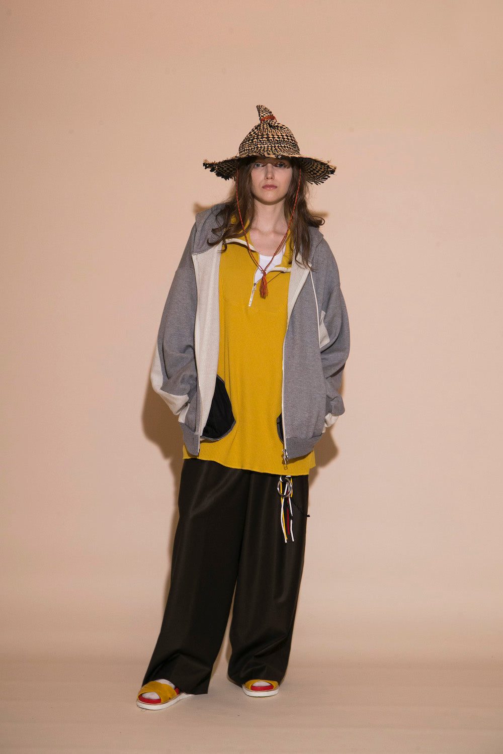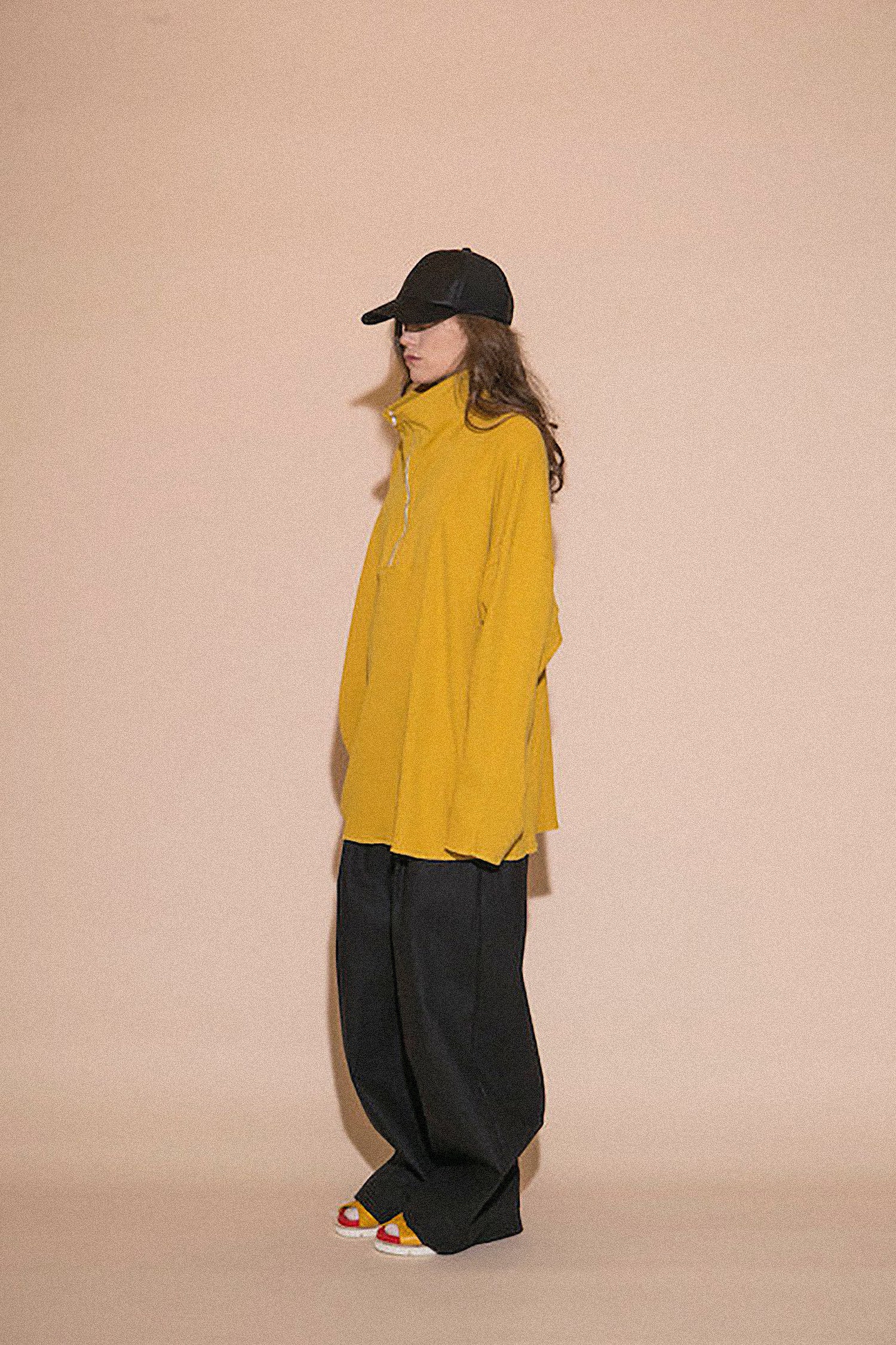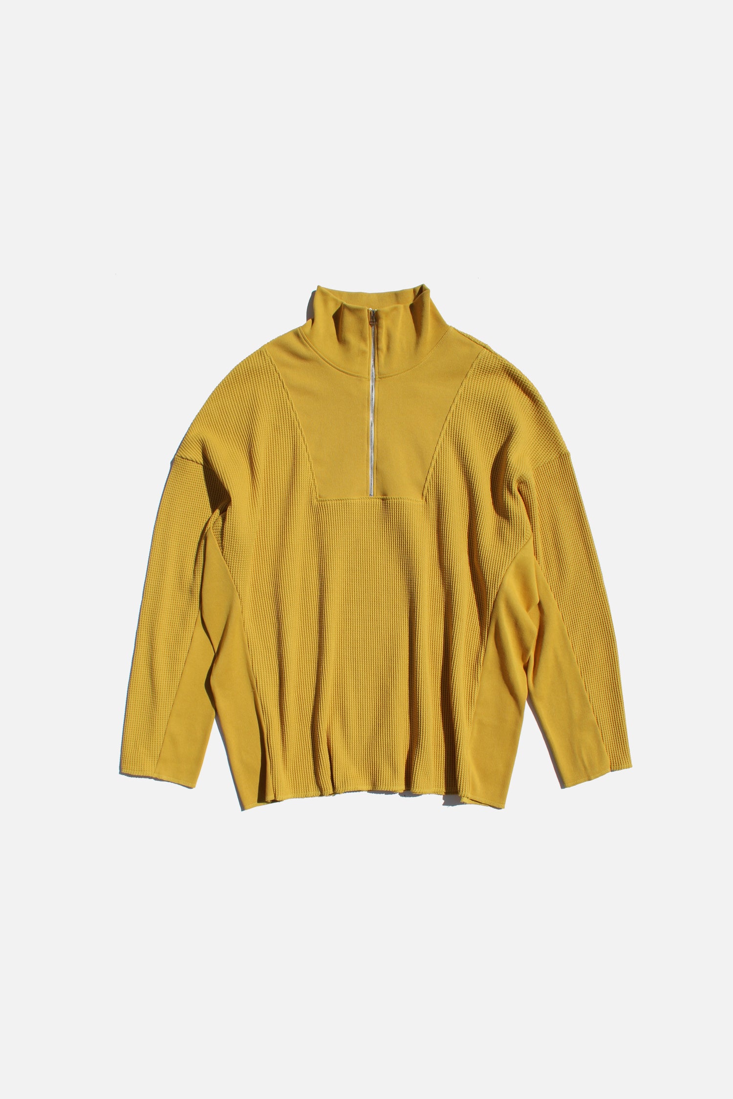Loose oversized long sleeve half zip pullover within the waffle series. Features streetwise yellow and dropped shoulders. With a wider pants put on, independent as downtown’s associate.