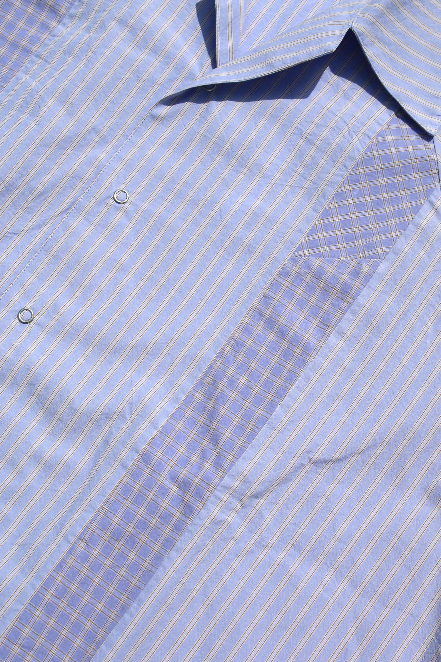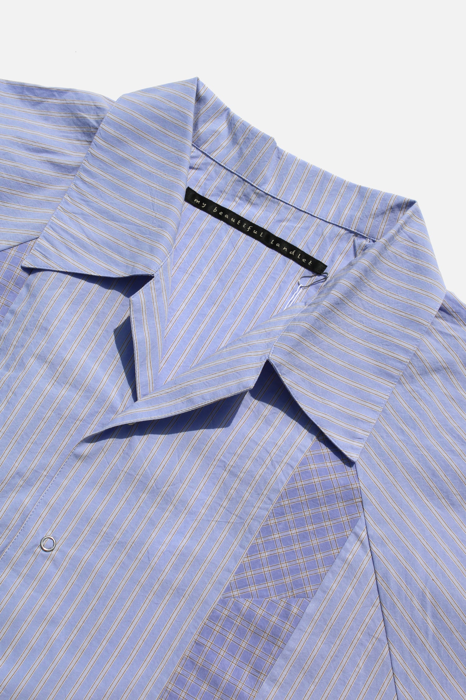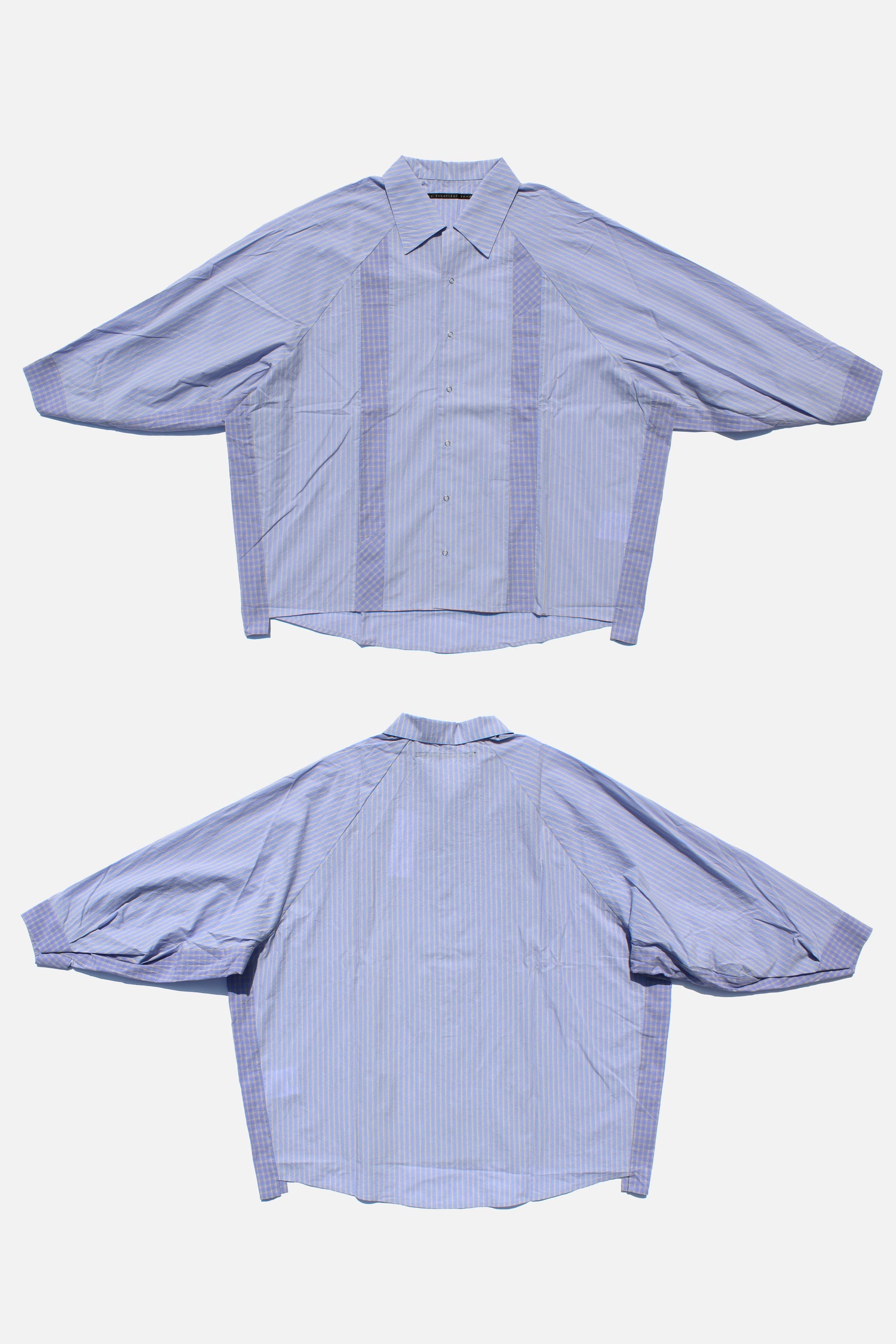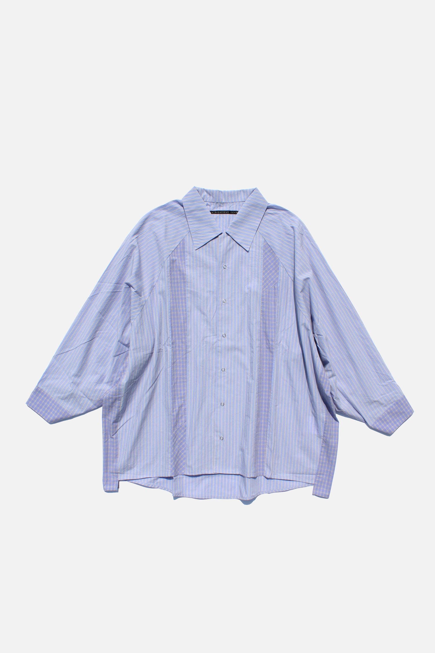 M.B.L.のユニセックスオープンカラーシャツ。60番手単糸を高密度に織り上げ、ストライプとチェック柄を切り替えて作成しています。ラグラン仕様で身幅も広く、ゆったりとご着用いただけます。オールシーズンご着用頂けます。