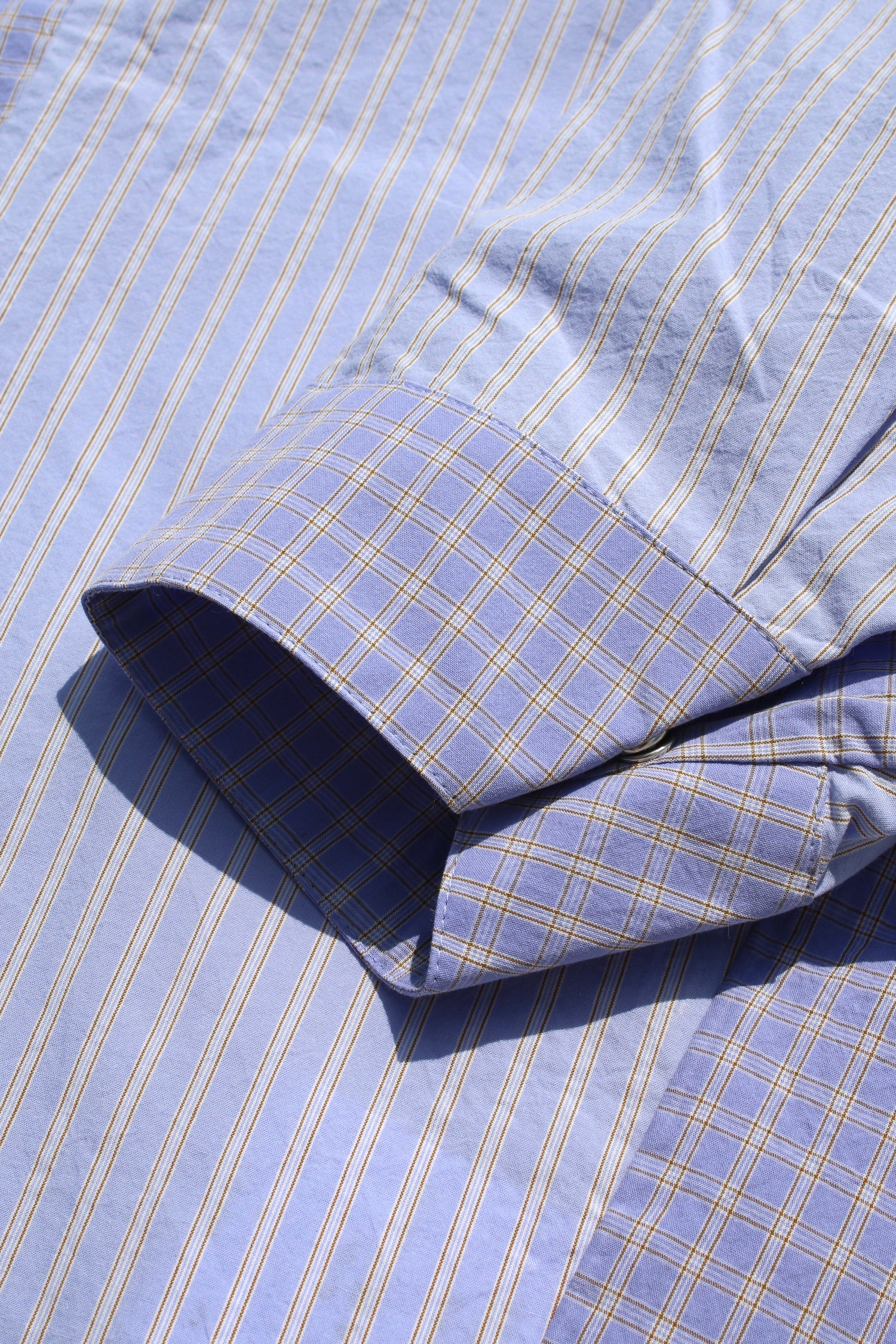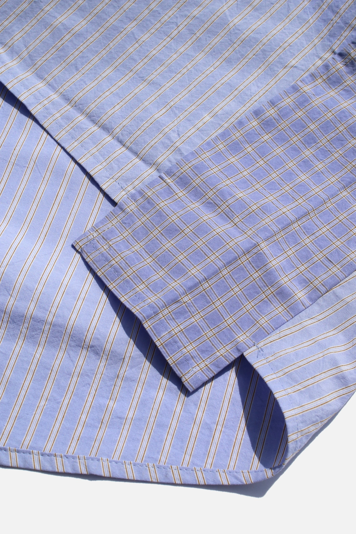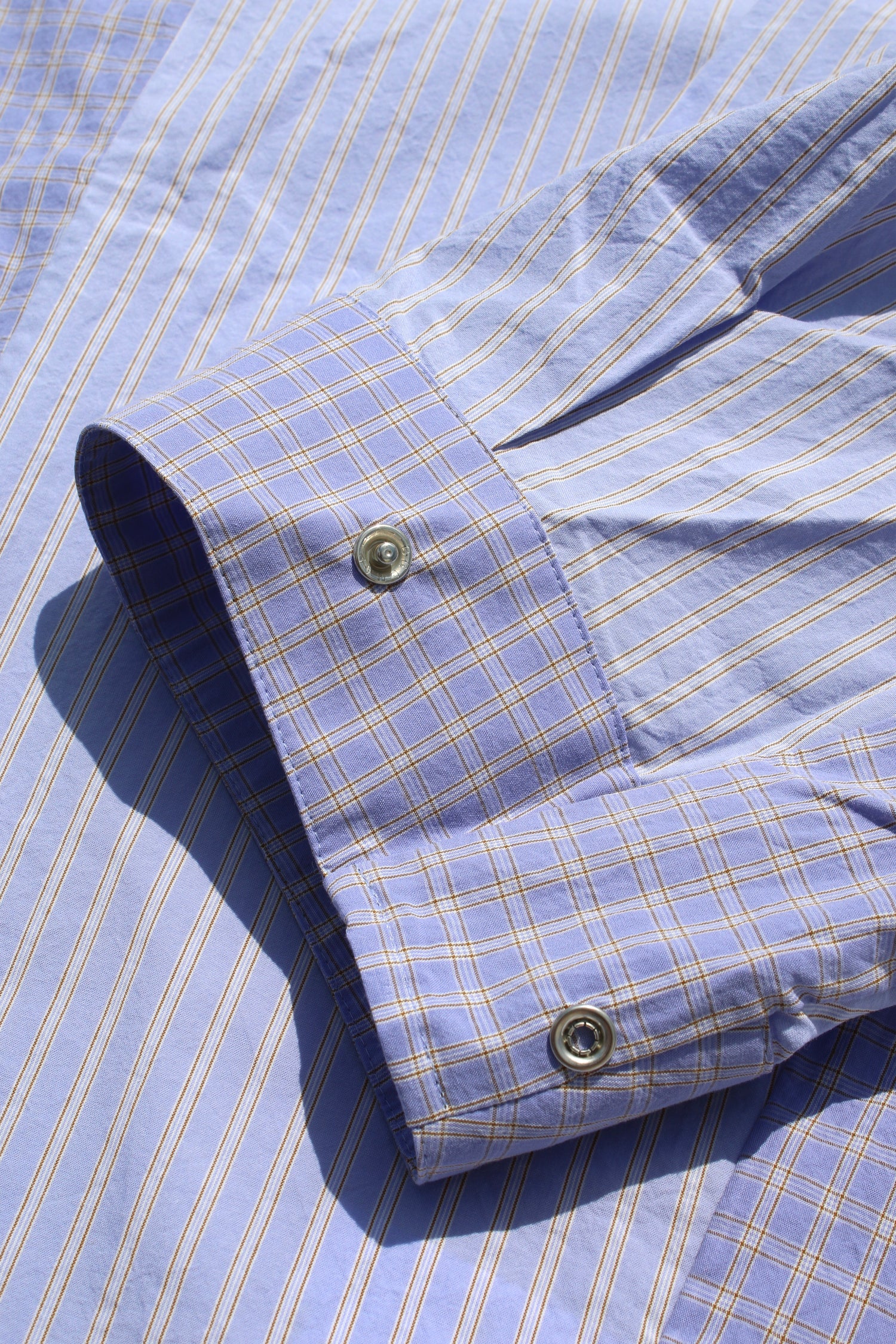 Purple open-collar shirt woven from high density cotton. The pattern, alternating between stripes and checks, is subtle but methodical. The cut is raglan and the body is wide. It doesn’t speak of seasons, only of continuity. Unisex.