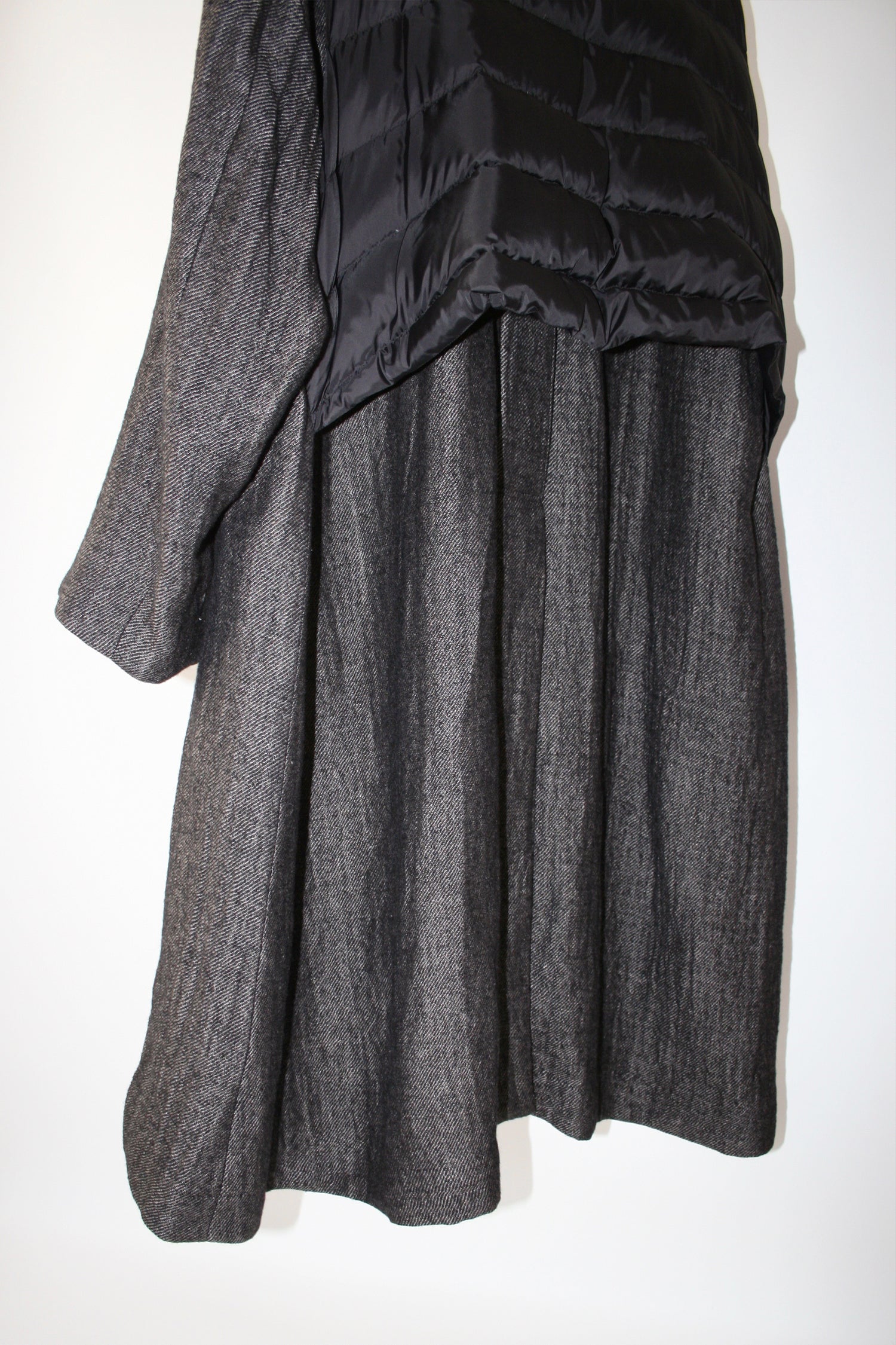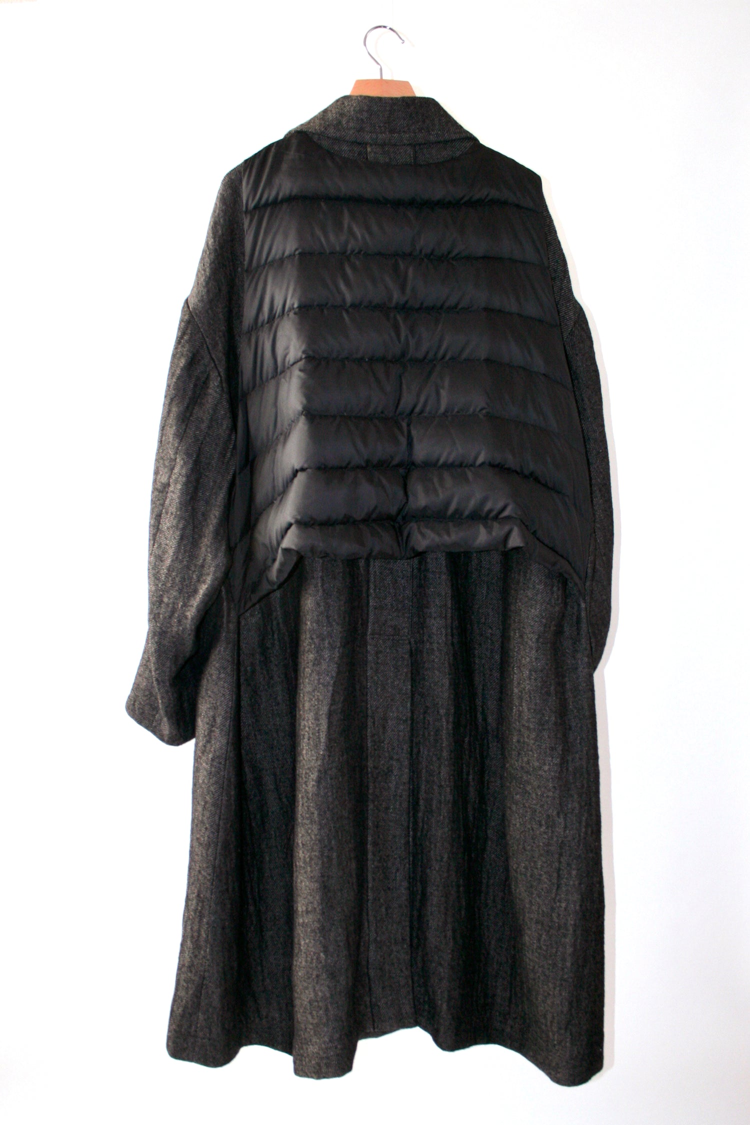 MBLアーカイブス。オーバーラップスリーブコートの背中にダウンベストを配したMIXスタイル (ダウン 90%, フェザー10%) 。ナチュラルなテイストのウールとリネンによる二重織ガーゼ素材。同素材のベージュパンツとのセットアップもオススメです。共地を使用したWOOL LINEN × DOWN MIX JACKETもございます。