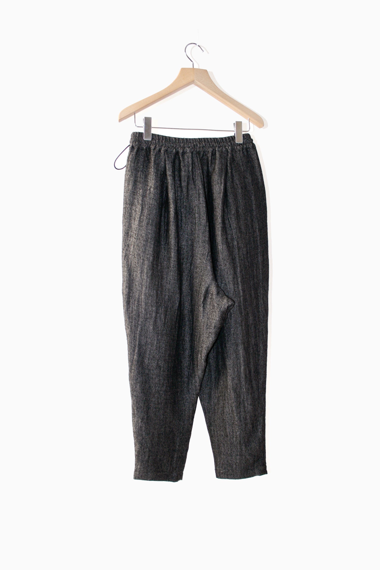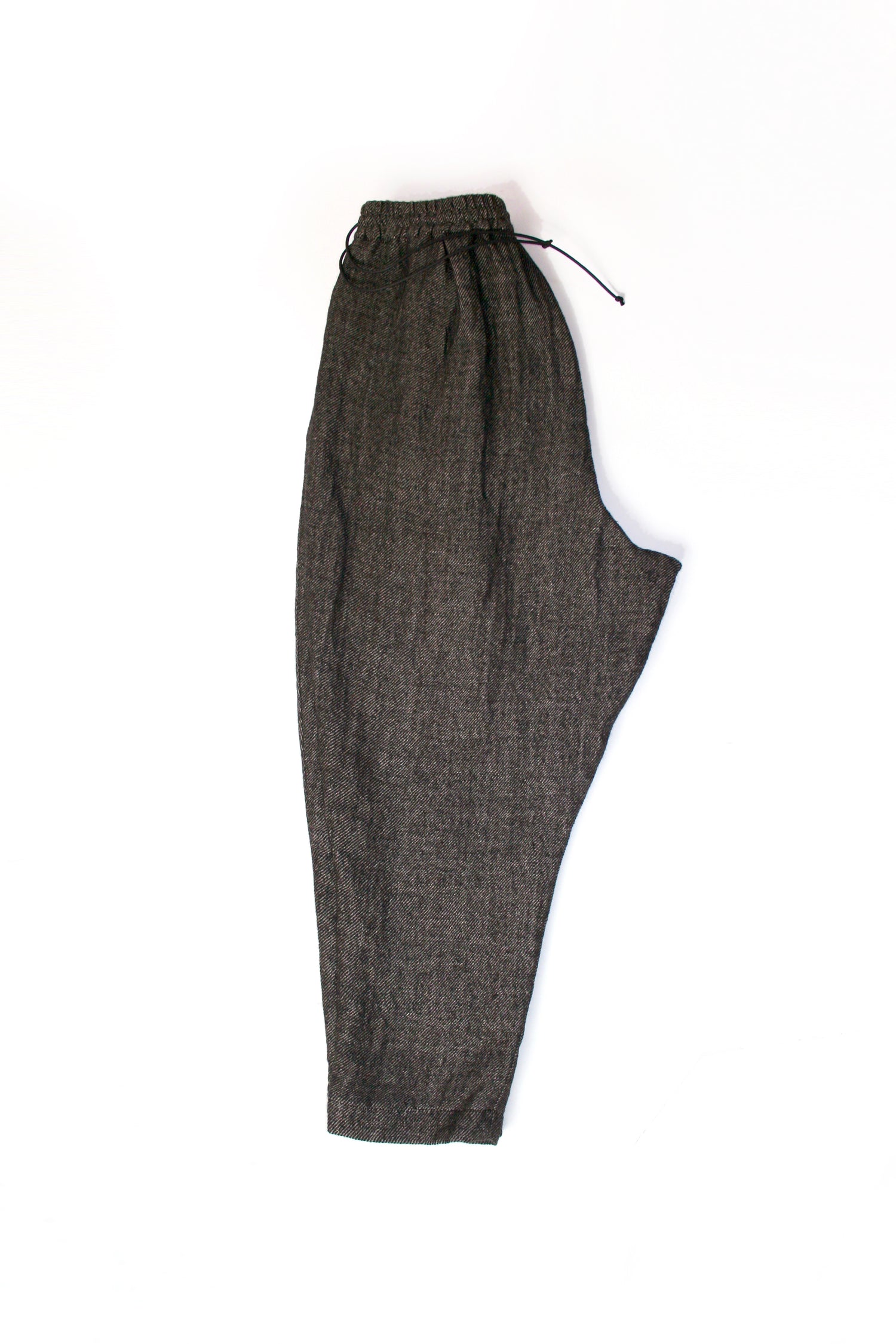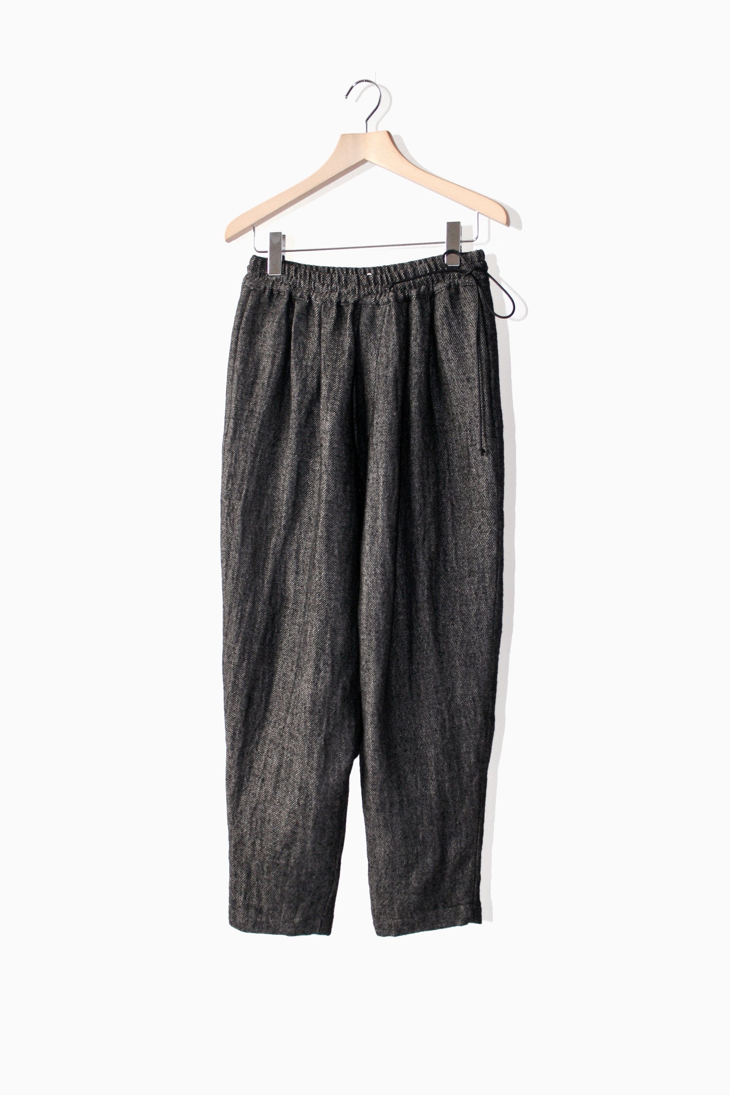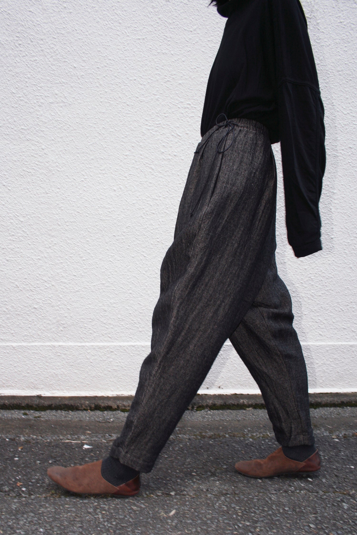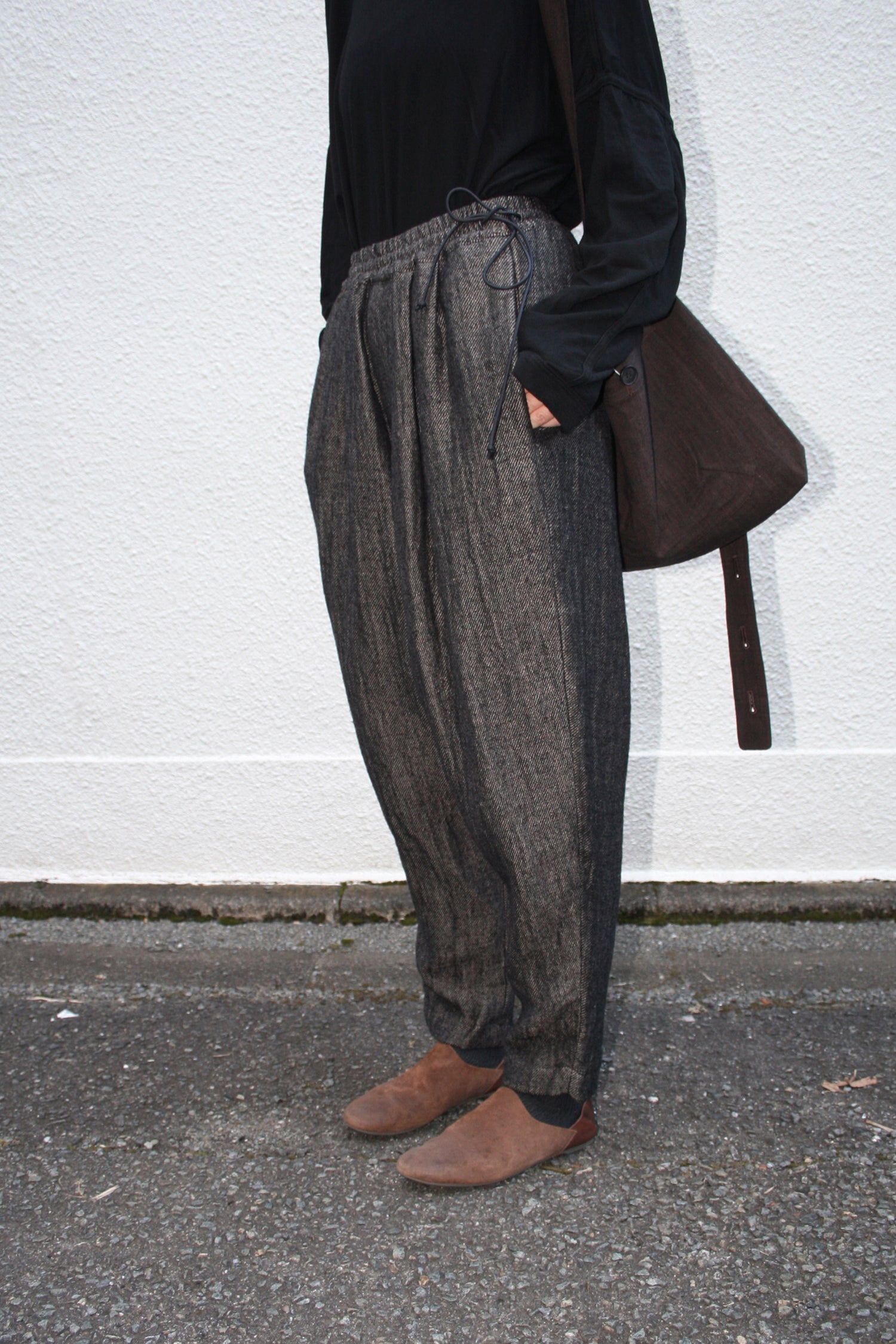 通年定番のスリムイージーパンツ。ゆったりとしたウエストまわりからテーパードをきかせたシルエット。ナチュラルなテイストのウールとリネンによる二重織ガーゼ素材。ウエスト部分はゴム仕様、ドローストリングも付いているので幅広くサイズ調整が可能です。スリム仕様、片側のポケット等細部にまで拘った逸品です。同じ生地を使用したベージュジャケットwool linen down mix jacketとベージュコートwool linen down mix coatでの着用もオススメです。シャツやTシャツでももちろんですがロング丈のカットソーなども合わせやすいアイテムとなっています。