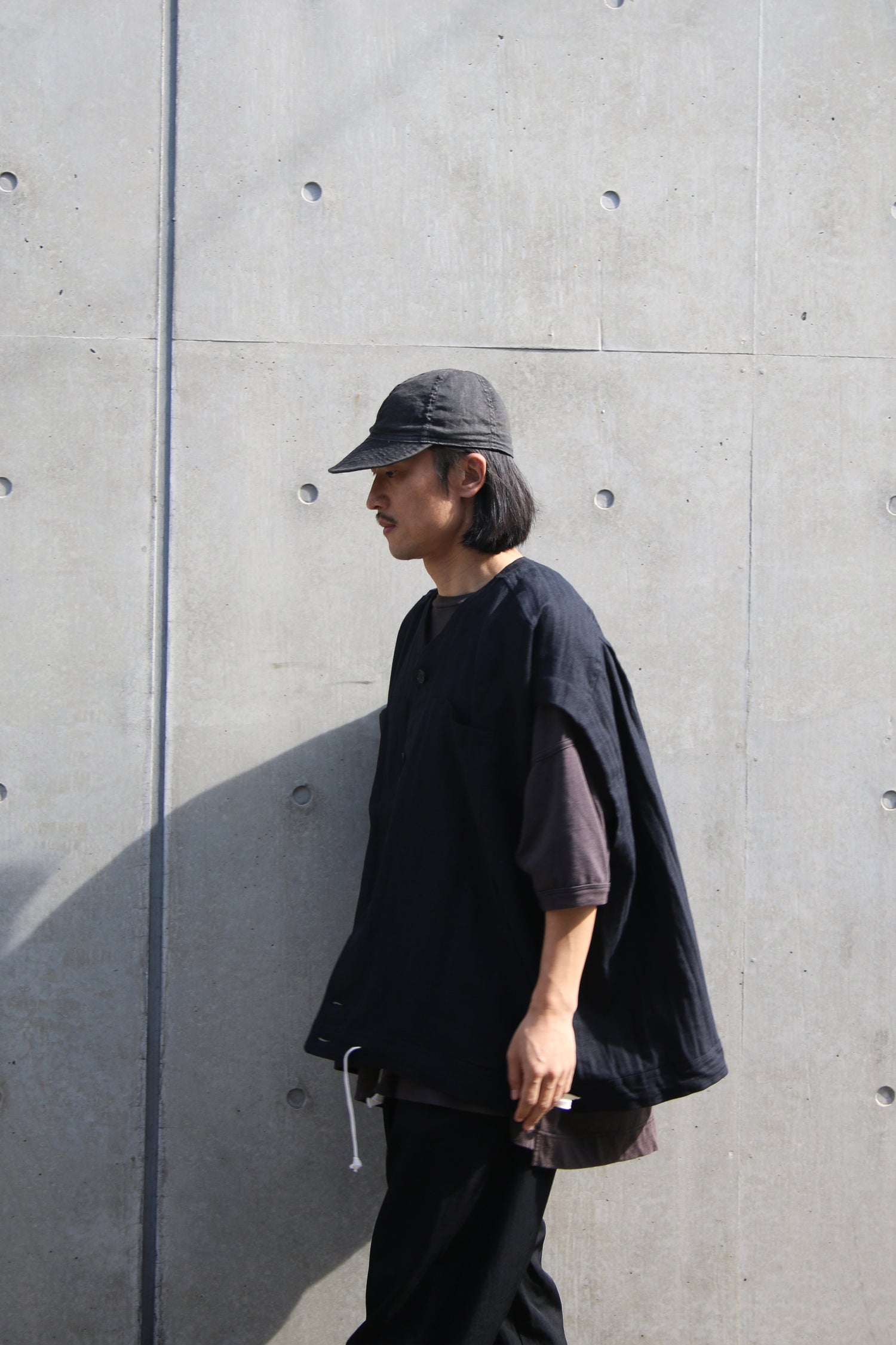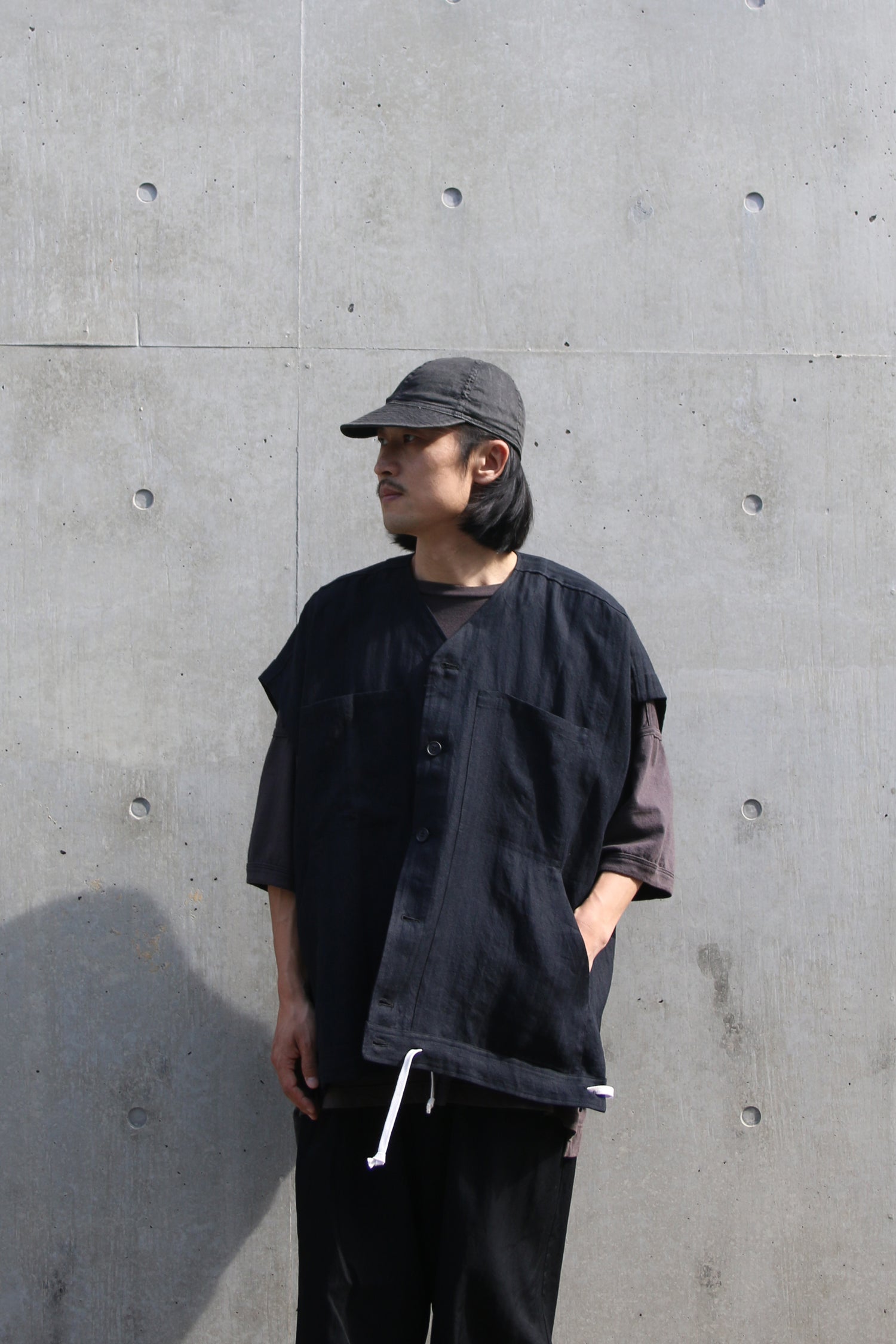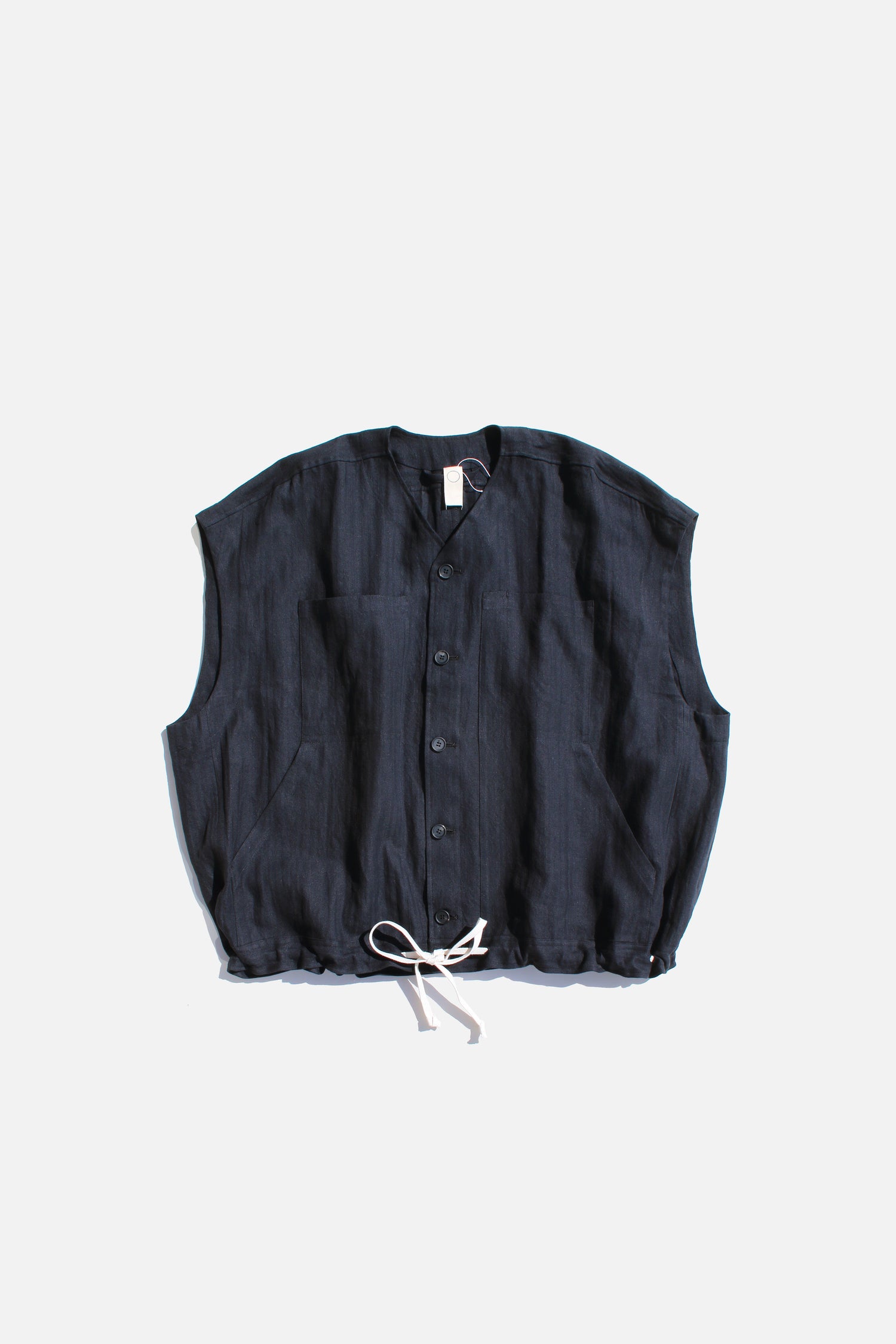 リネンとコットンの混素材を使用したボディウォーマーベスト。軽く、清涼感のある着心地。オーバーサイズ。大ぶりなフロントポケット、ゆったりとしたサイズ感、アウター感覚での使用が可能です。内ポケット付き。裾にはドローコードを配することで、シルエットバランスを変化させて楽しんでいただけます。オールシーズンでご愛用いただけるお奨めアイテムとなっております。