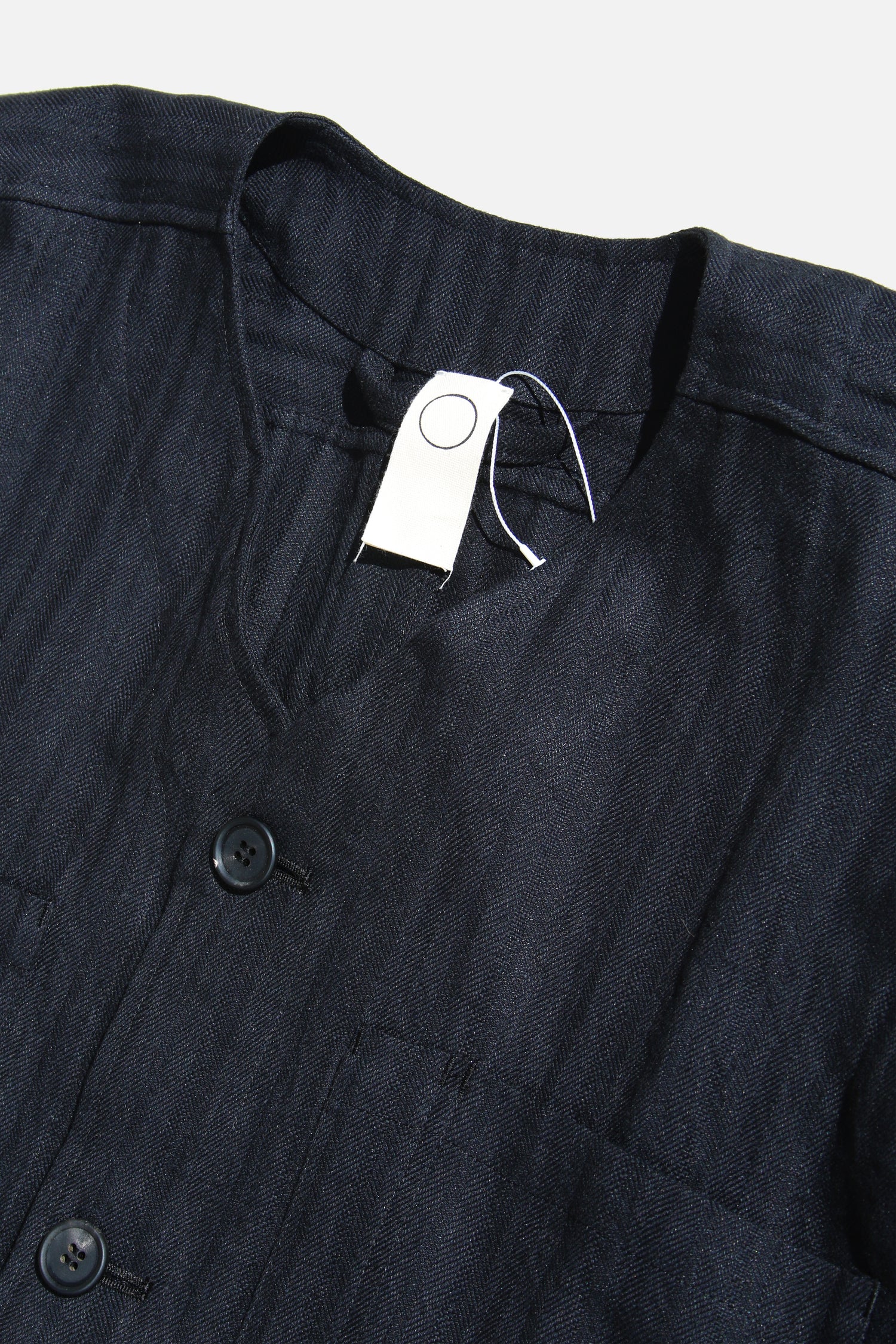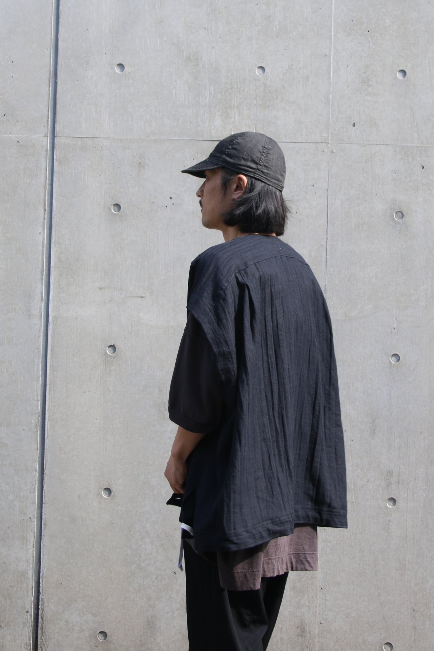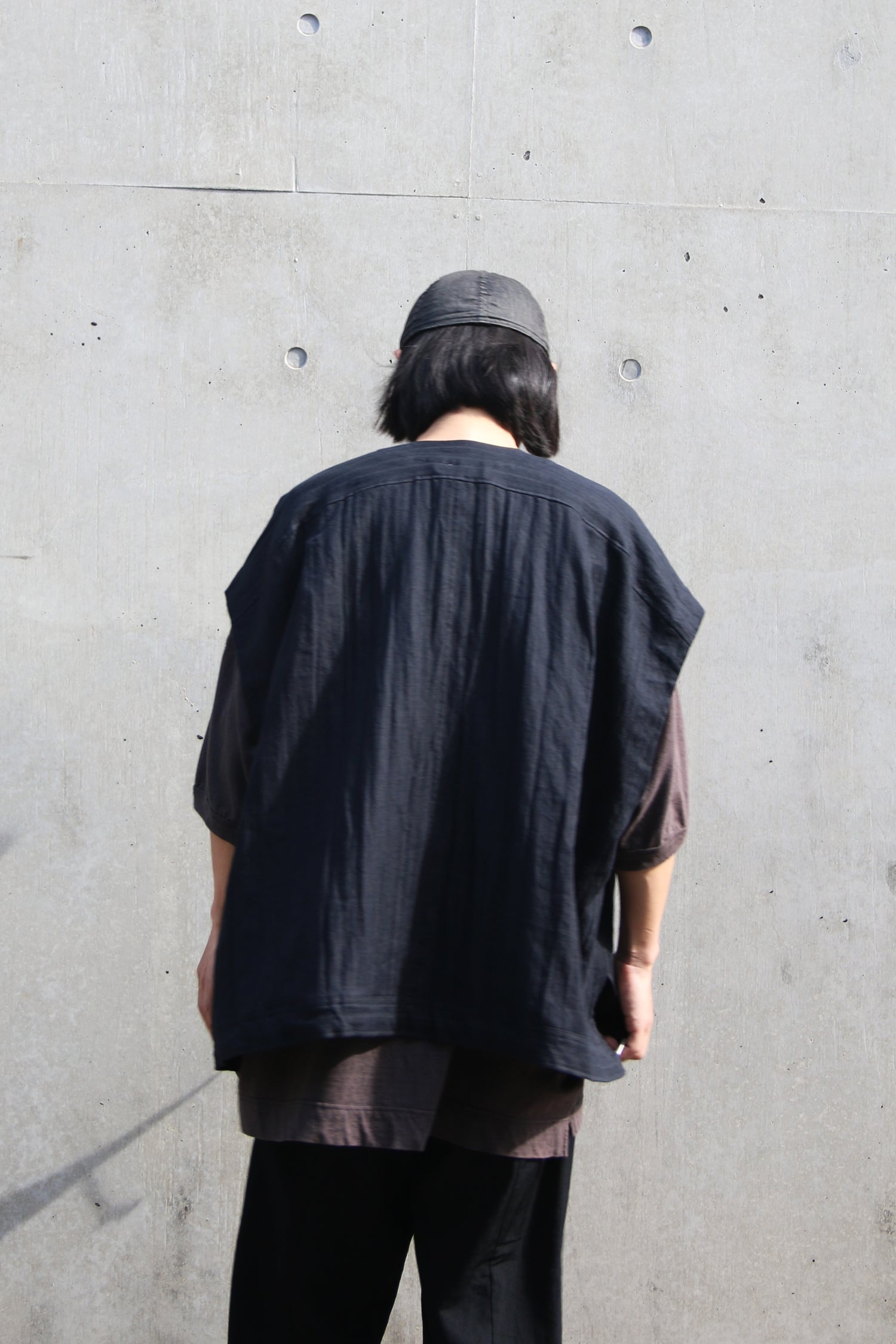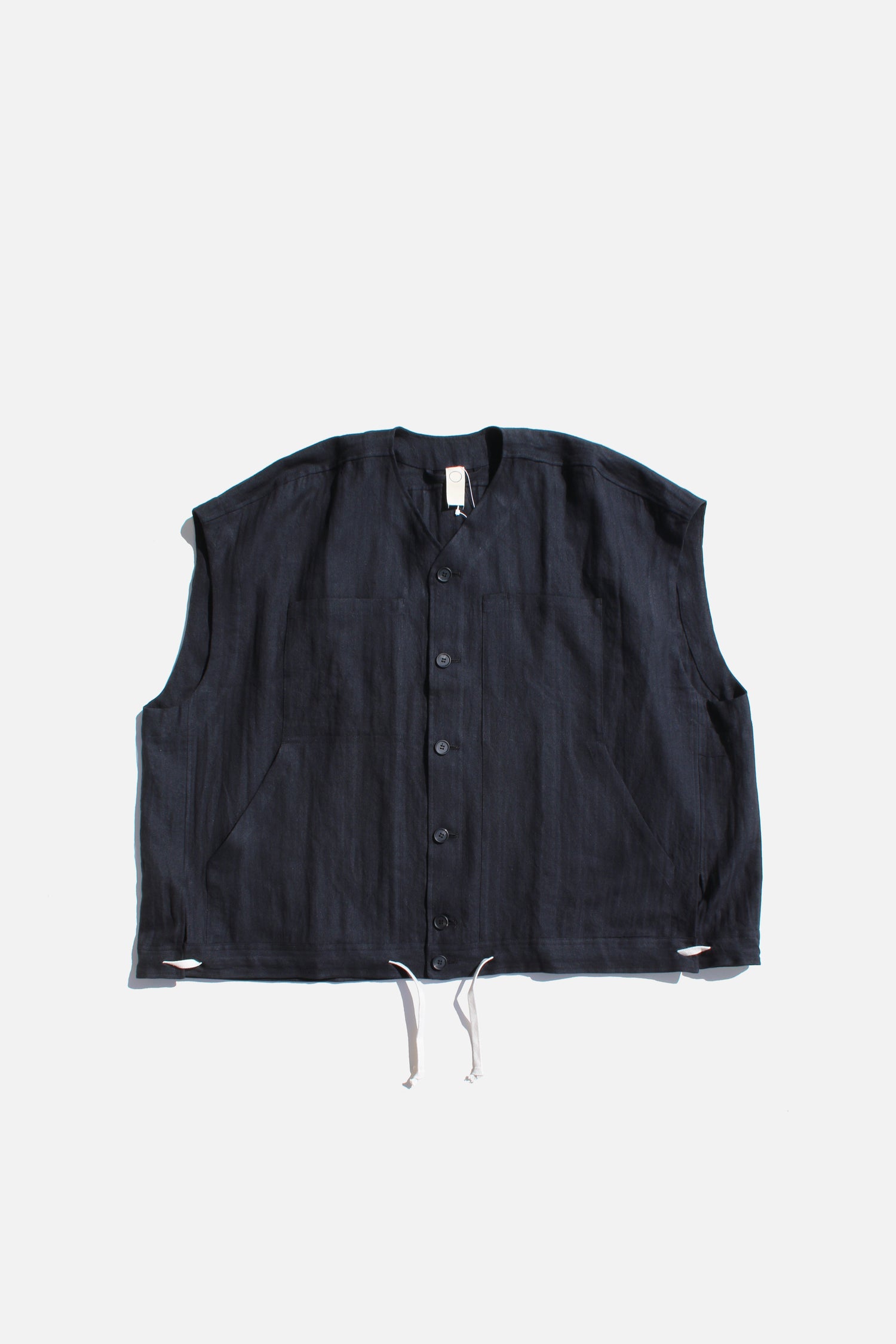 リネンとコットンの混素材を使用したボディウォーマーベスト。軽く、清涼感のある着心地。オーバーサイズ。大ぶりなフロントポケット、ゆったりとしたサイズ感、アウター感覚での使用が可能です。内ポケット付き。裾にはドローコードを配することで、シルエットバランスを変化させて楽しんでいただけます。オールシーズンでご愛用いただけるお奨めアイテムとなっております。