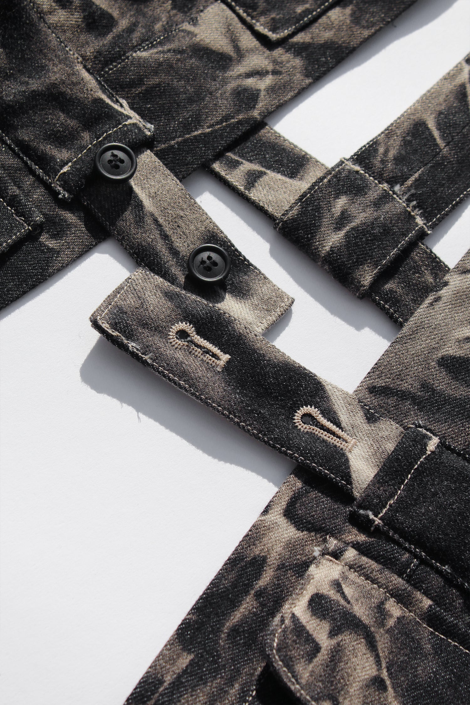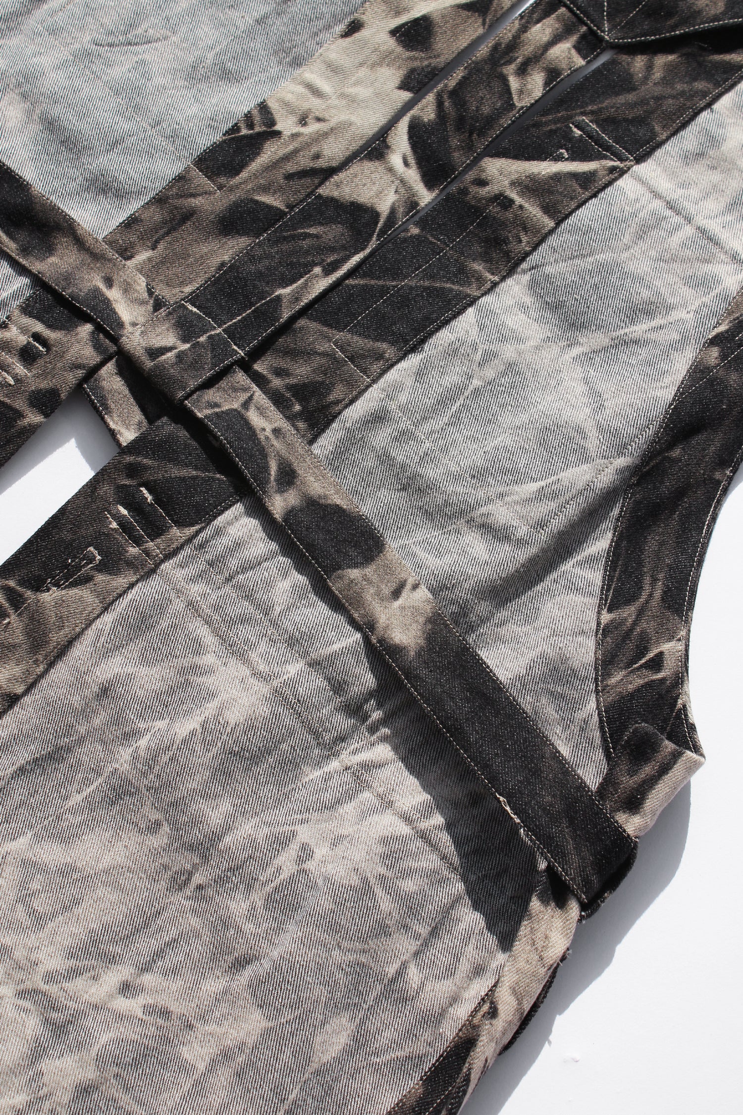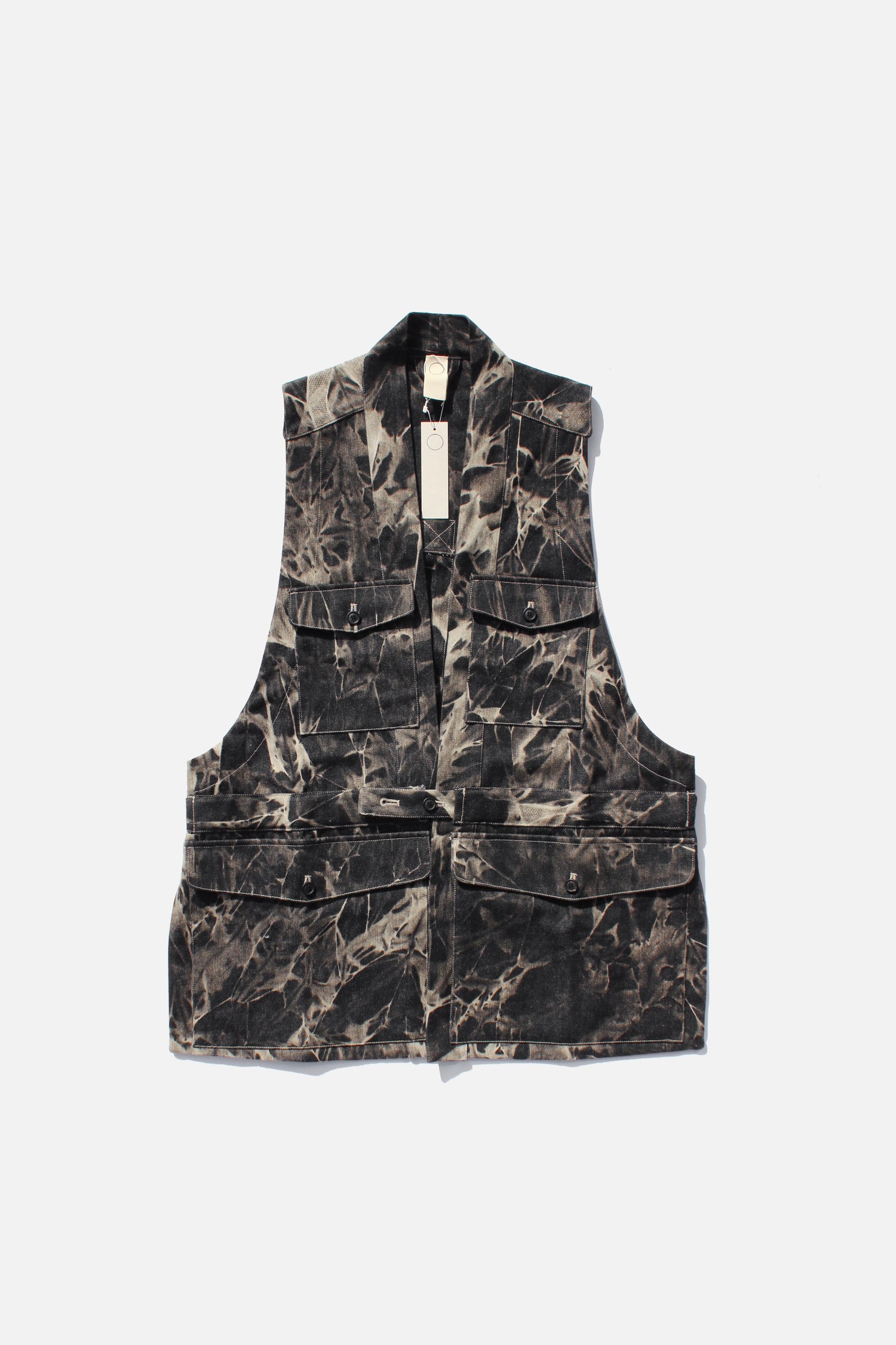This vest of denim is simple yet striking, bleached and wrought like clouds in frame. Large flap pockets are made to carry the essentials of your day. Each vest is unique, no bleach the same.