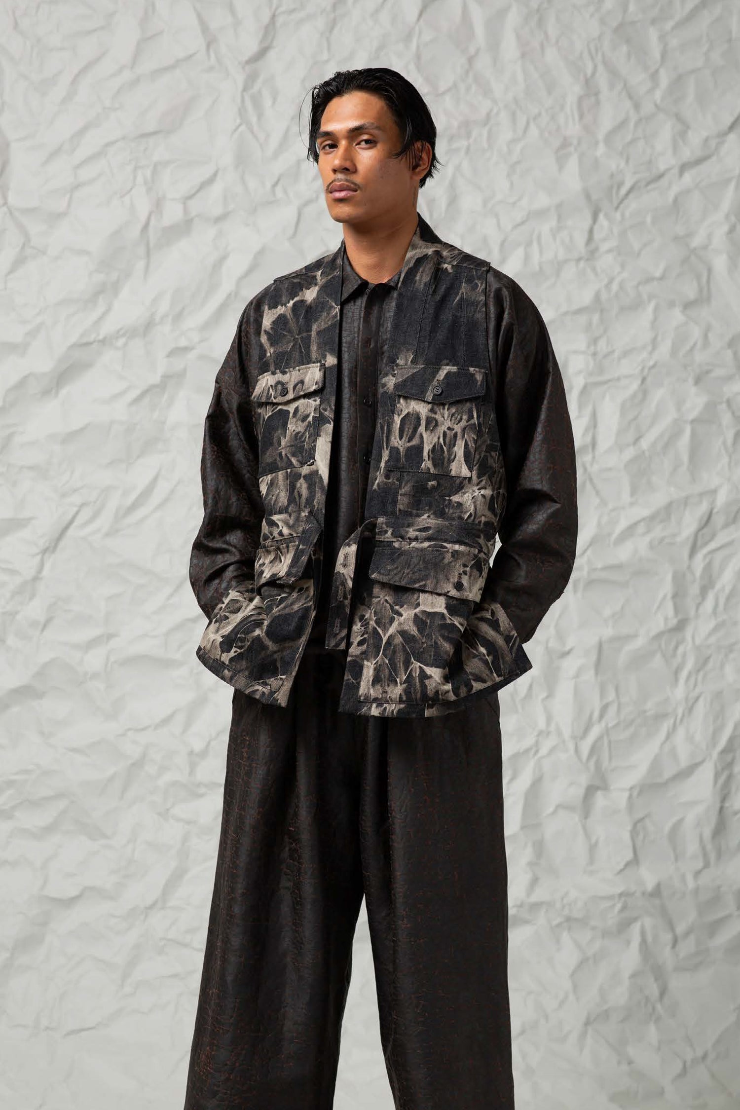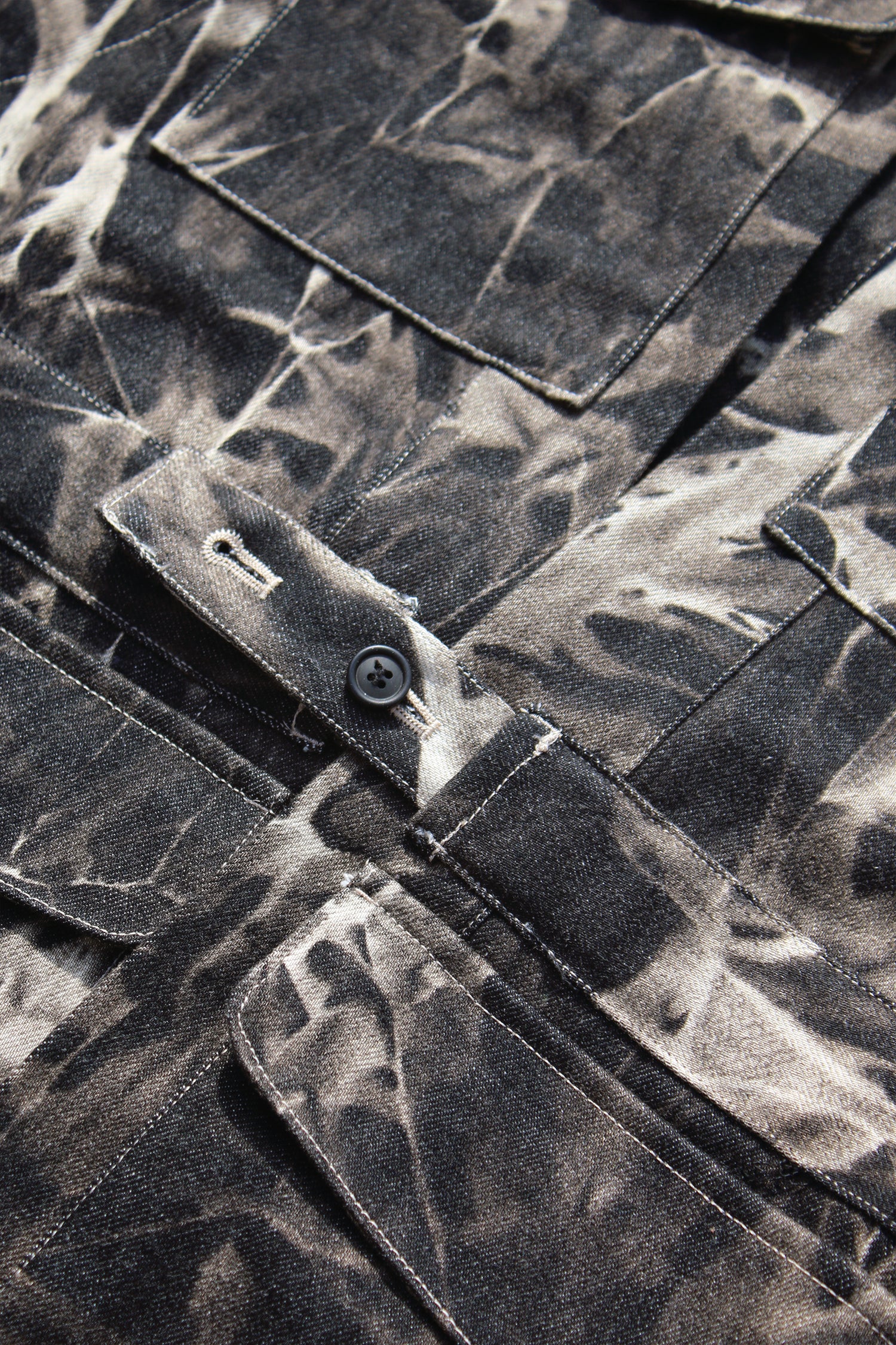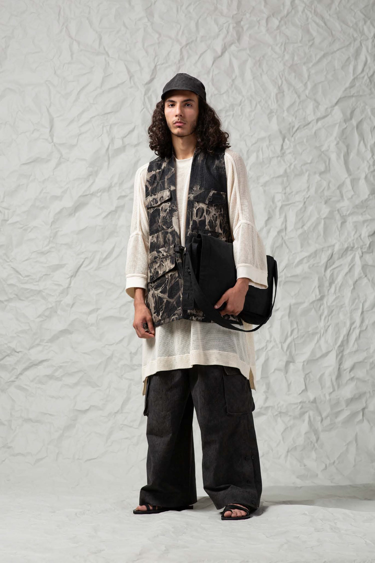 This vest of denim is simple yet striking, bleached and wrought like clouds in frame. Large flap pockets are made to carry the essentials of your day. Each vest is unique, no bleach the same.