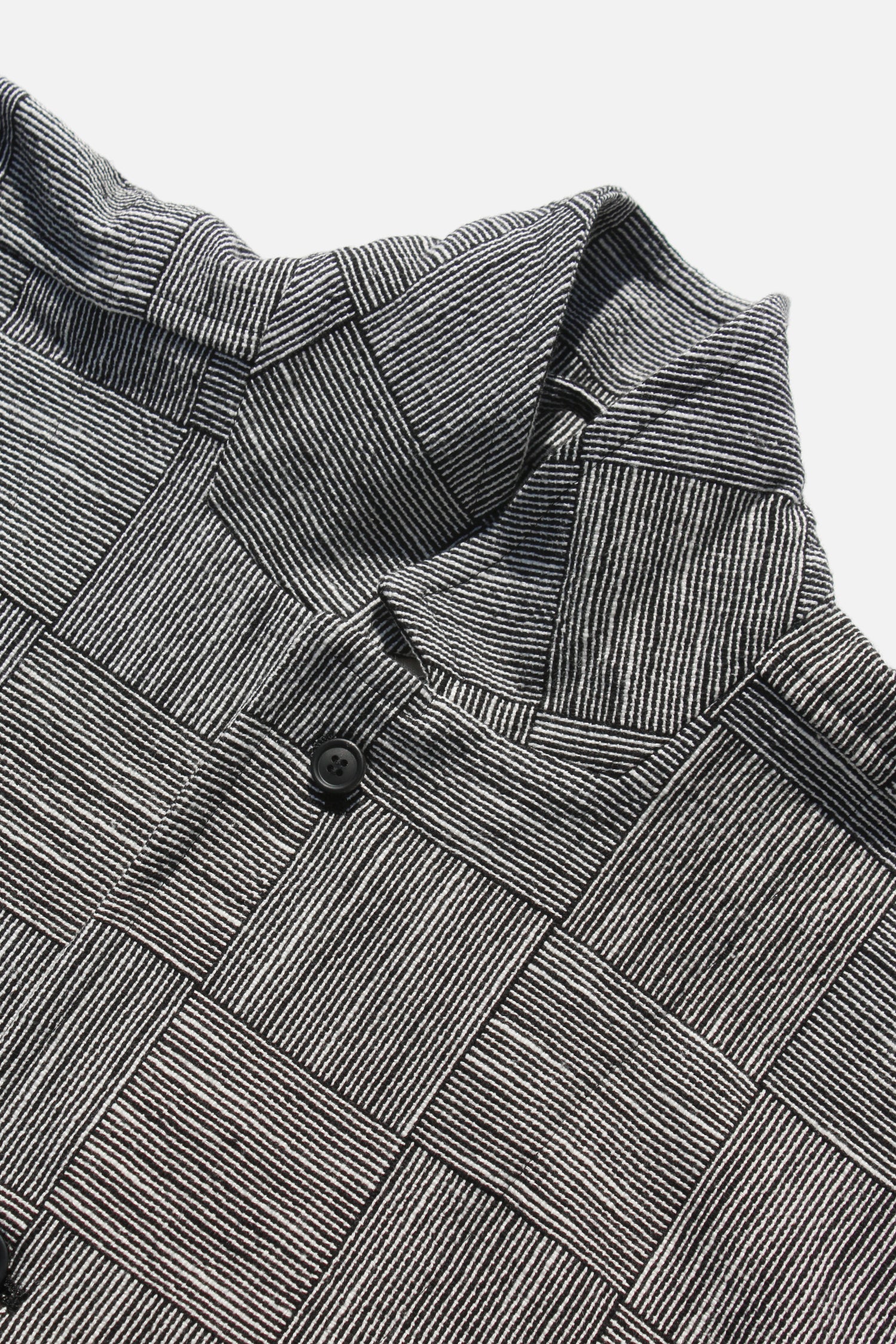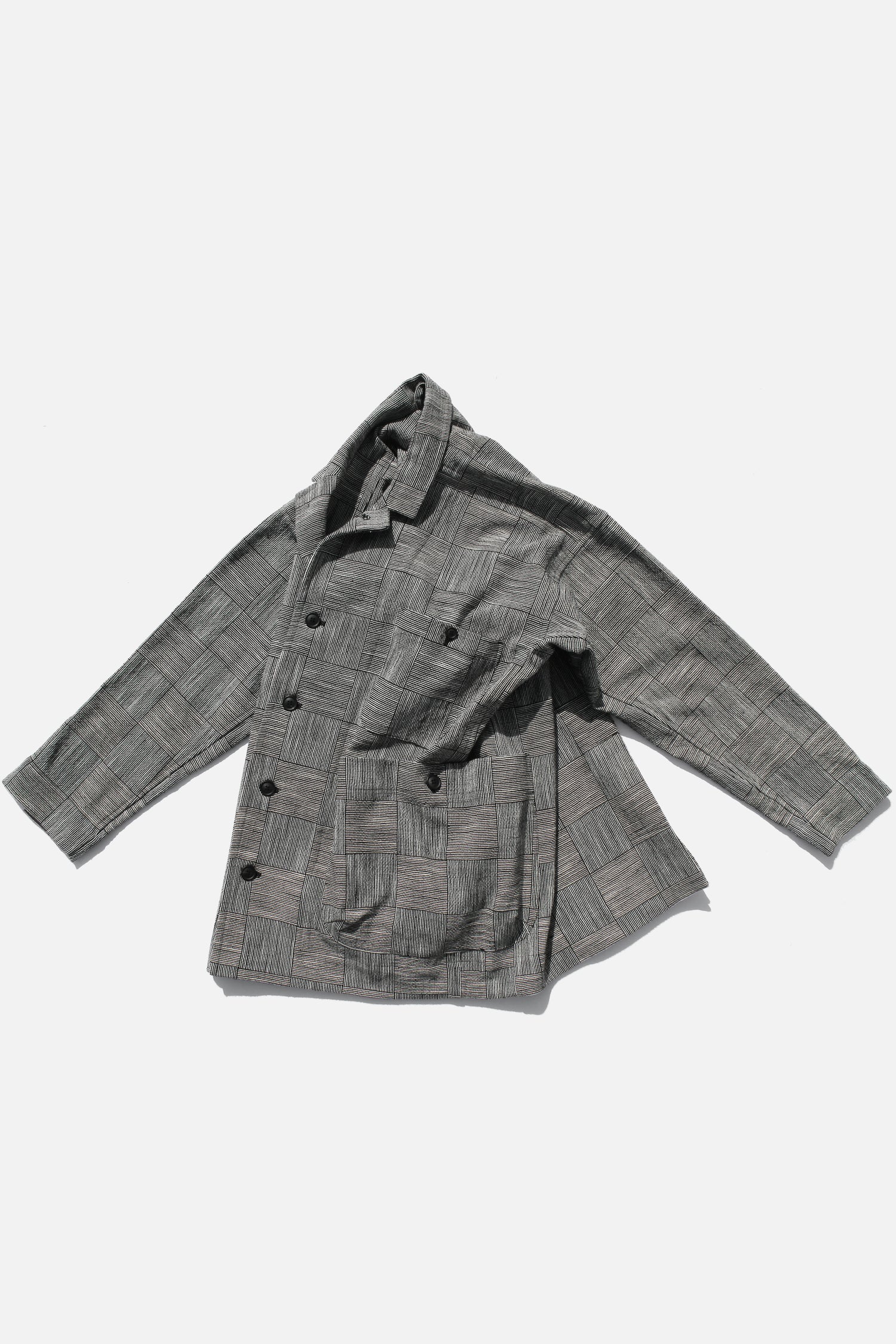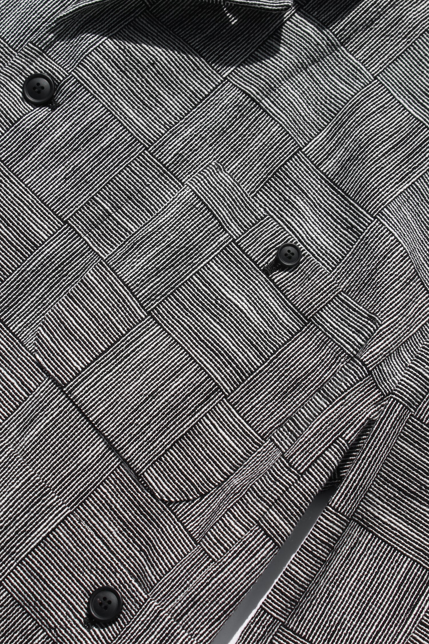A blazer of cotton, the softest hue, blocked and striped in quiet elegance. Details include a very generous cut, chest pocket, inner pocket and side pockets for gathering the unnoticed, and the necessary.