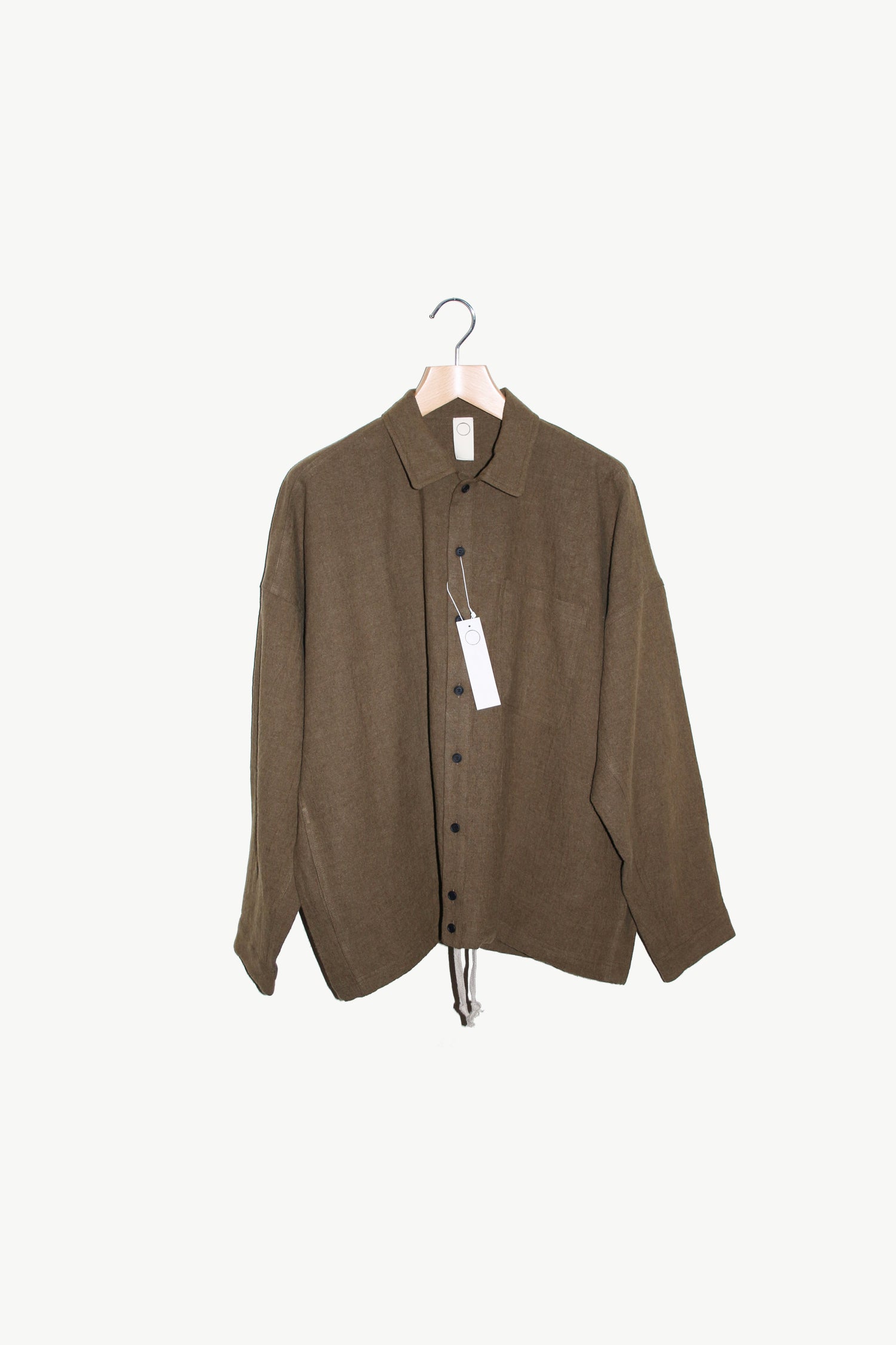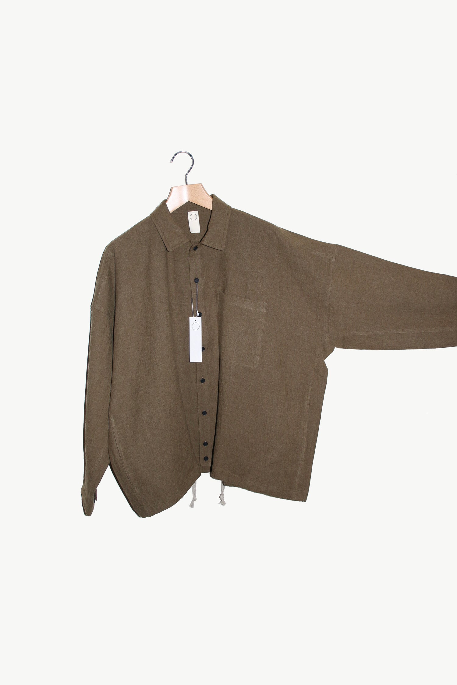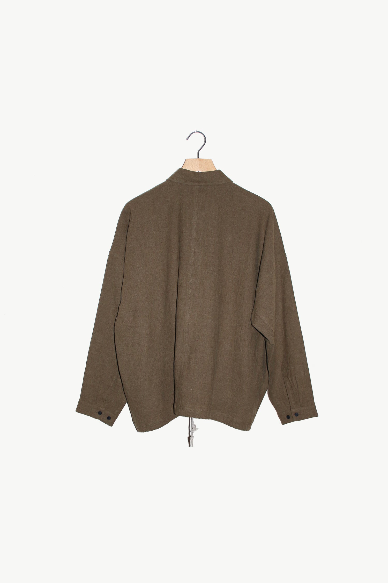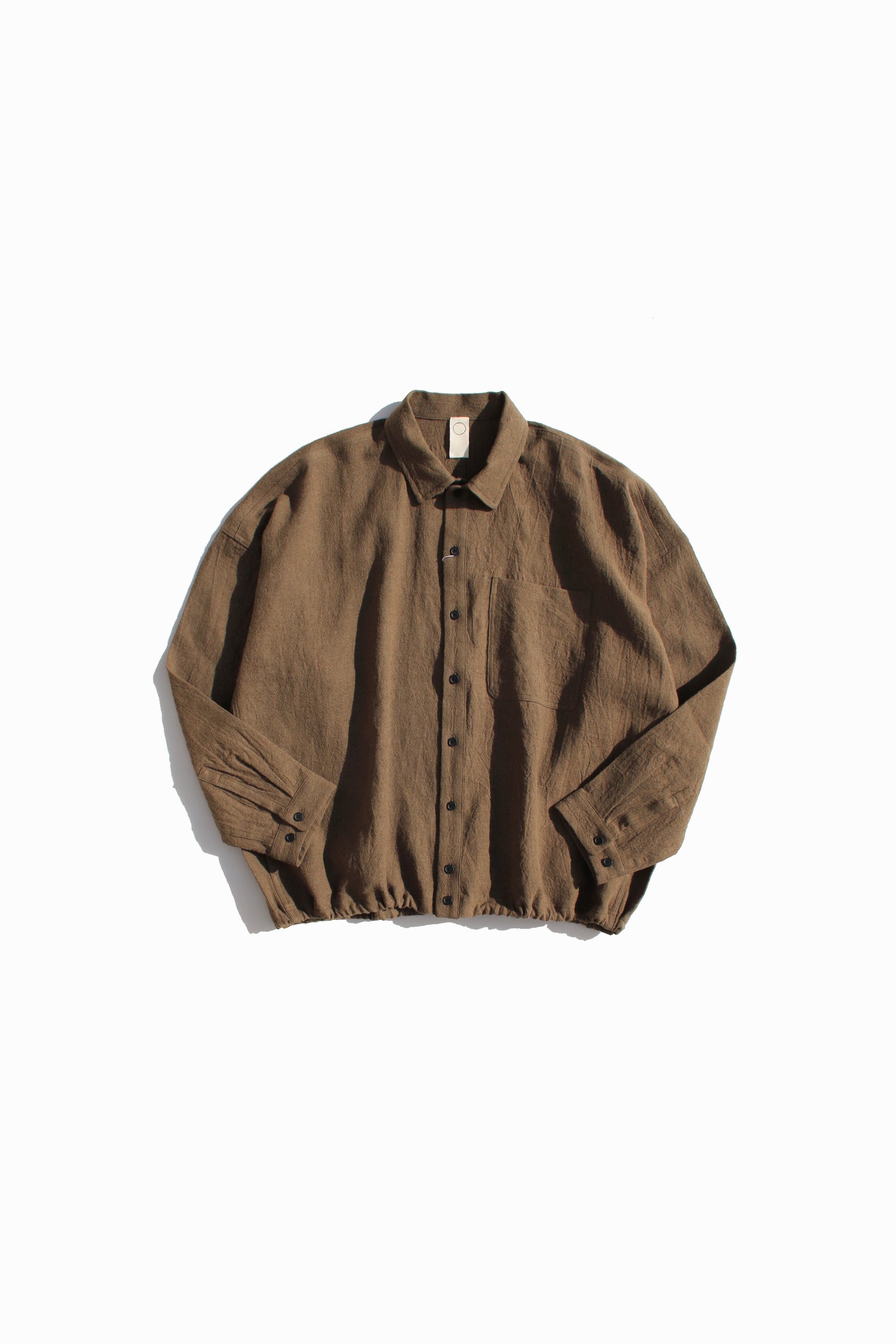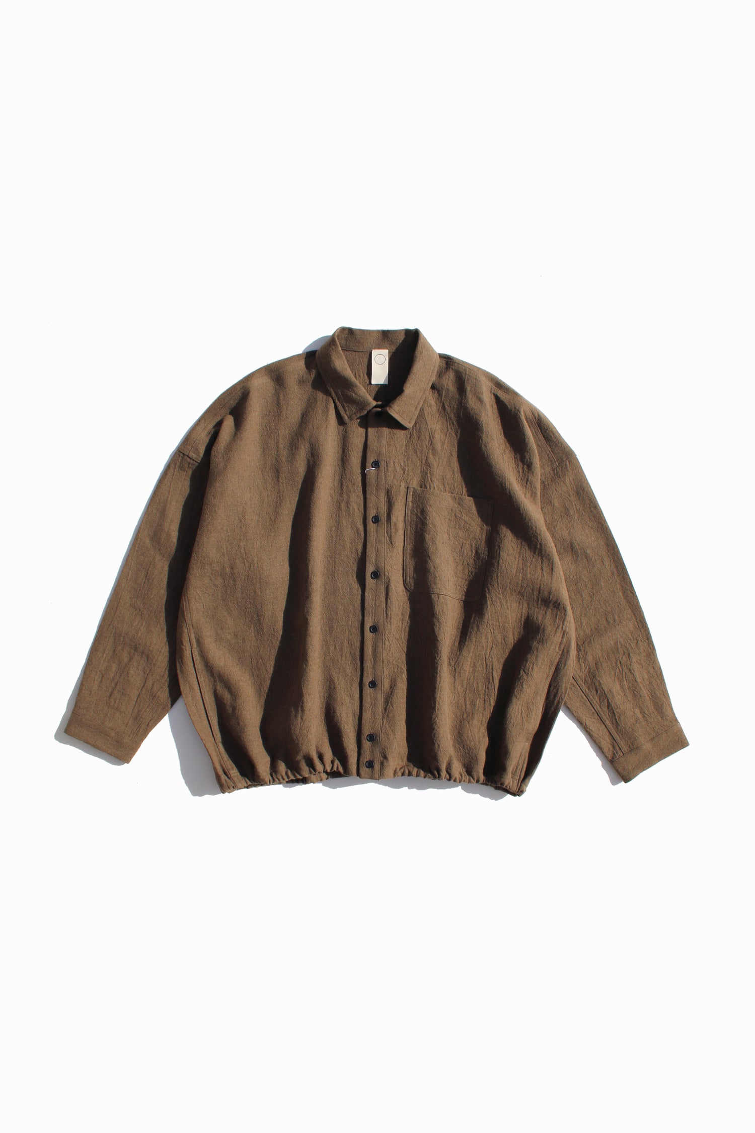 DETAILSClassic bomber shirt from the heart of Japan. Cut in a dry linen and wool blend. A self-fabric front patch pocket and hem drawstring were added, to make the shirt complete for contemporary needs.