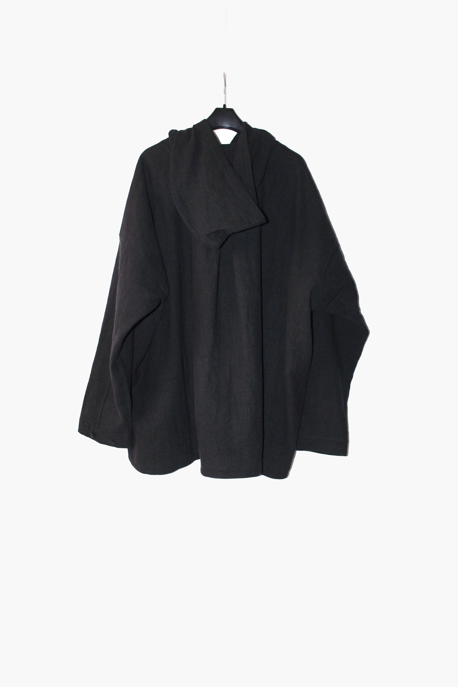 Linen/wool mix shirt with wide dropped shoulders, relaxed fit and square hem with longer back, depicting a more intimate relationship with life's authentic forms. It also has a roomy hood with a subtle button-closure that forms a nice high neckline when not in use. A cosy shirt for the vagaries of the weather.