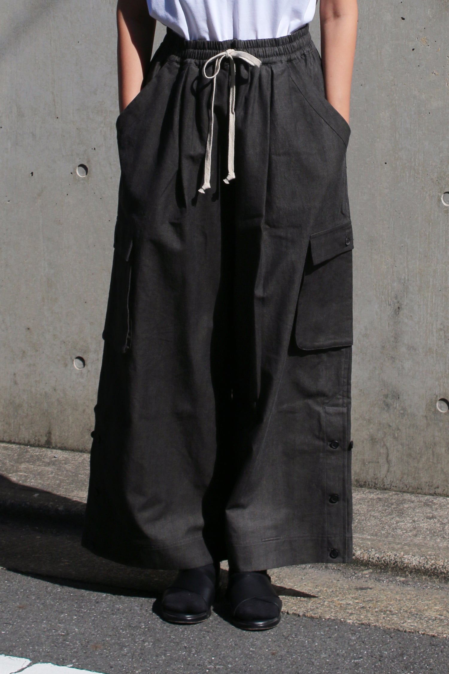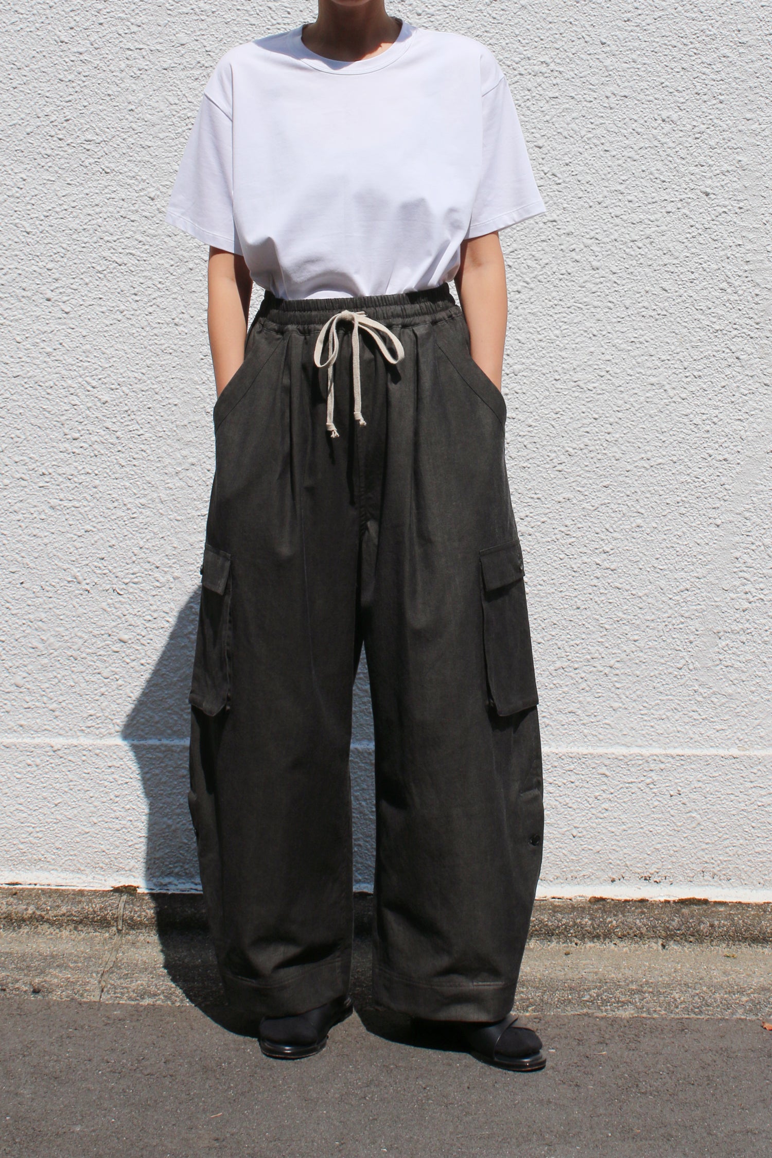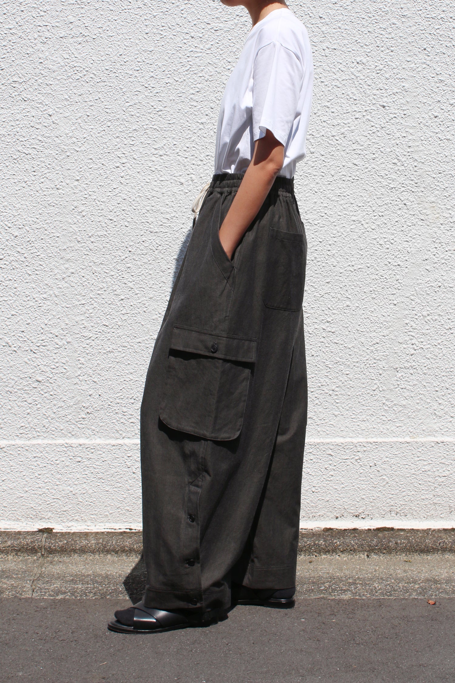 コットン100%を使用したブラッシュドキャンバスカーゴパンツ。股上深めで幅広のワイドシルエットです。カーゴポケット下部から裾元にかけてサイドボタンが採用されているのでシルエットに変化を持たせることができます。ウエストはゴム仕様で、コットン紐がアクセントになっており、男女問わず着用していただけます。