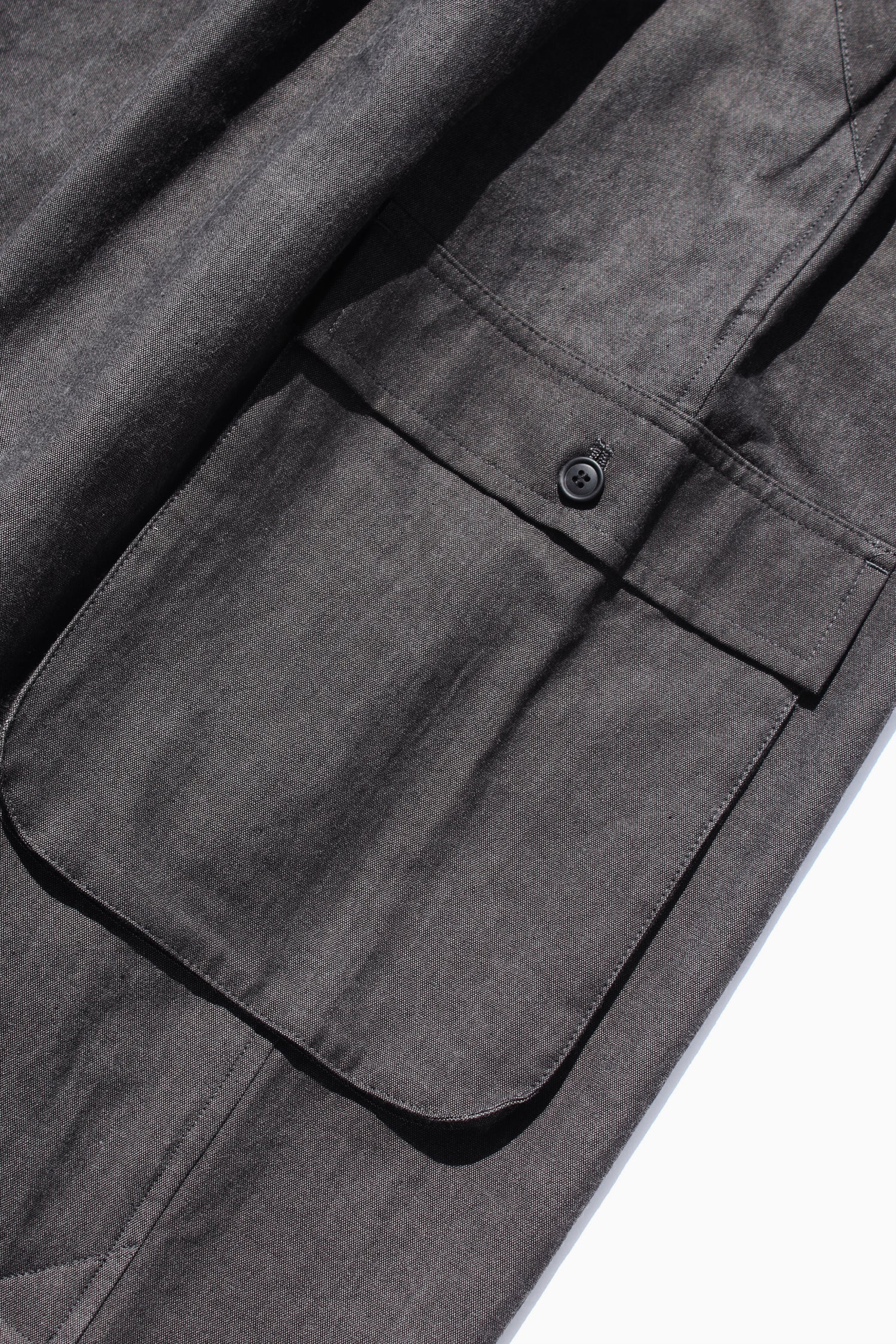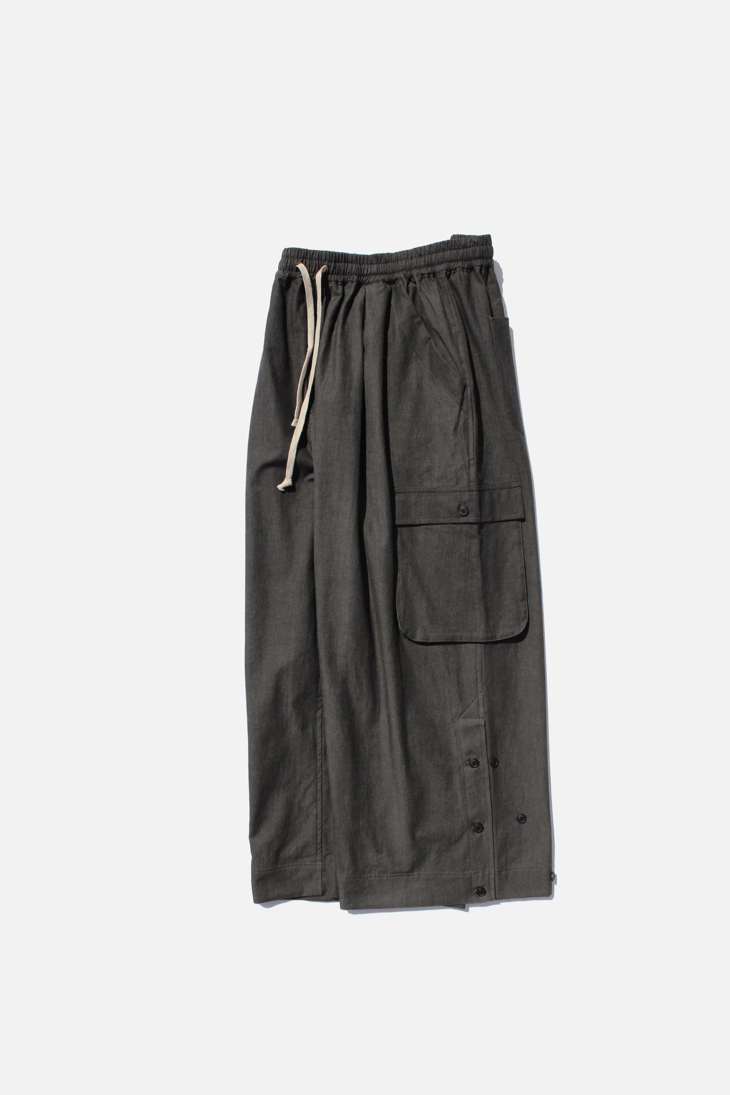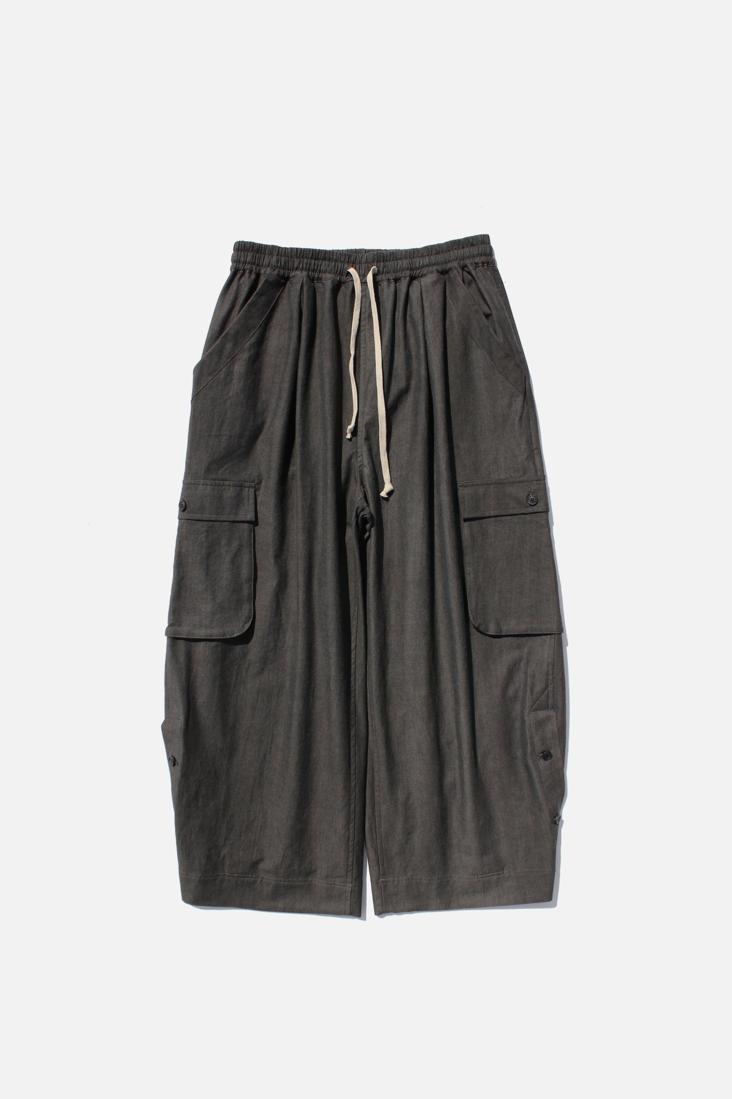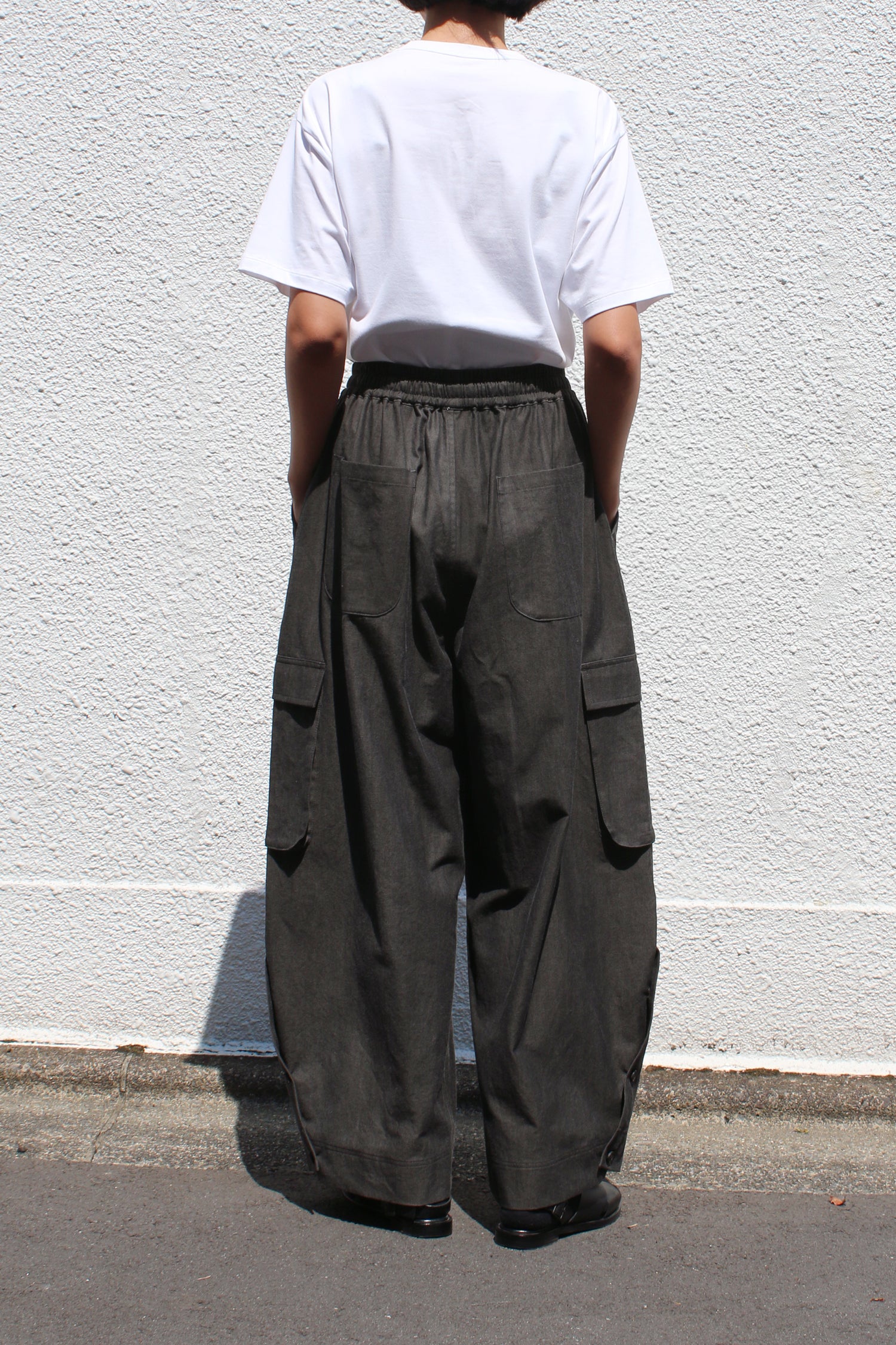 コットン100%を使用したブラッシュドキャンバスカーゴパンツ。股上深めで幅広のワイドシルエットです。カーゴポケット下部から裾元にかけてサイドボタンが採用されているのでシルエットに変化を持たせることができます。ウエストはゴム仕様で、コットン紐がアクセントになっており、男女問わず着用していただけます。