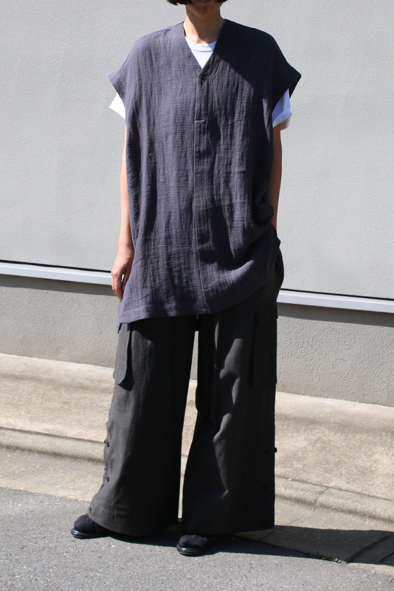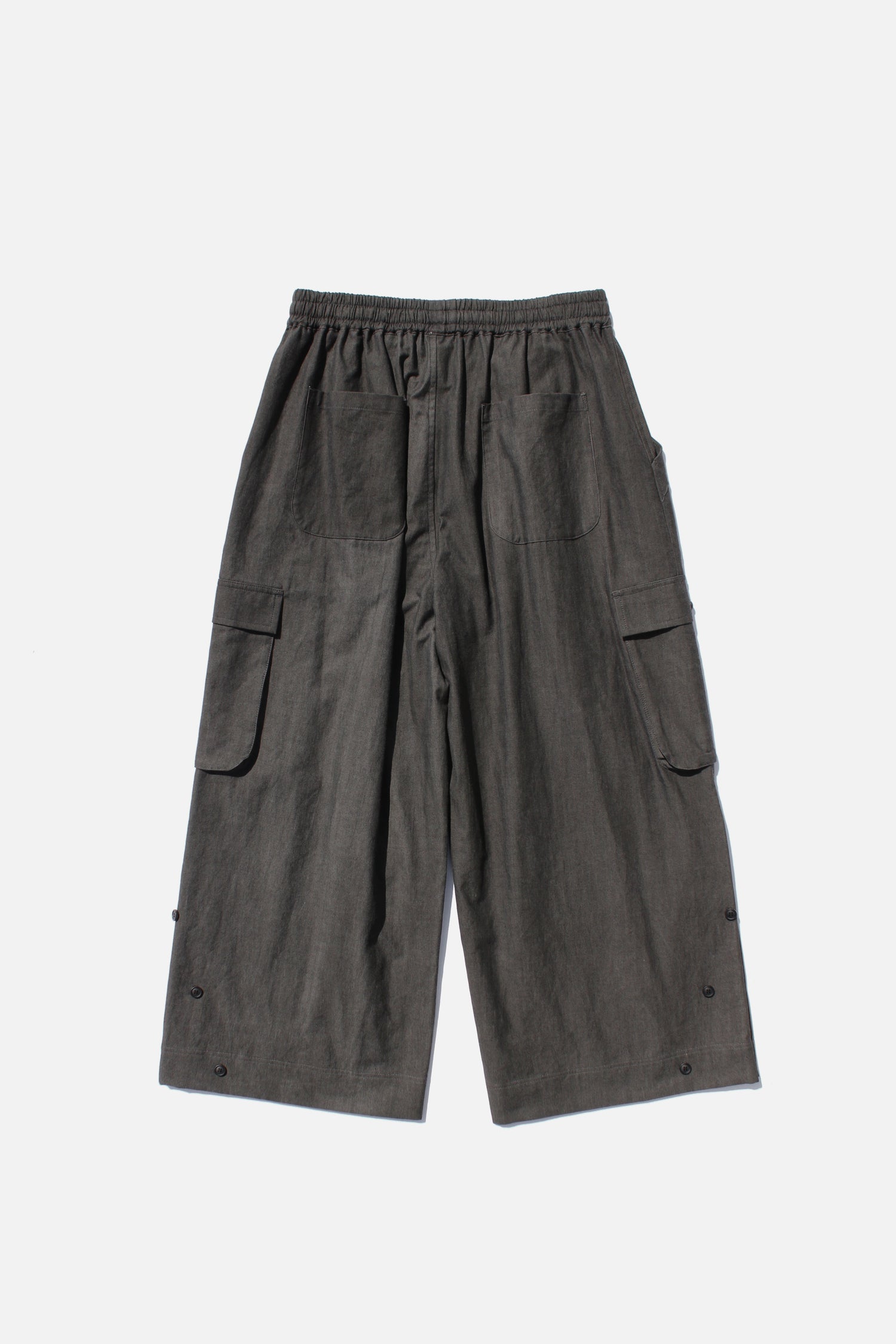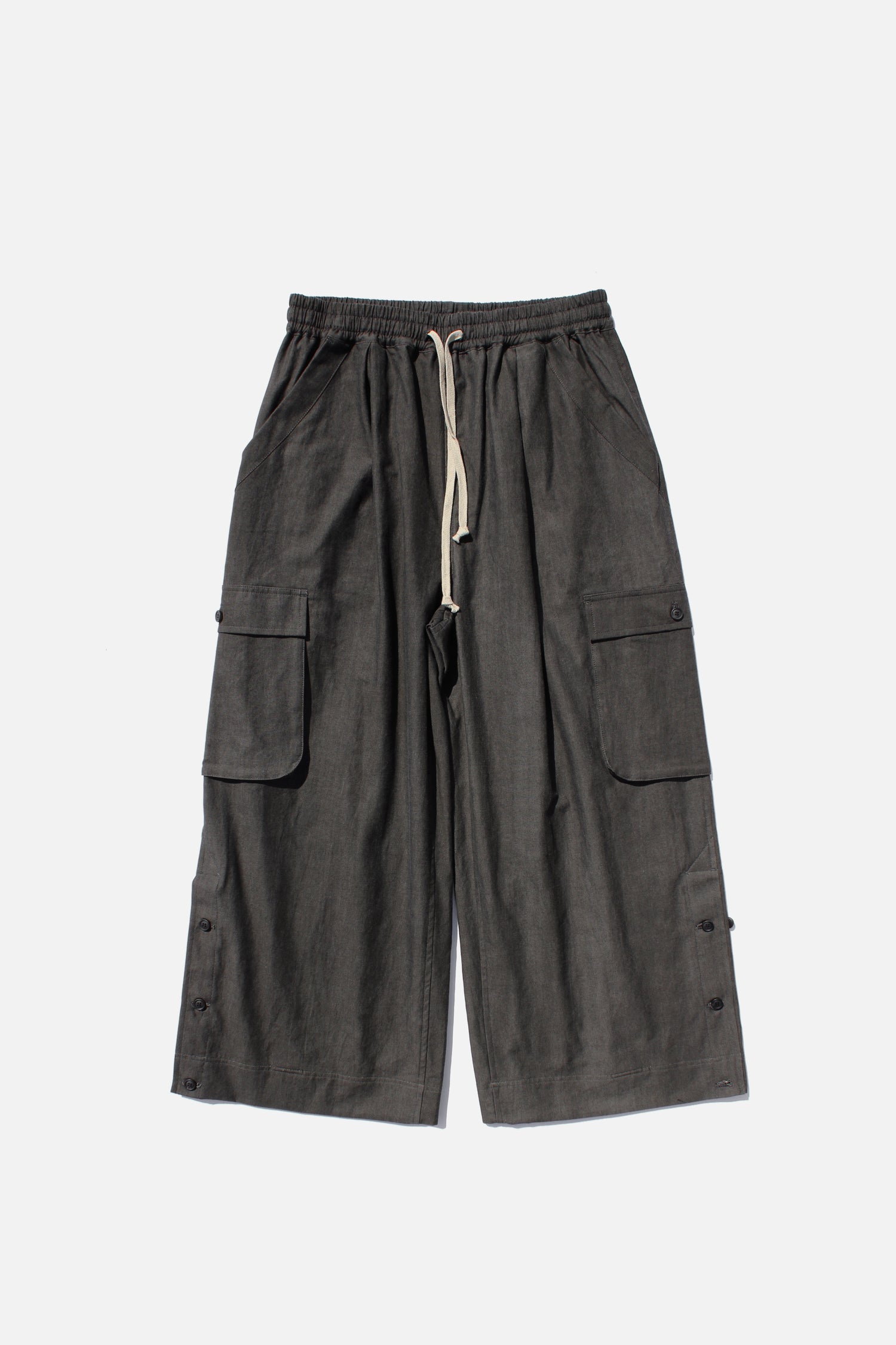 A wide cargo pants of brushed canvas, made from soft cotton, sturdy yet tender to the touch. It comes with deep rise, elastic waist tugged by a drawstring, cargo pockets ready for the task, and buttons at the hem for shifting the shape and the stance.