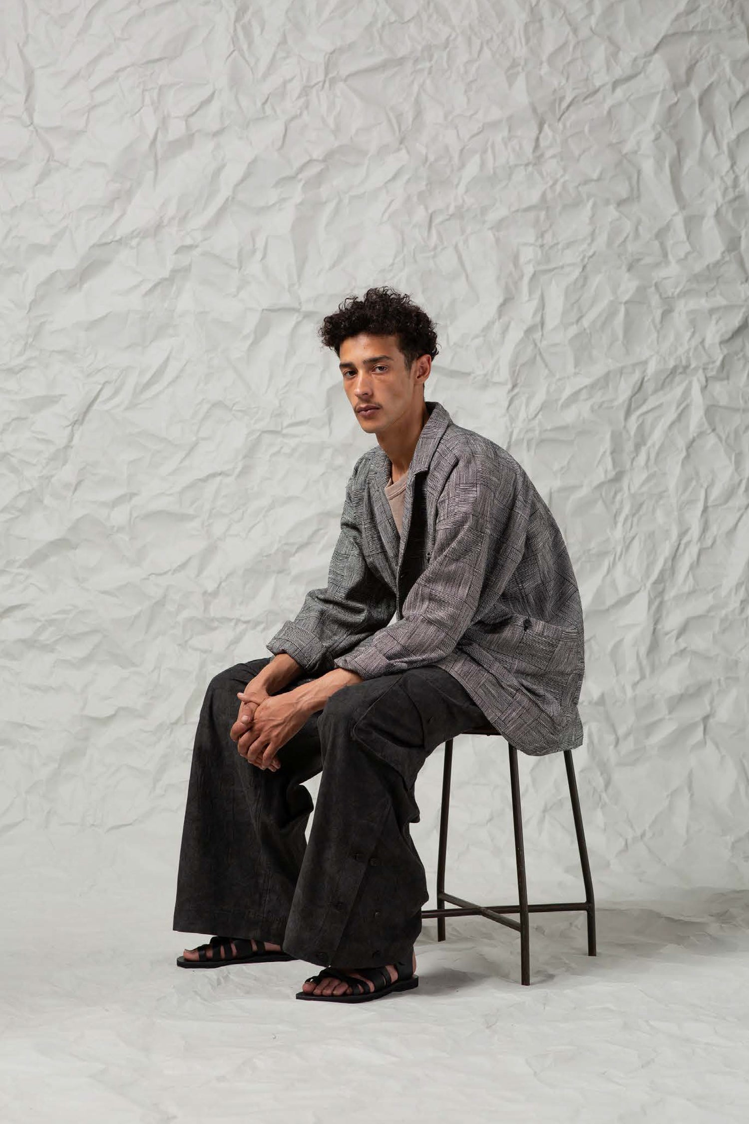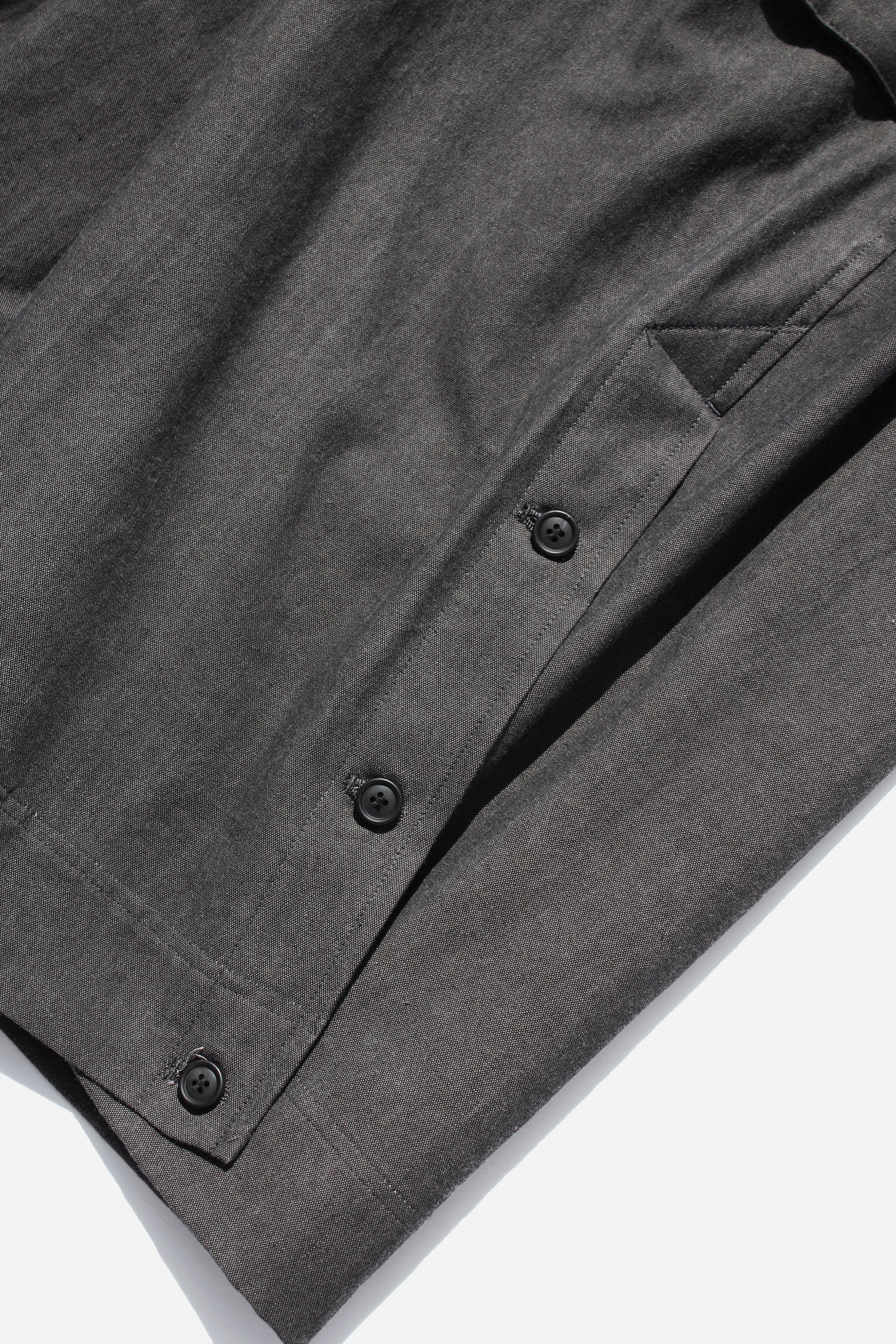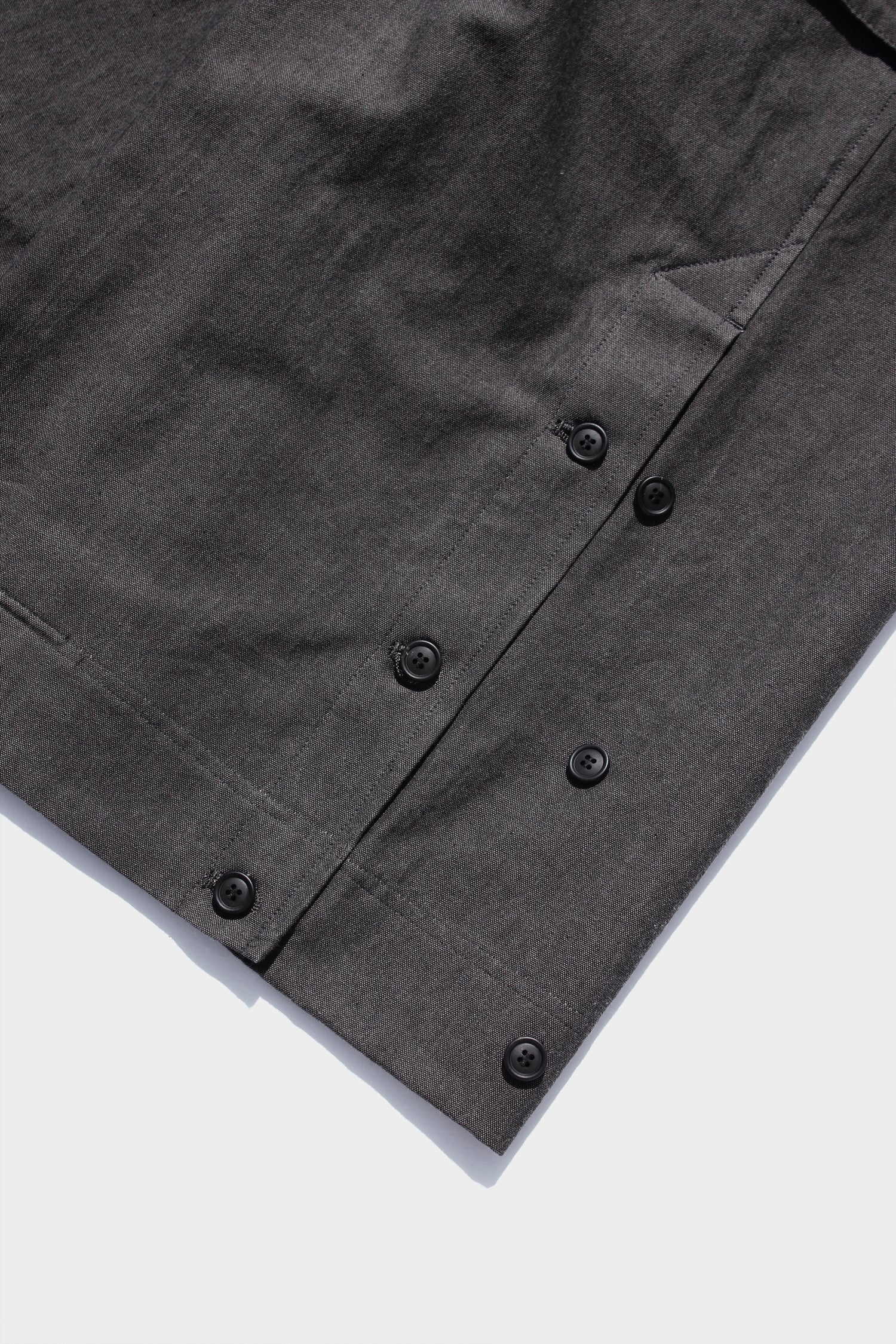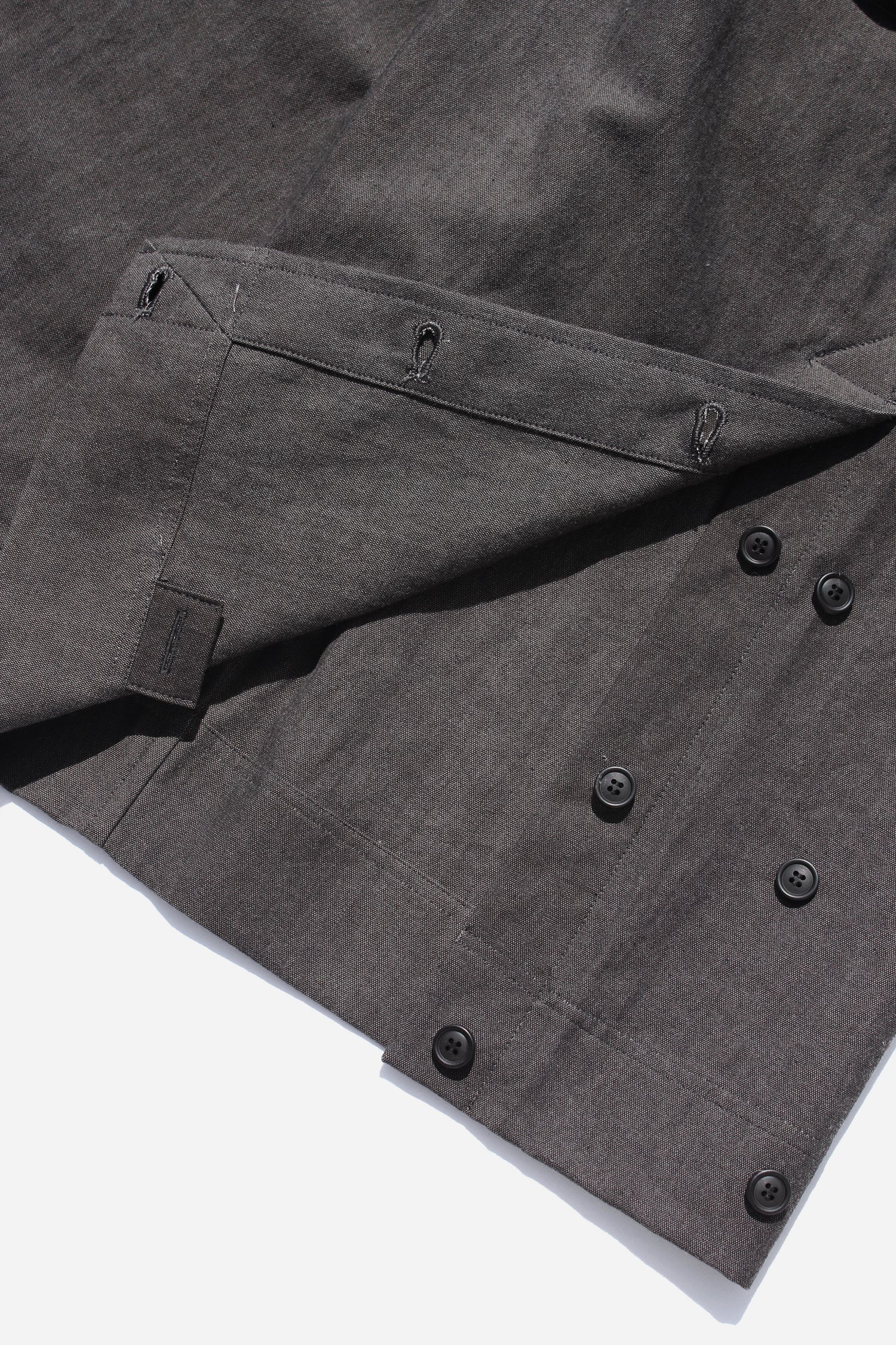 A wide cargo pants of brushed canvas, made from soft cotton, sturdy yet tender to the touch. It comes with deep rise, elastic waist tugged by a drawstring, cargo pockets ready for the task, and buttons at the hem for shifting the shape and the stance.