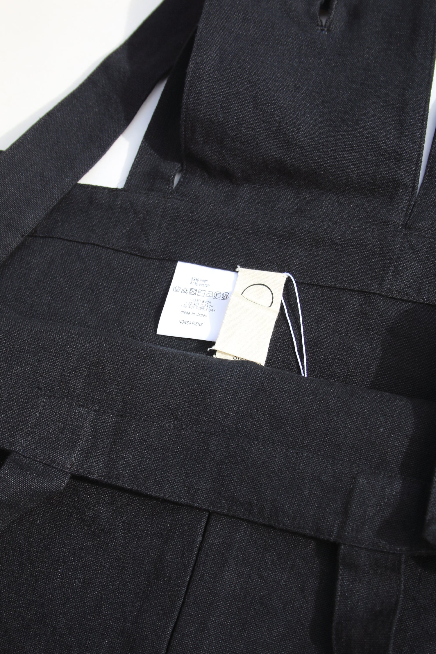59%リネン、41%コットンの生地を使用し軽量ながらも耐久性に優れたキャンバスキャリーバッグです。外側には小物が入るパッチポケット付きのシンプルなデザイン。ベルトのボタンでシルエットの調節可能です。大きめのサイズ感ですが、折り畳むことも可能です。こちらは、Black。