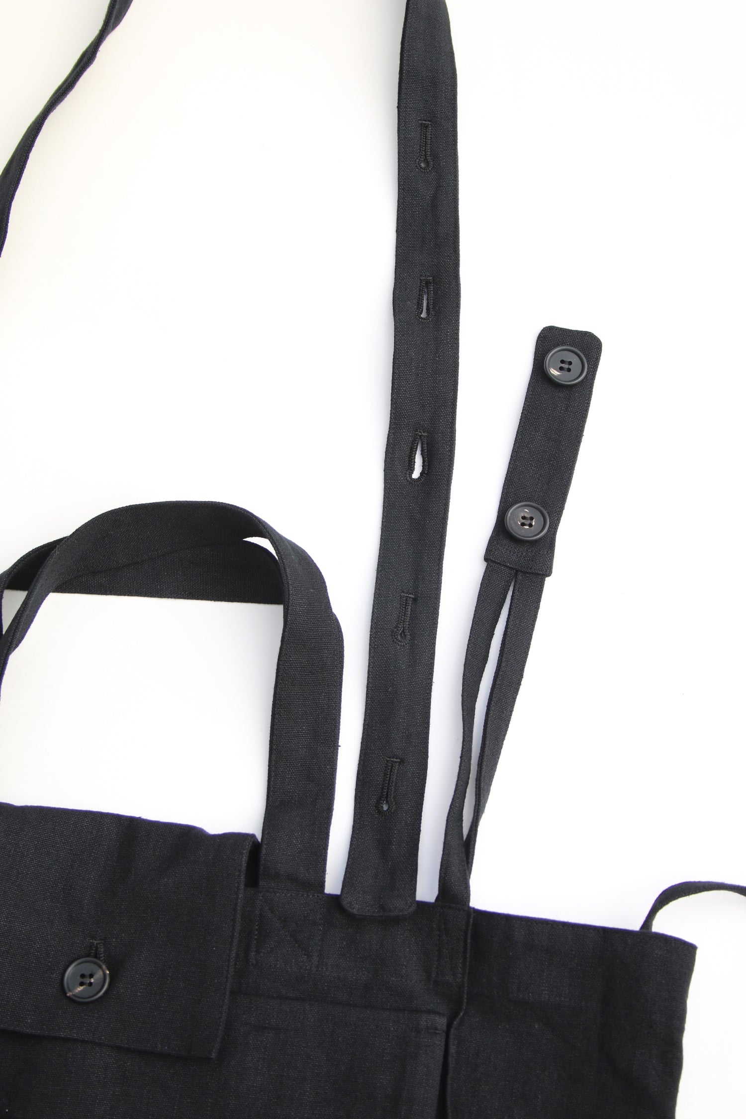 A portable 2-way carry-it-all bag crafted in fine linen cotton. Details with a discreet front pocket and a flexible (button-adjustment) straps, which allow you to increase the volume.