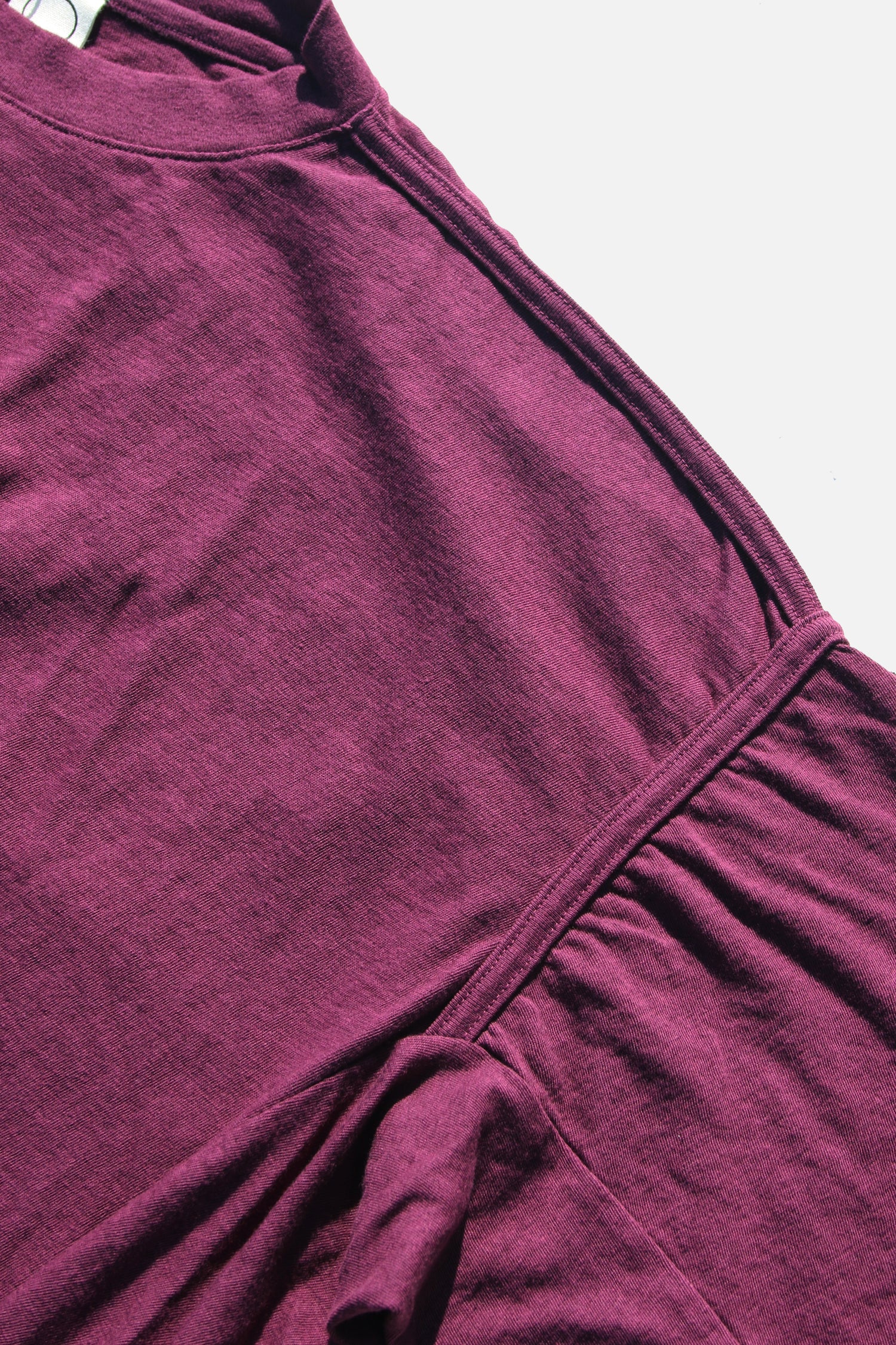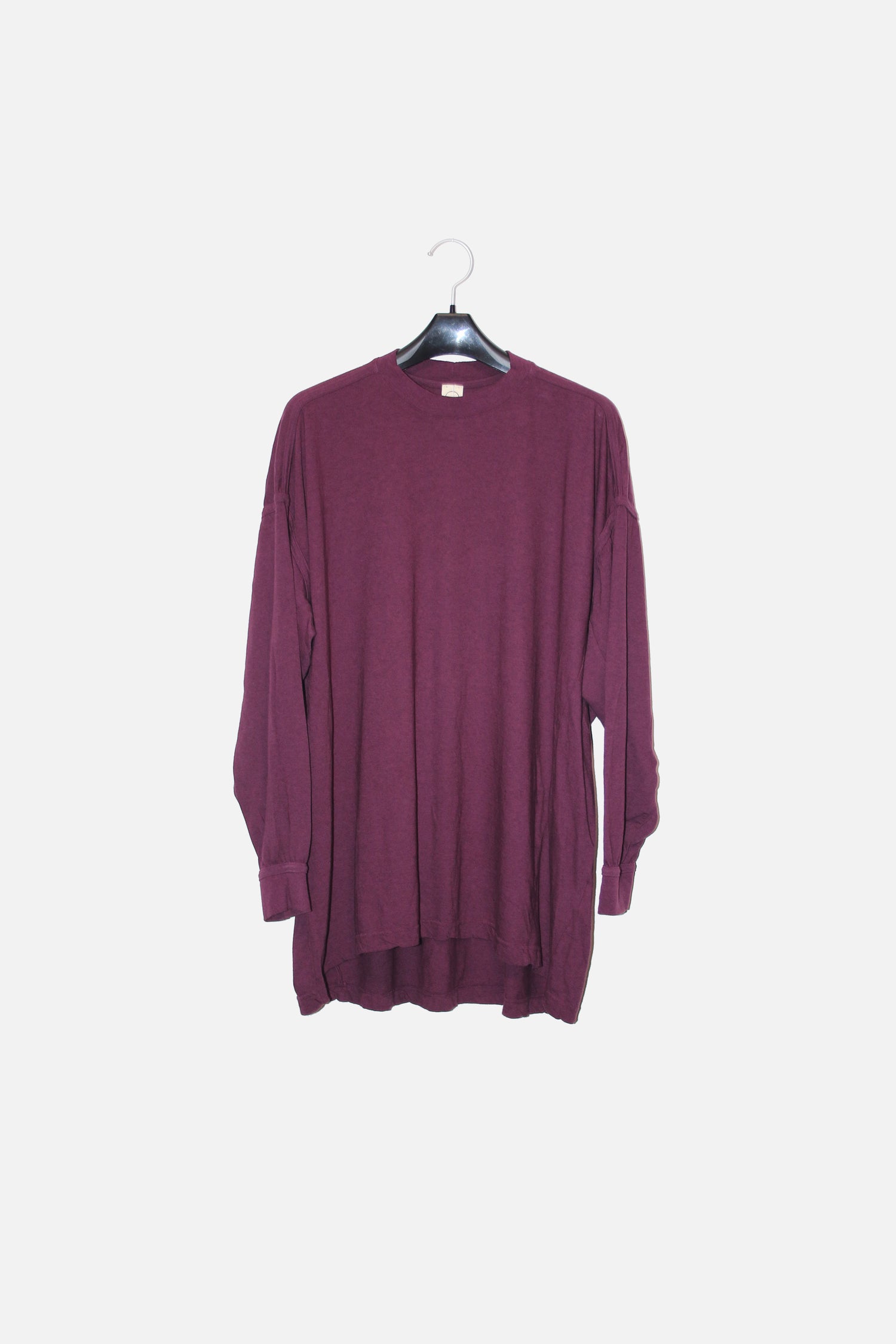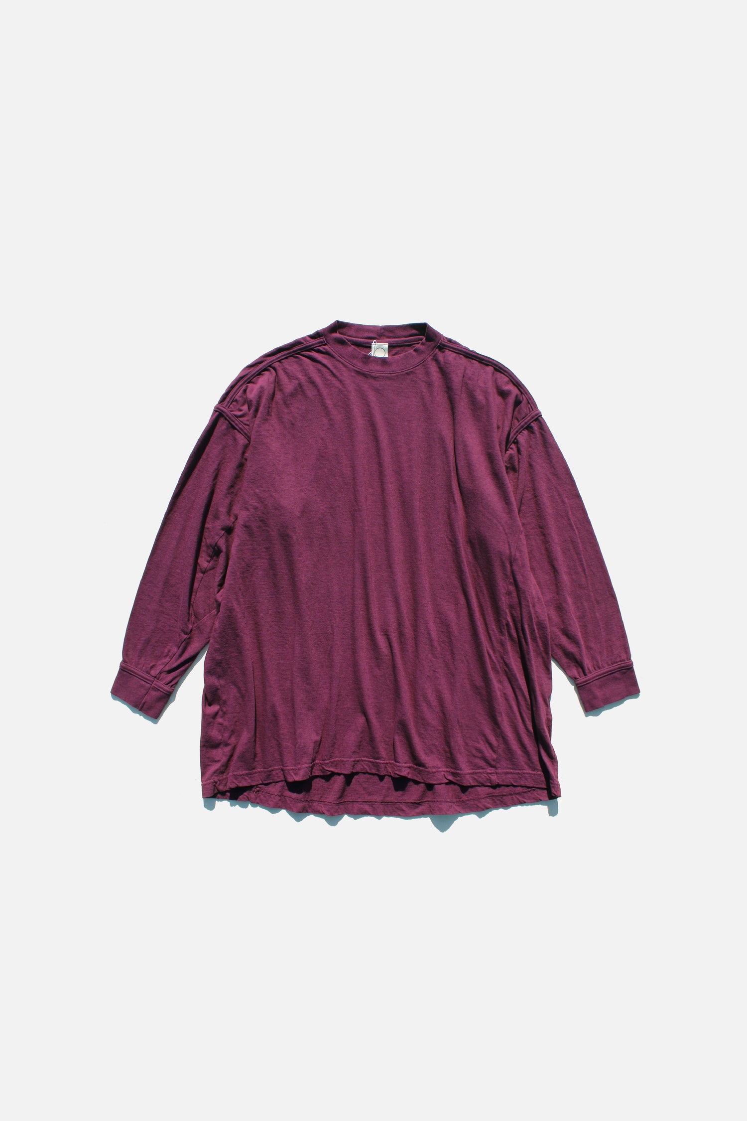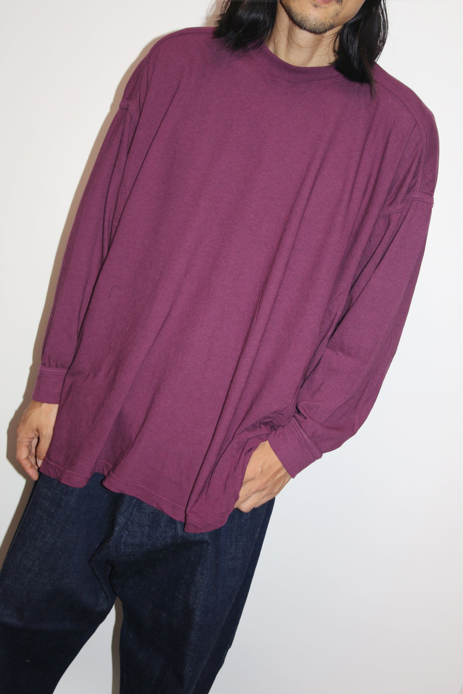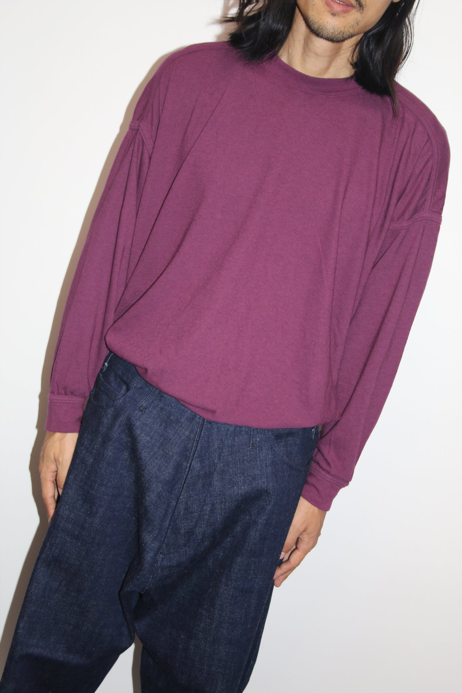 Crewneck long sleeve tees are very well worth the wait. Cotton and wool, incredibly comfortable and perfect relaxed-fit. Dropped-shoulder and square hem with longer back. Wear it often and wear it loose with a kind of magenta purple.