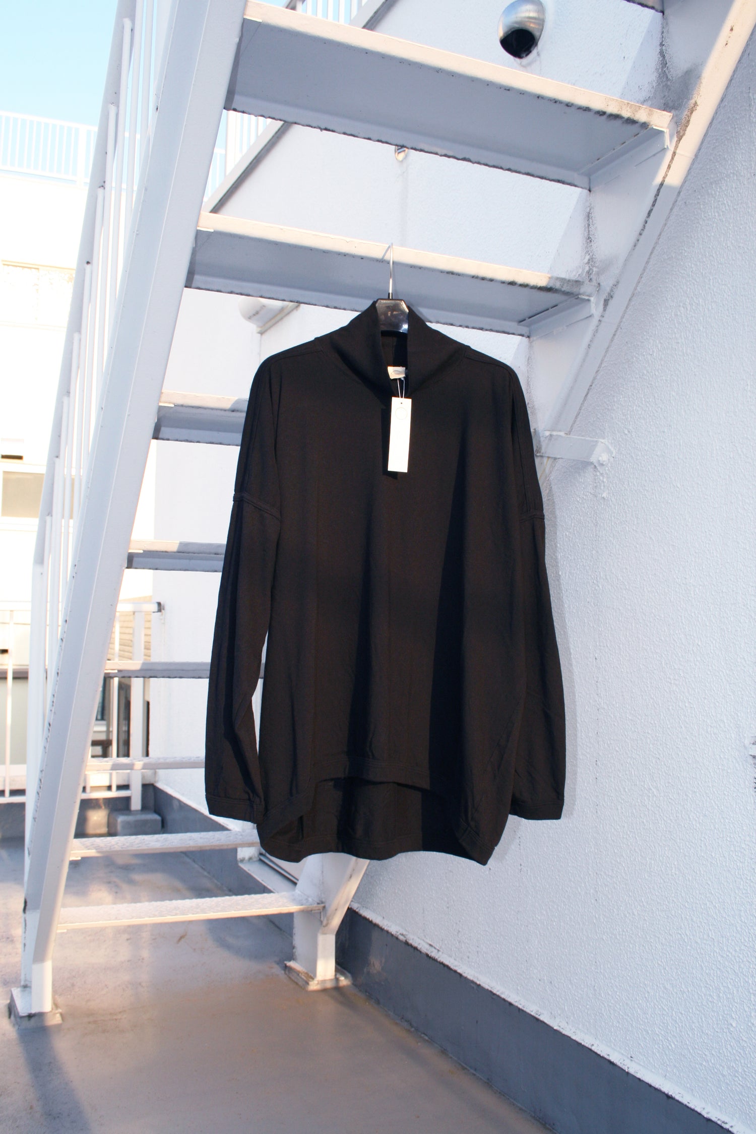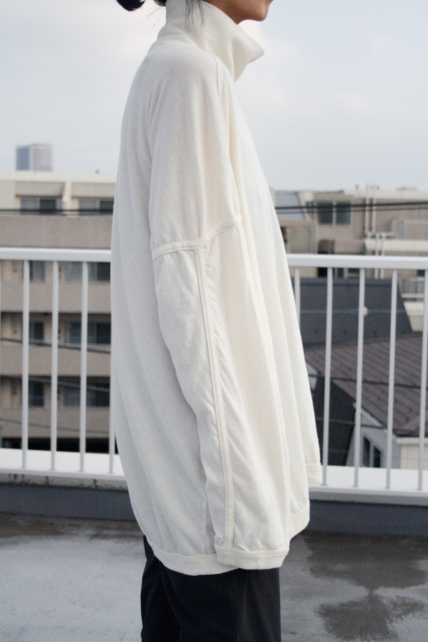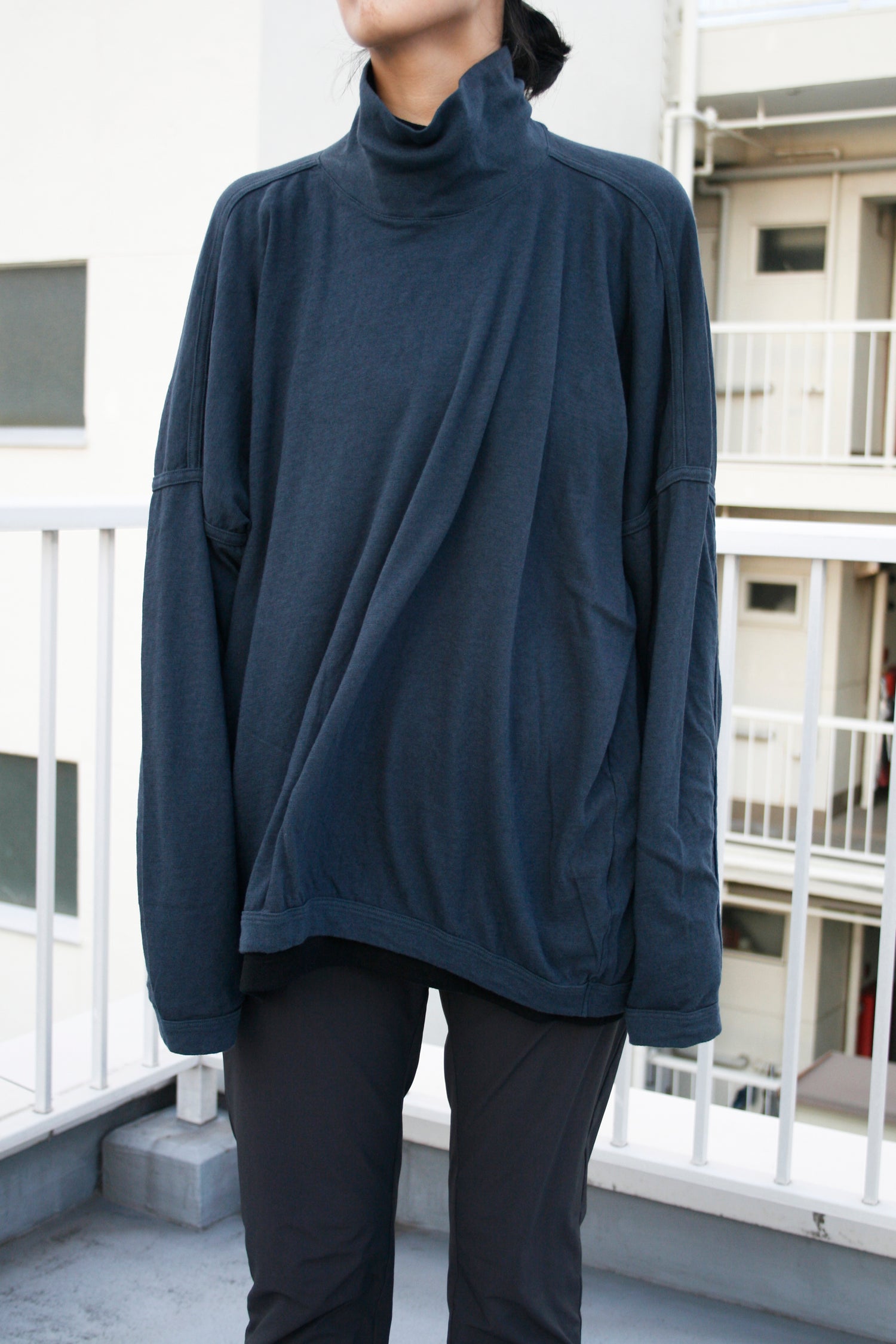ドロップショルダーのシンプルなゆったりとしたシルエットTシャツ。タートルネックで展開します。ドライな風合いが特徴のコットンウールジャージーでシンプルかつ上品に製作しました。どんなスタイリングにも相性の良い、キナリ・スチール・ナイトブルー・ブラックのベーシックな4色展開。高い保温性や保湿性を持ちます。着心地は、滑らかで、肌触りにこだわった一枚。リラックス感のあるコーディネートに映えるアイテムです。