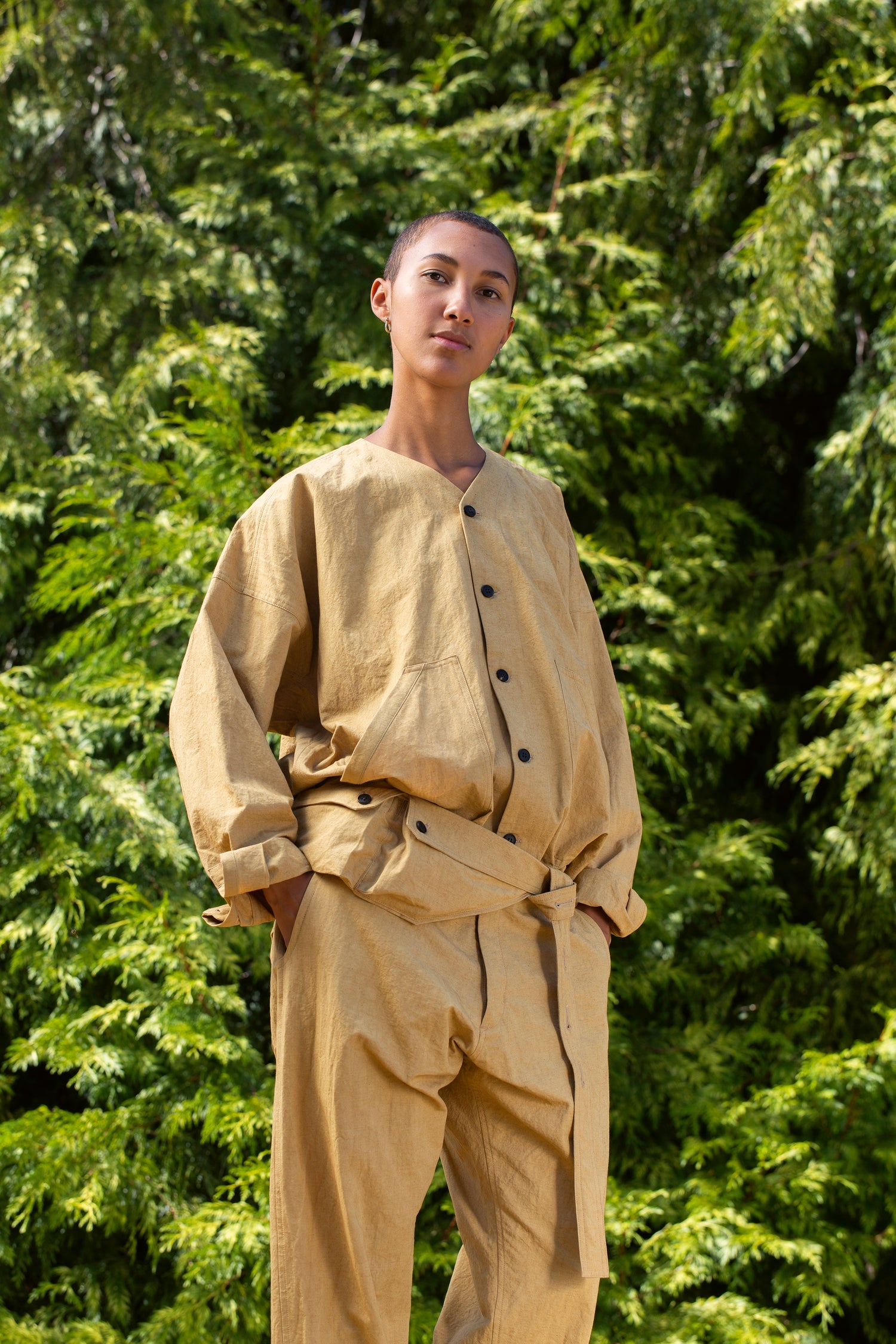 DETAILSClassic COVERALL SHIRT in mustard. Crafted from a blend of cotton and linen, it's soft and a little wrinkled for a casual vibe. Featuring hand pockets, no-collar and a loose fit that keeps you comfortable all day. A noble outwear piece.