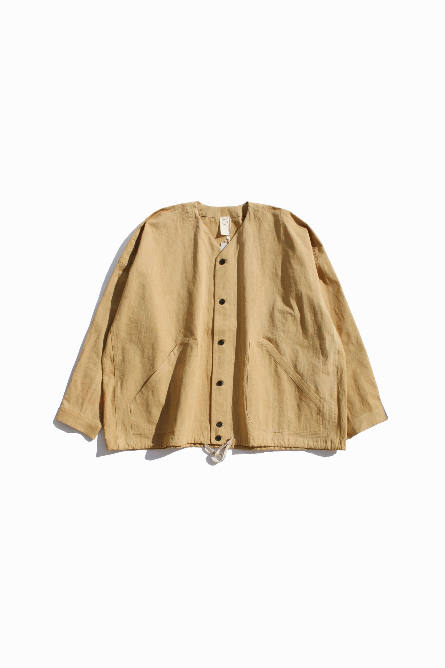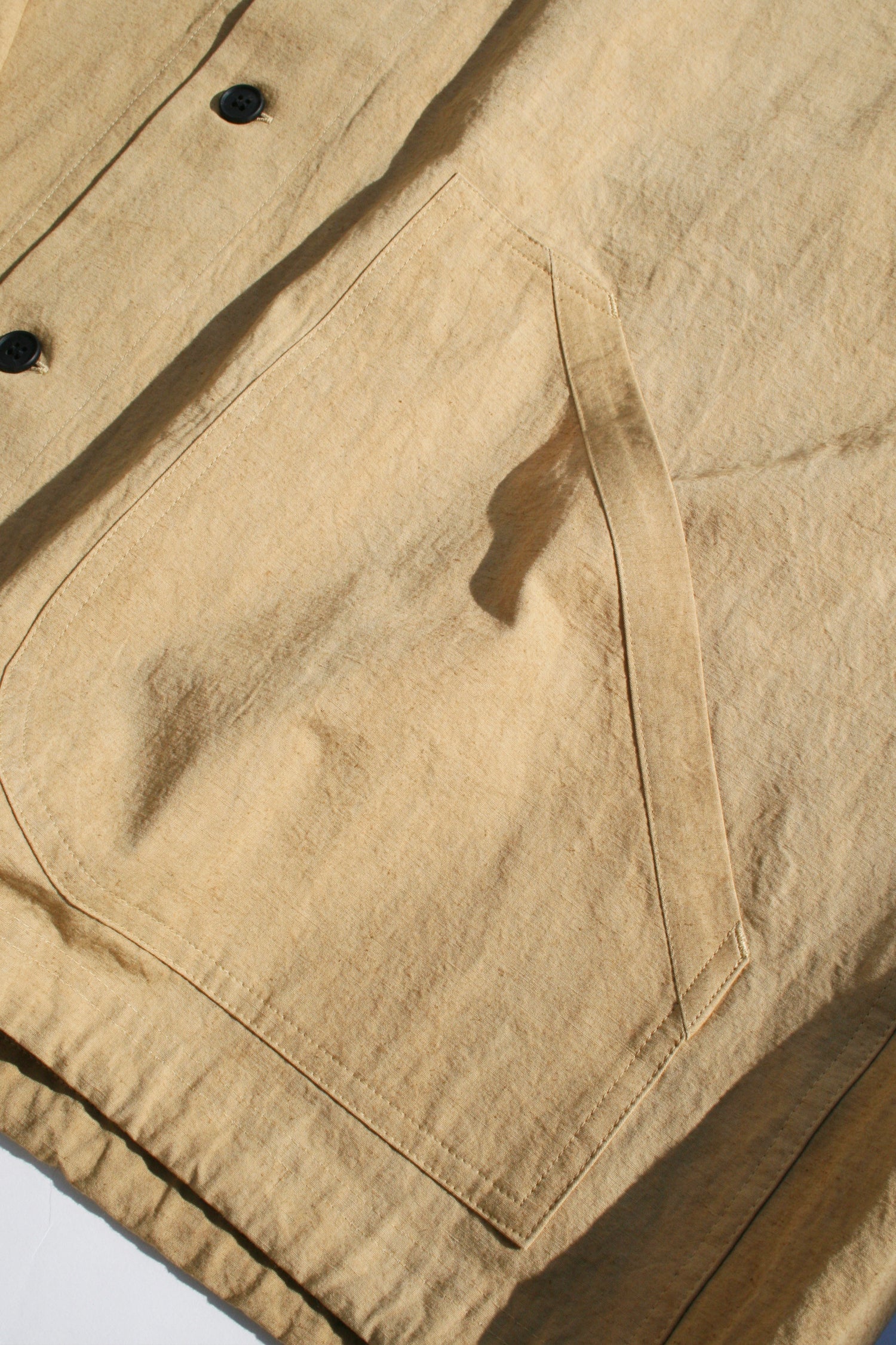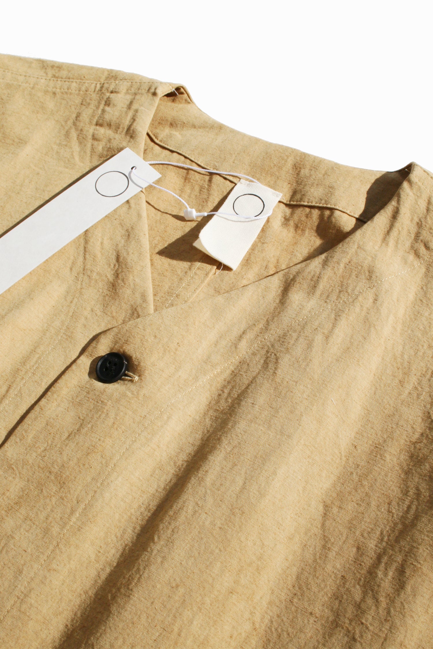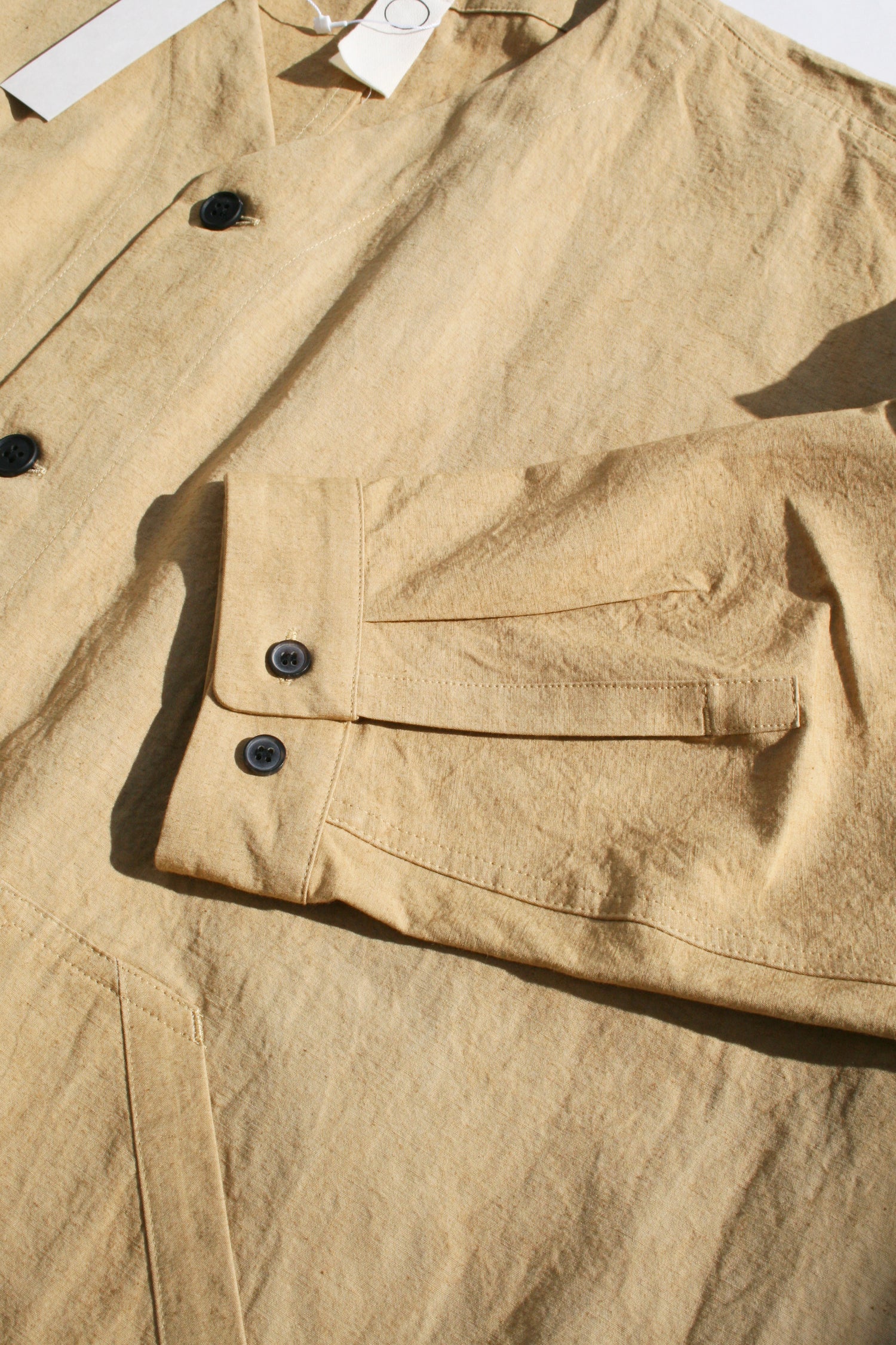 Classic COVERALL SHIRT in mustard. Crafted from a blend of cotton and linen, it's soft and a little wrinkled for a casual vibe. Featuring hand pockets, no-collar and a loose fit that keeps you comfortable all day. A noble outwear piece.