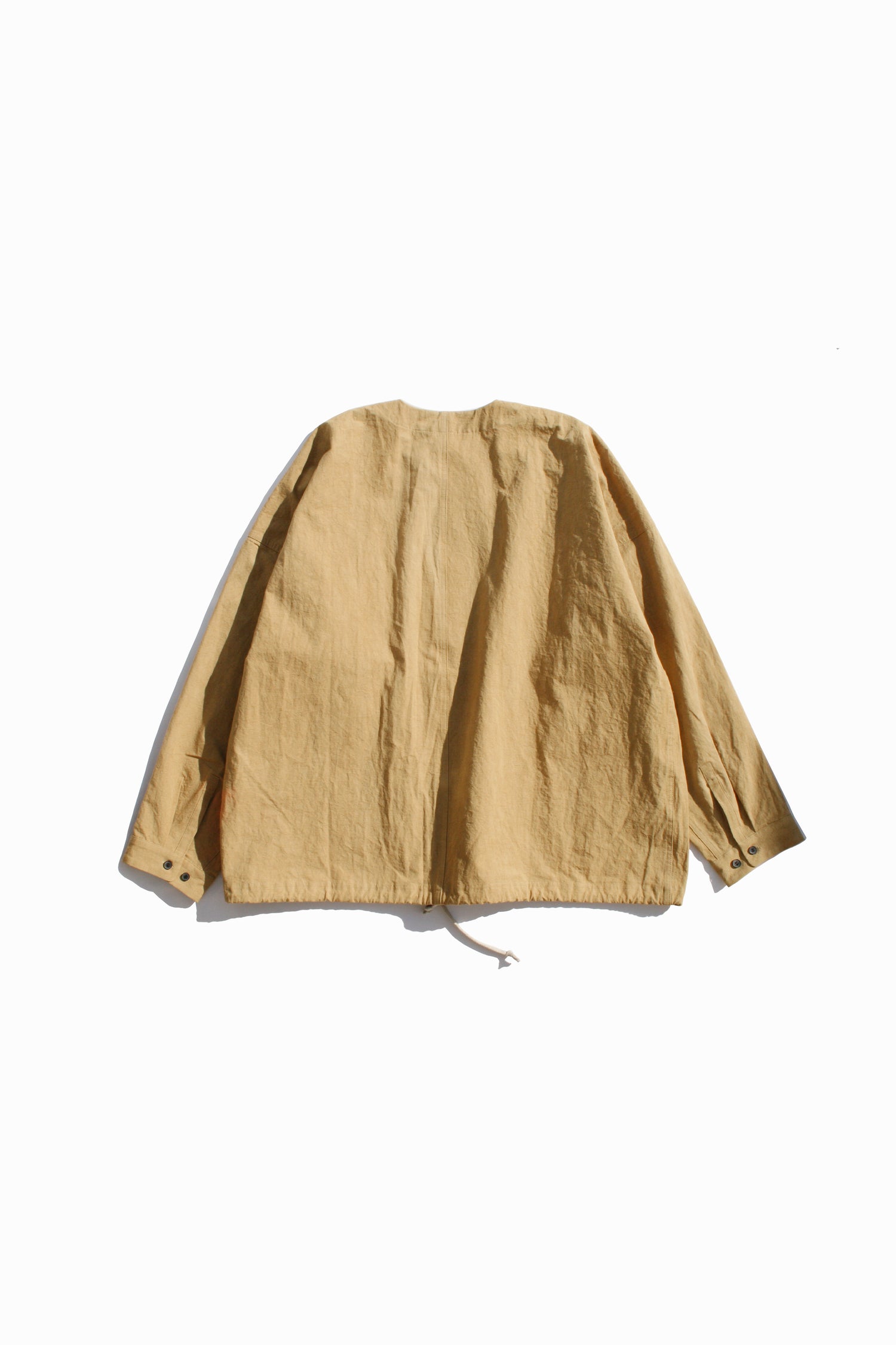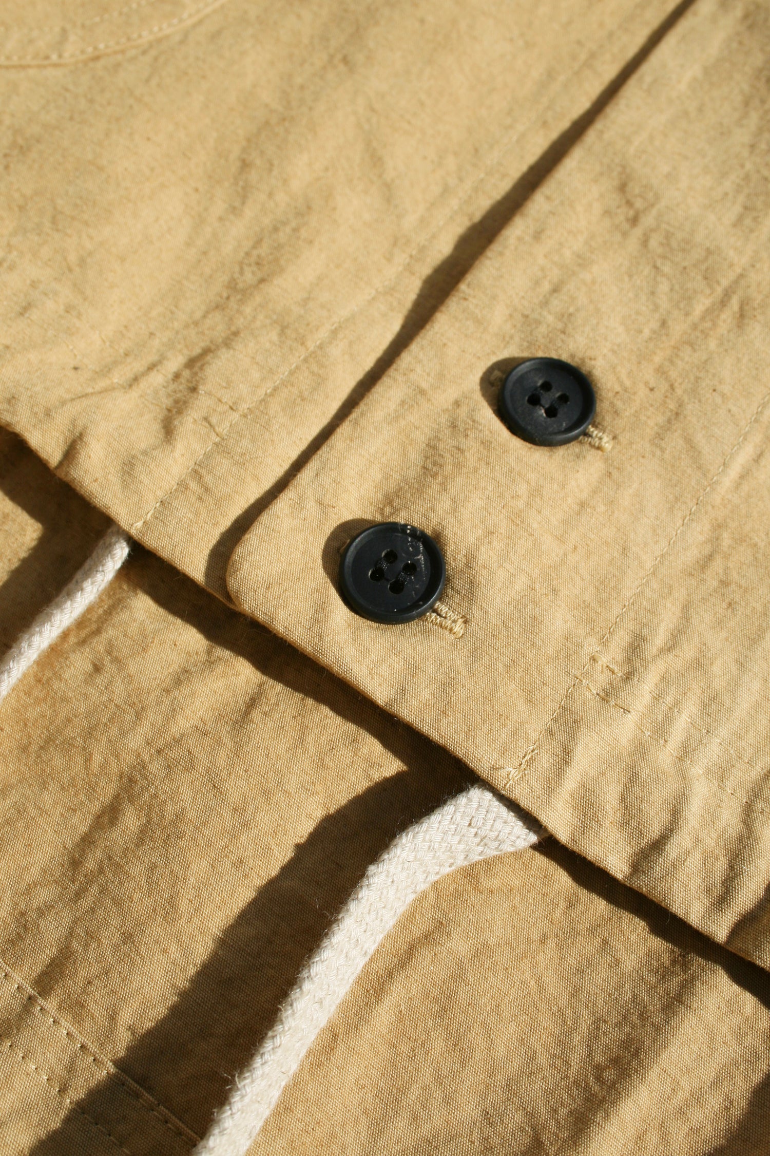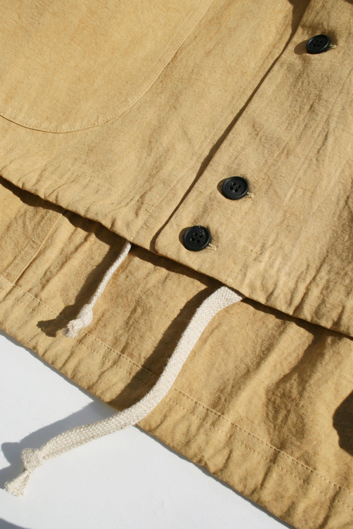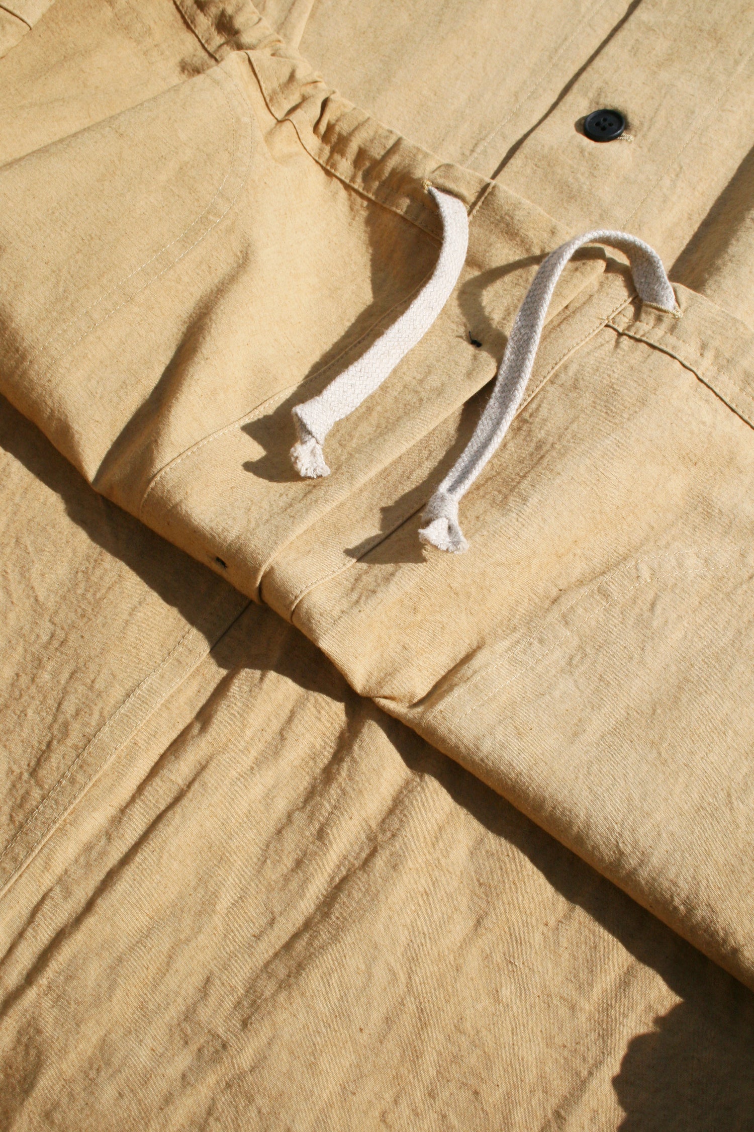 Classic COVERALL SHIRT in mustard. Crafted from a blend of cotton and linen, it's soft and a little wrinkled for a casual vibe. Featuring hand pockets, no-collar and a loose fit that keeps you comfortable all day. A noble outwear piece.