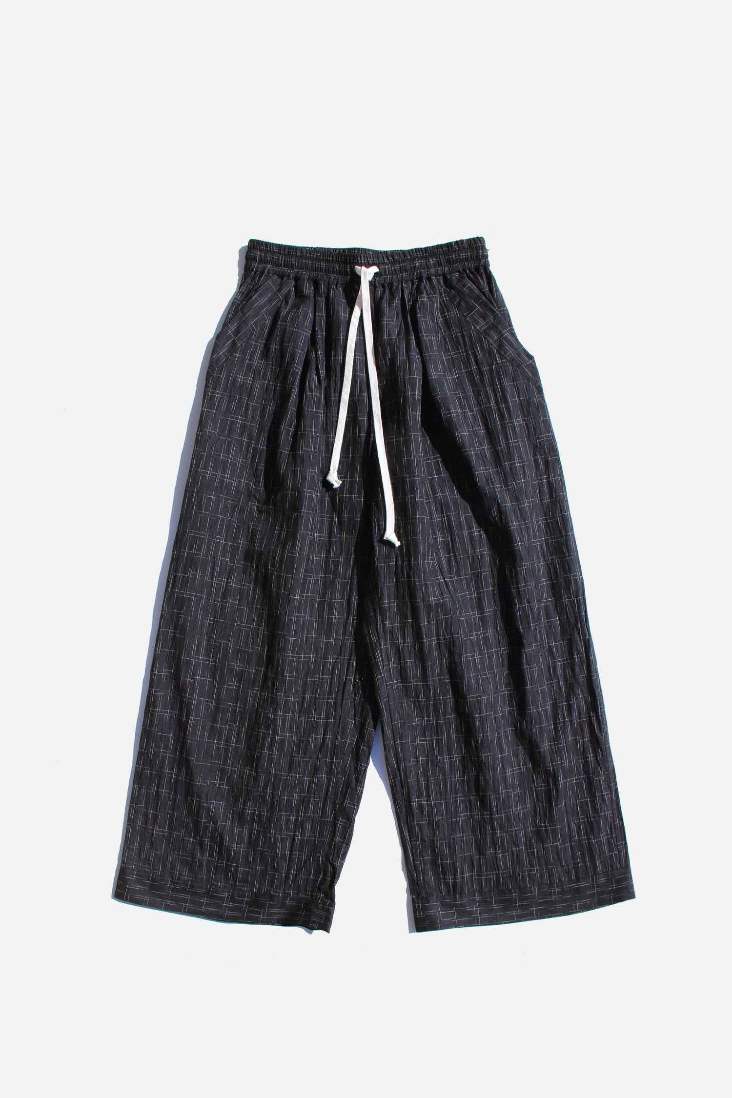 DETAILSWide pants made using a linen and cotton blend and finished with an all-over kasuri pattern. Incredibly soft and comfortable fabric to ward off electromagnetic waves. Unisex. This is Black.