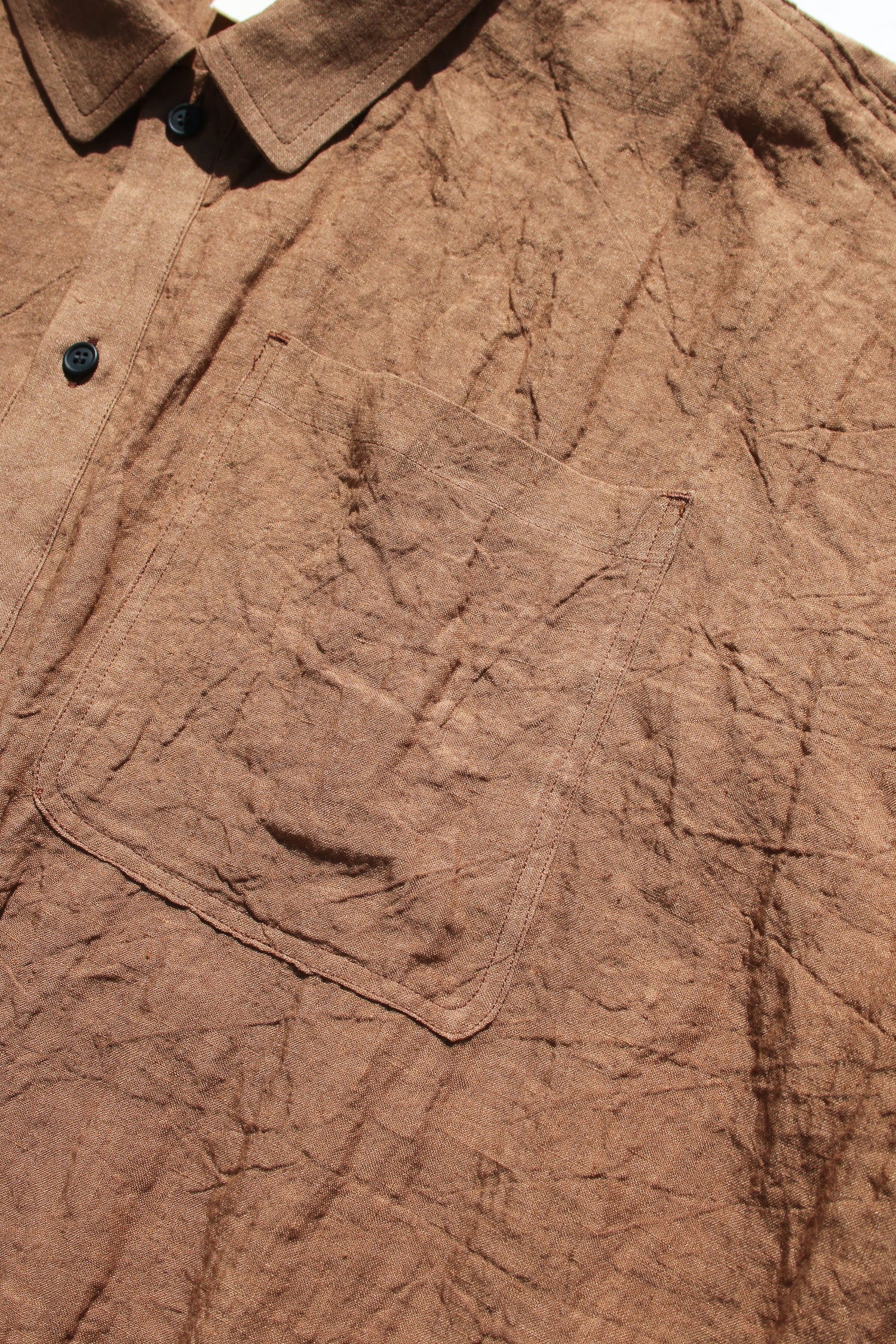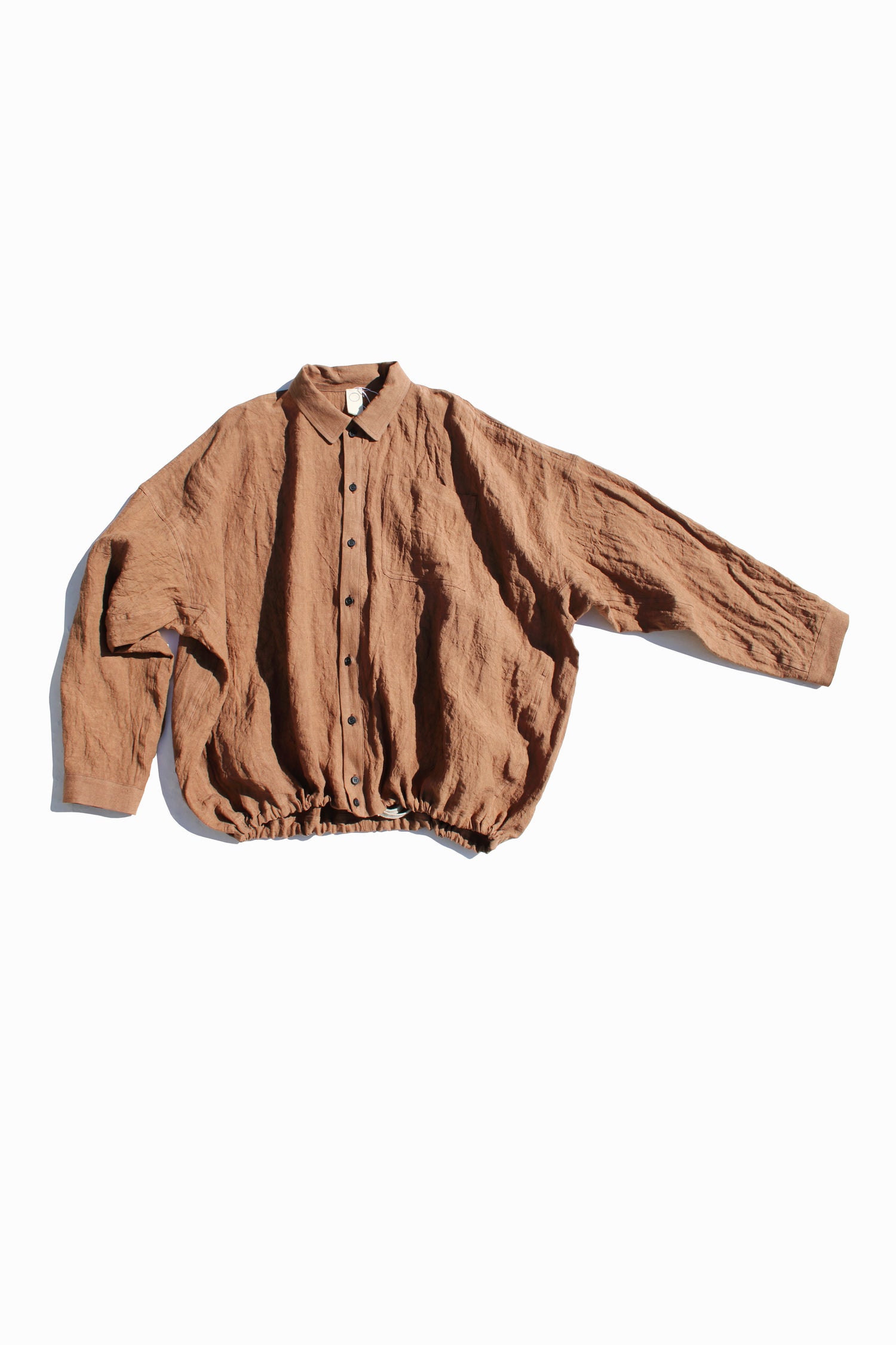 DETAILSAntwerp urban aesthetics mixed with Eastern influences. Loose bomber shirt in new form, crafted from ultra soft linen (A potential fabric that blocks electromagnetic waves.), with kakishibu dyed finish (persimmon warm brown reflecting the nature of life). It's completed with a chest pocket and drawcord on the hem. The use of original Japanese dyeing techniques gives the whole an extra mystic dimension. Pair it with wide pants for a complete look.