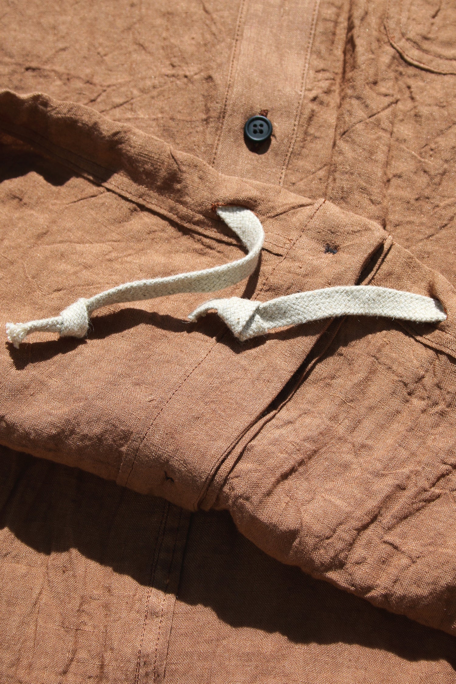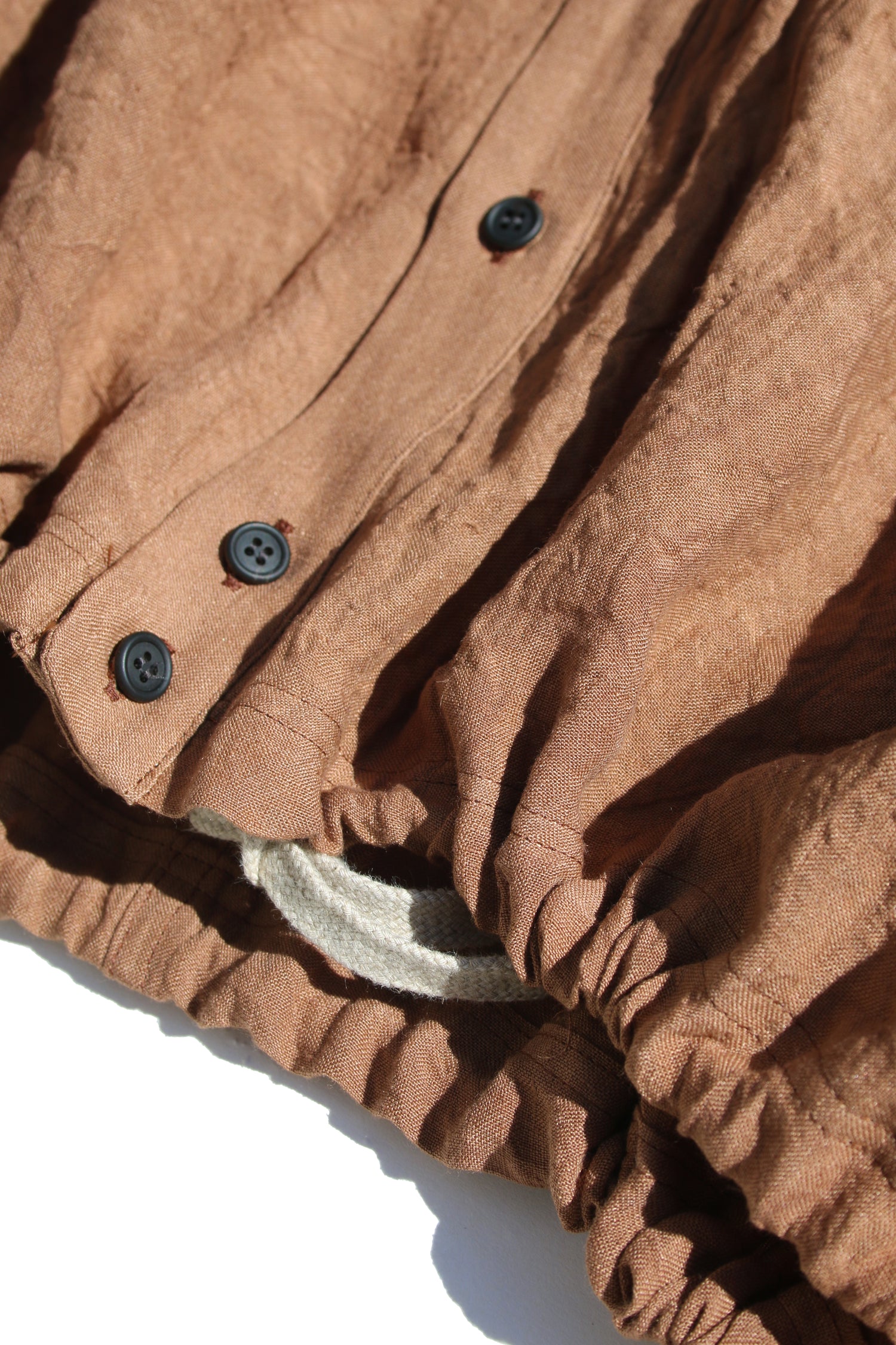 Antwerp urban aesthetics mixed with Eastern influences. Loose bomber shirt in new form, crafted from ultra soft linen (A potential fabric that blocks electromagnetic waves.), with kakishibu dyed finish (persimmon warm brown reflecting the nature of life). It's completed with a chest pocket and drawcord on the hem. The use of original Japanese dyeing techniques gives the whole an extra mystic dimension. Pair it with wide pants for a complete look.