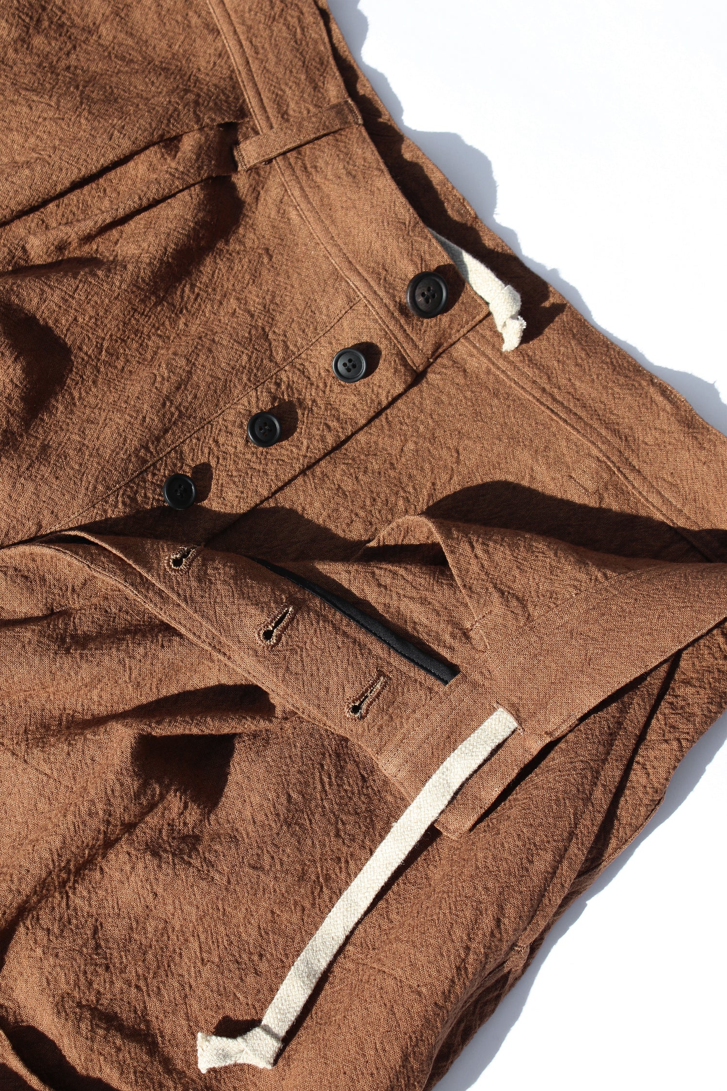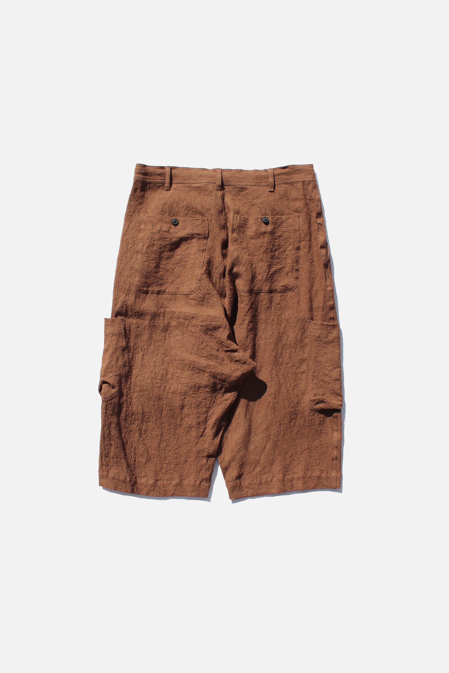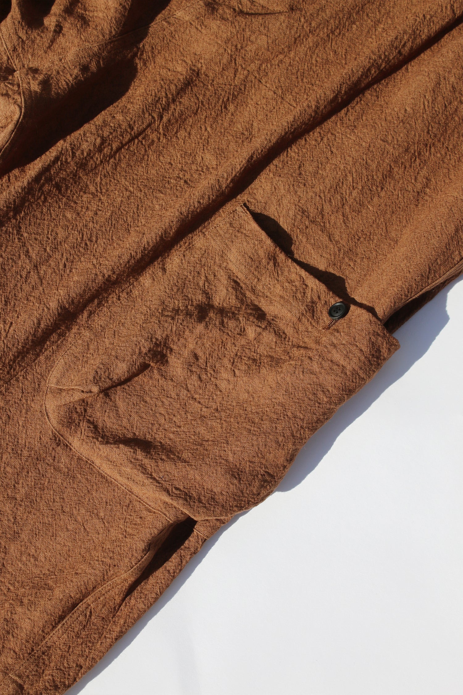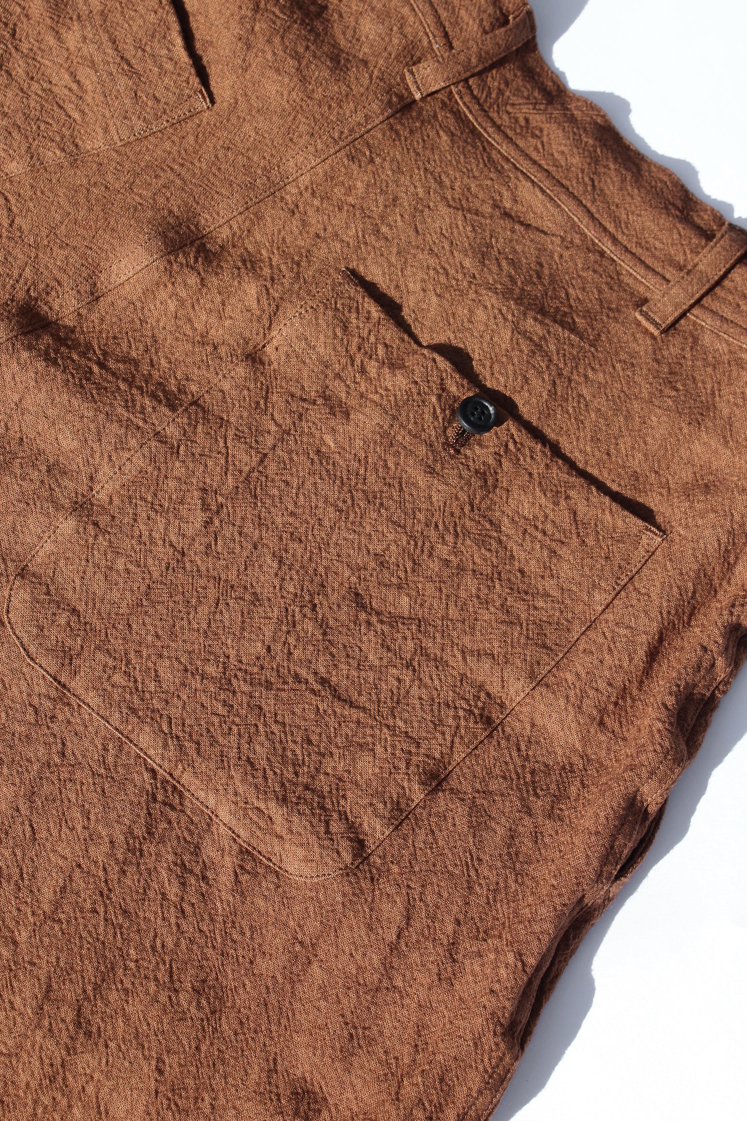リネン素材のクロップド丈のカーゴパンツを柿渋染めしました。100%リネン素材を使用し、清涼感のある肌触りがポイントです。リネンは、通気性があり、汗をよく吸い、乾きも良い、日本の春夏には最適な素材です。両サイドにカーゴポケット、ウエストはインナードローコードとゴムで仕様になります。