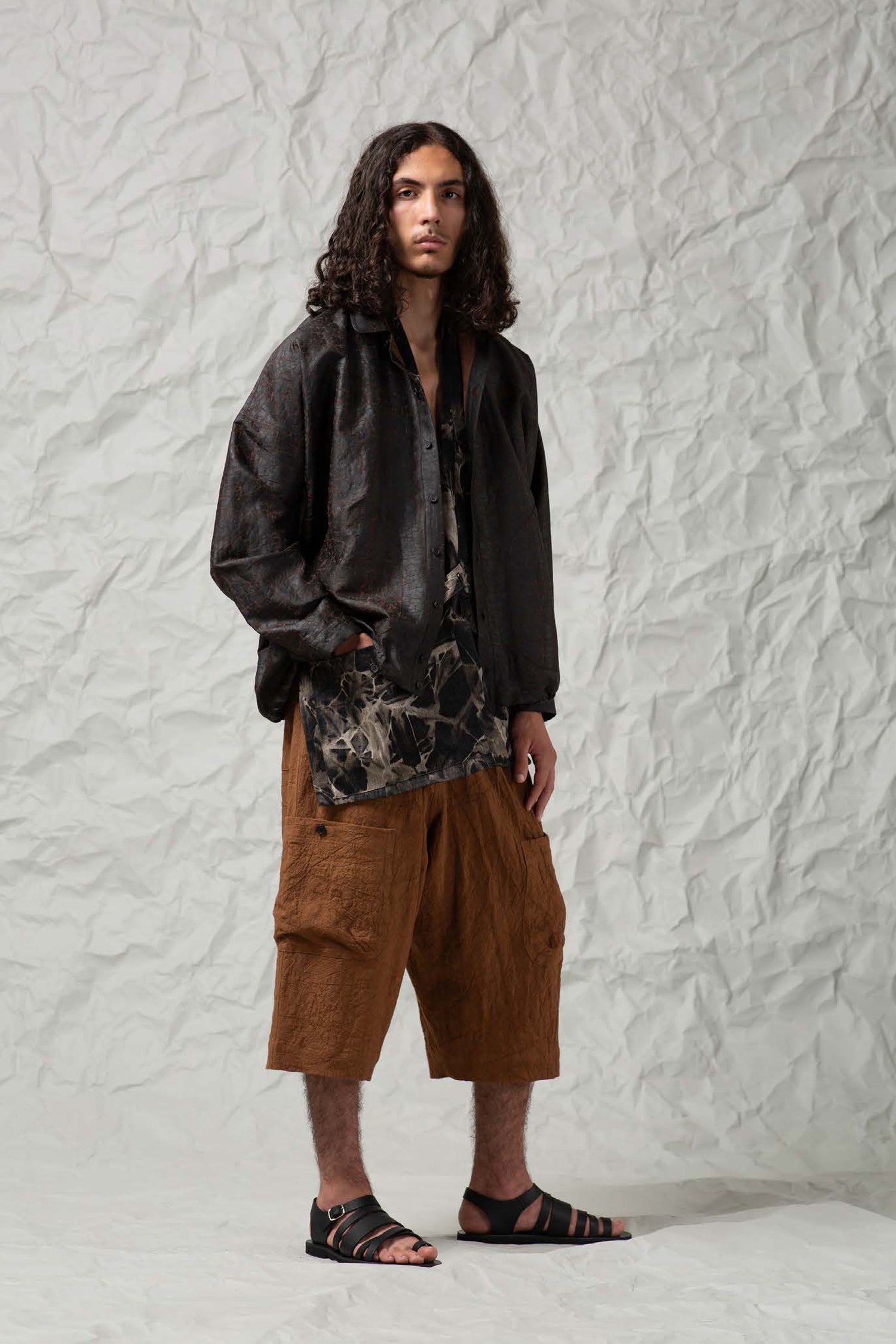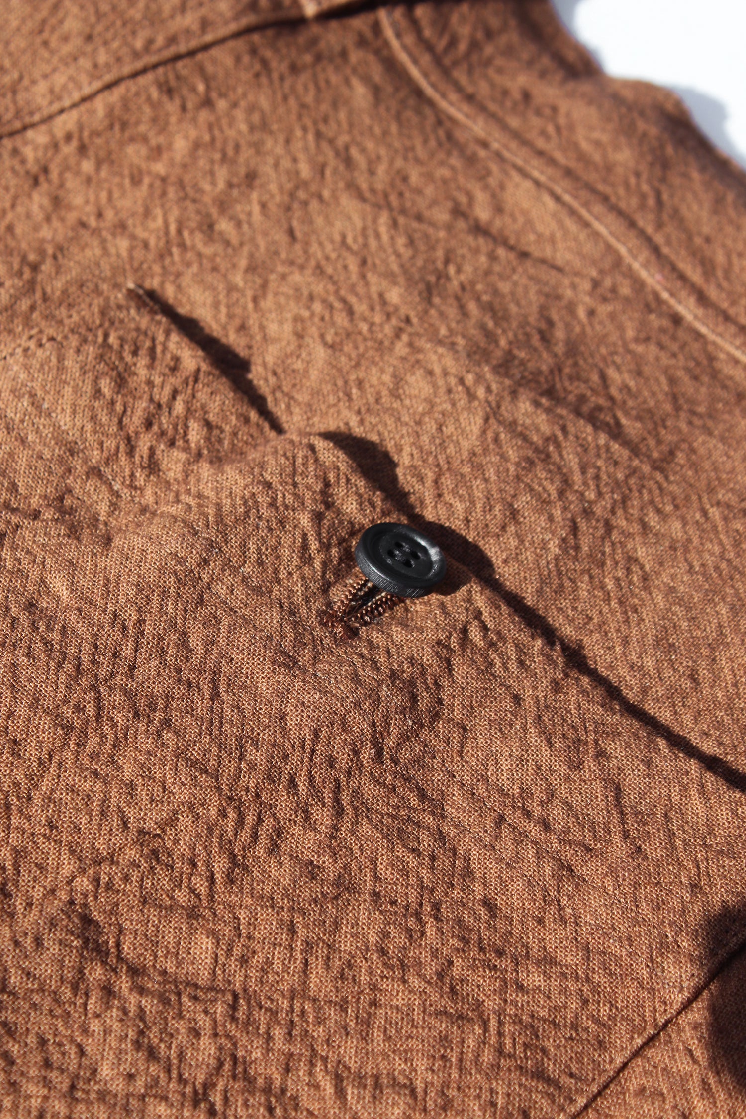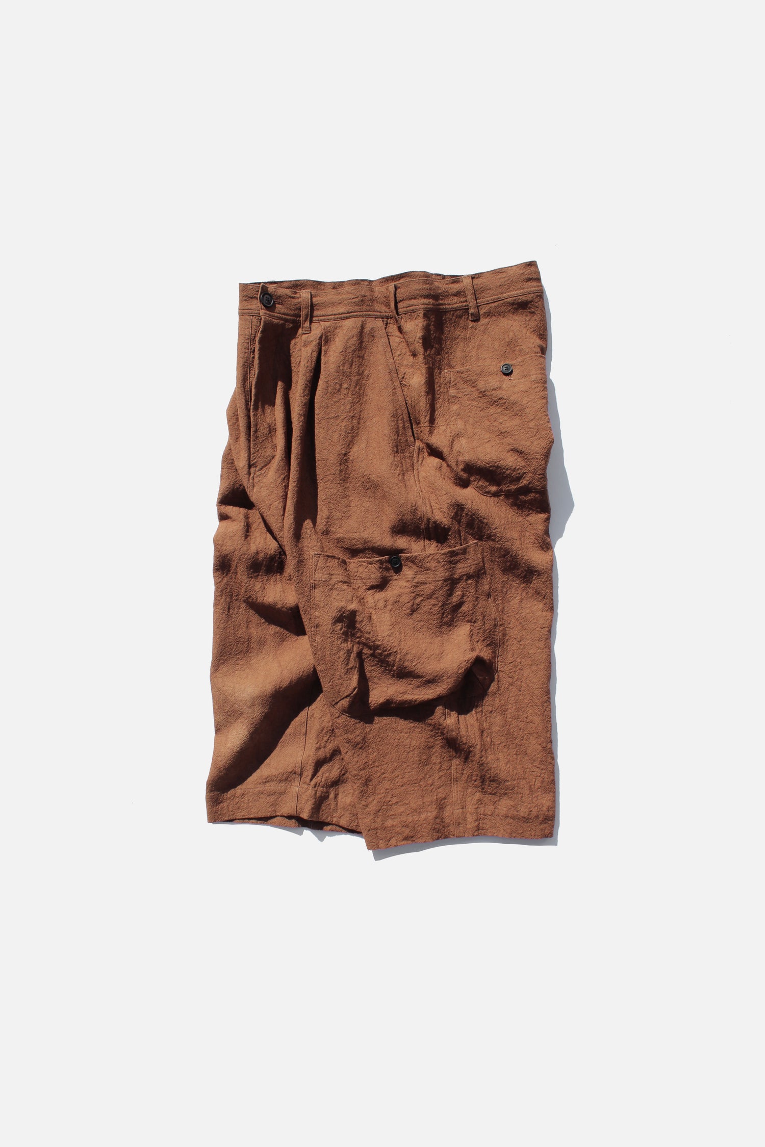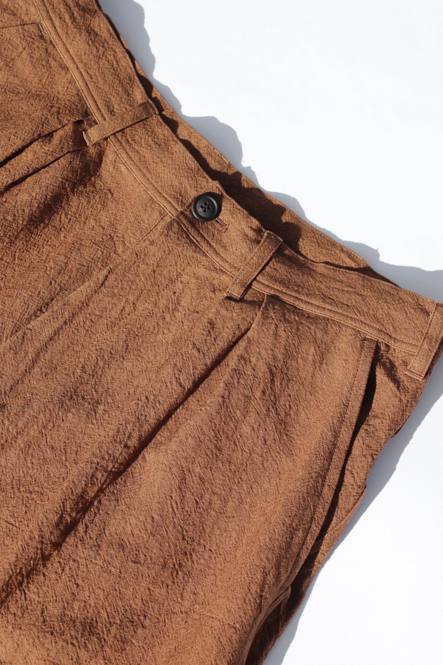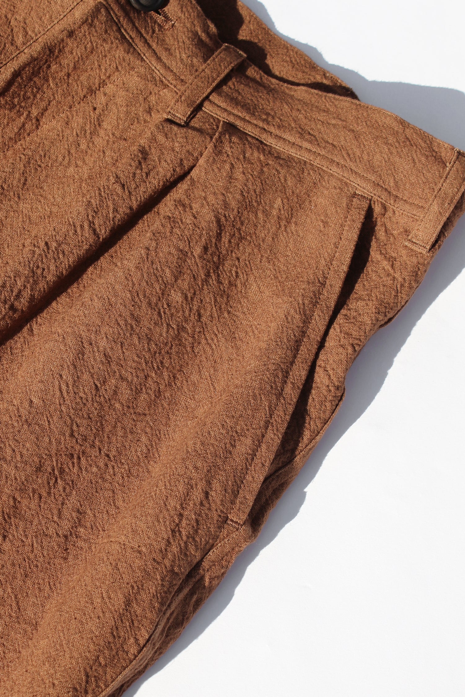 リネン素材のクロップド丈のカーゴパンツを柿渋染めしました。100%リネン素材を使用し、清涼感のある肌触りがポイントです。リネンは、通気性があり、汗をよく吸い、乾きも良い、日本の春夏には最適な素材です。両サイドにカーゴポケット、ウエストはインナードローコードとゴムで仕様になります。
